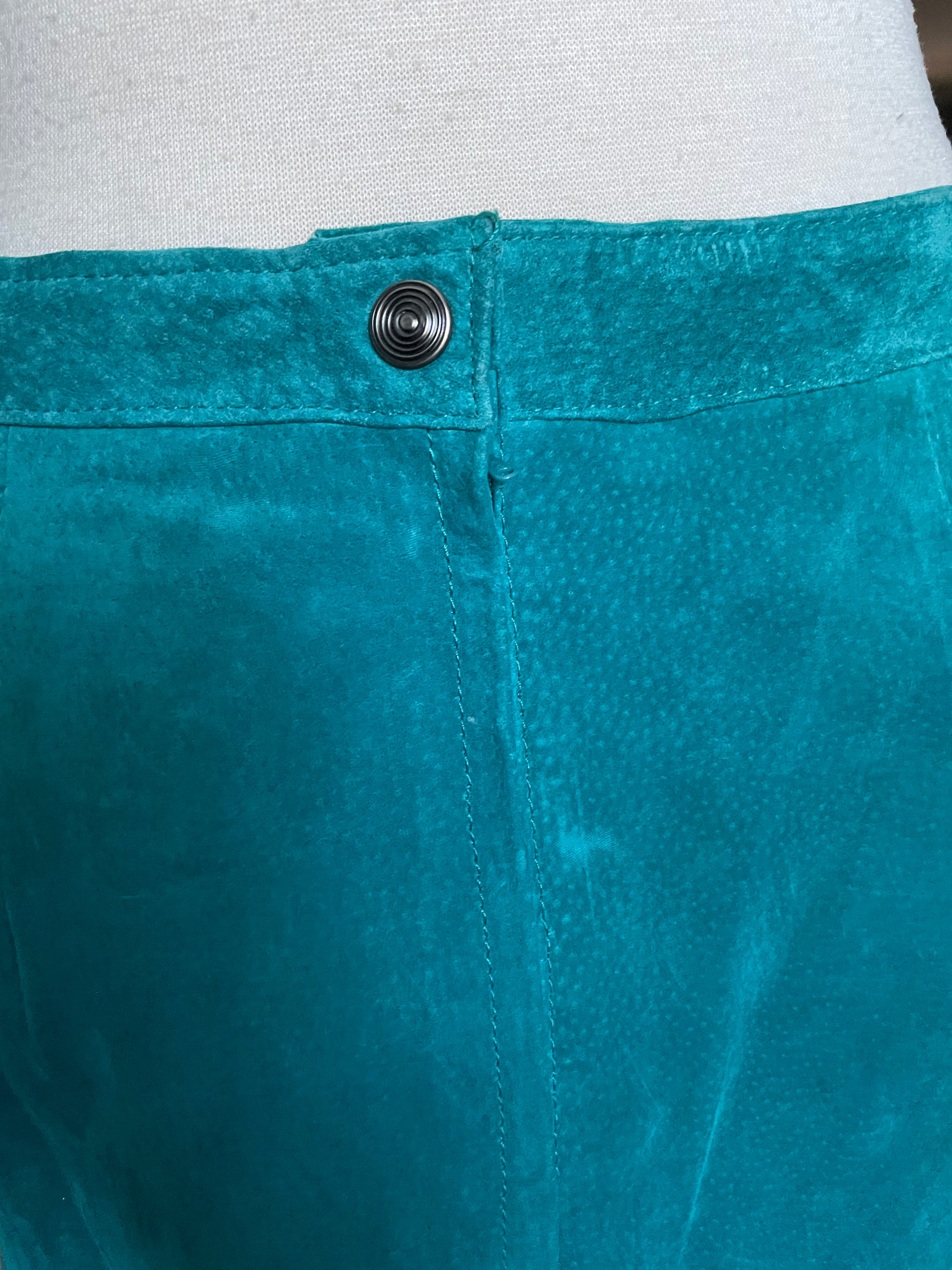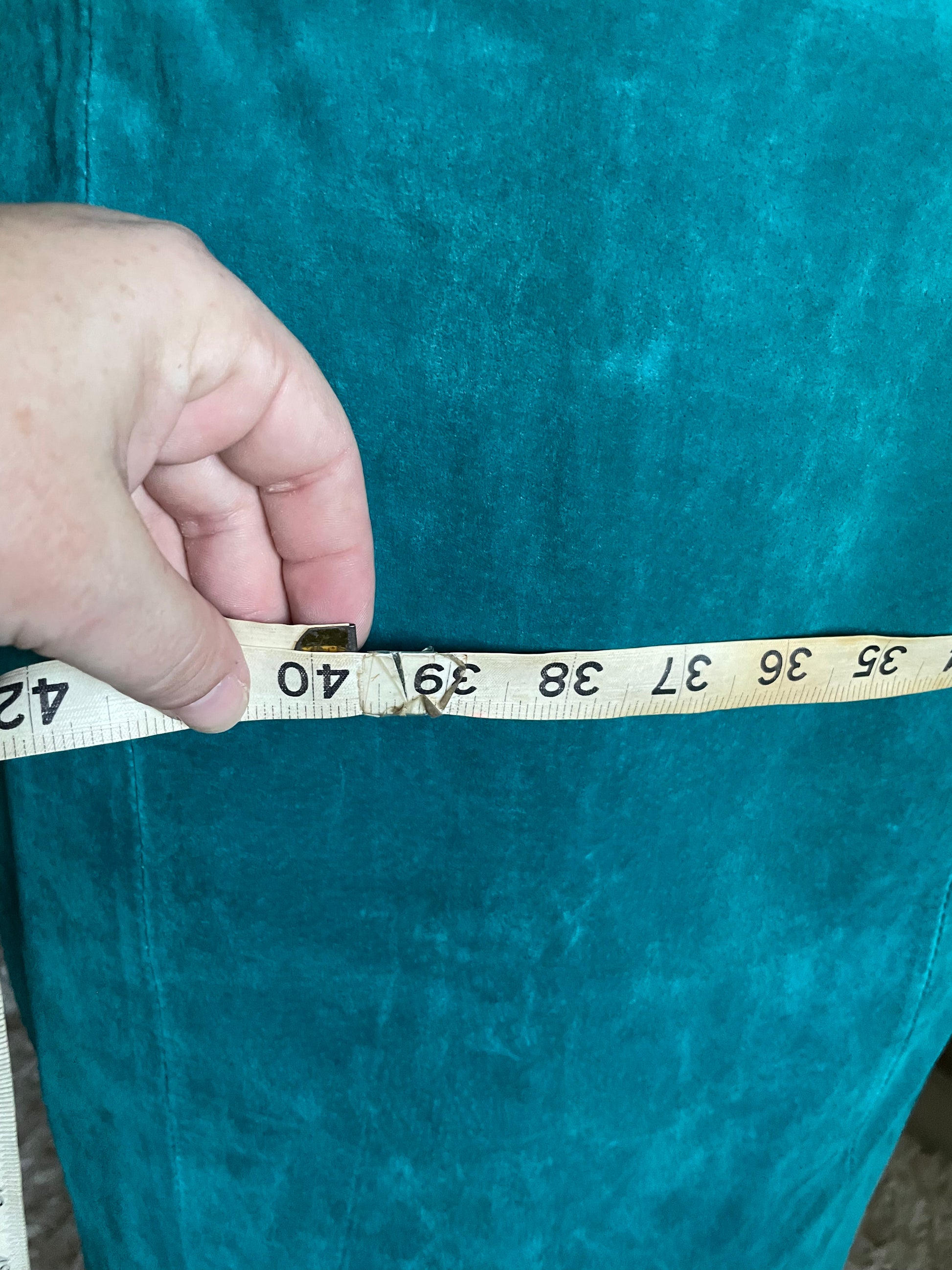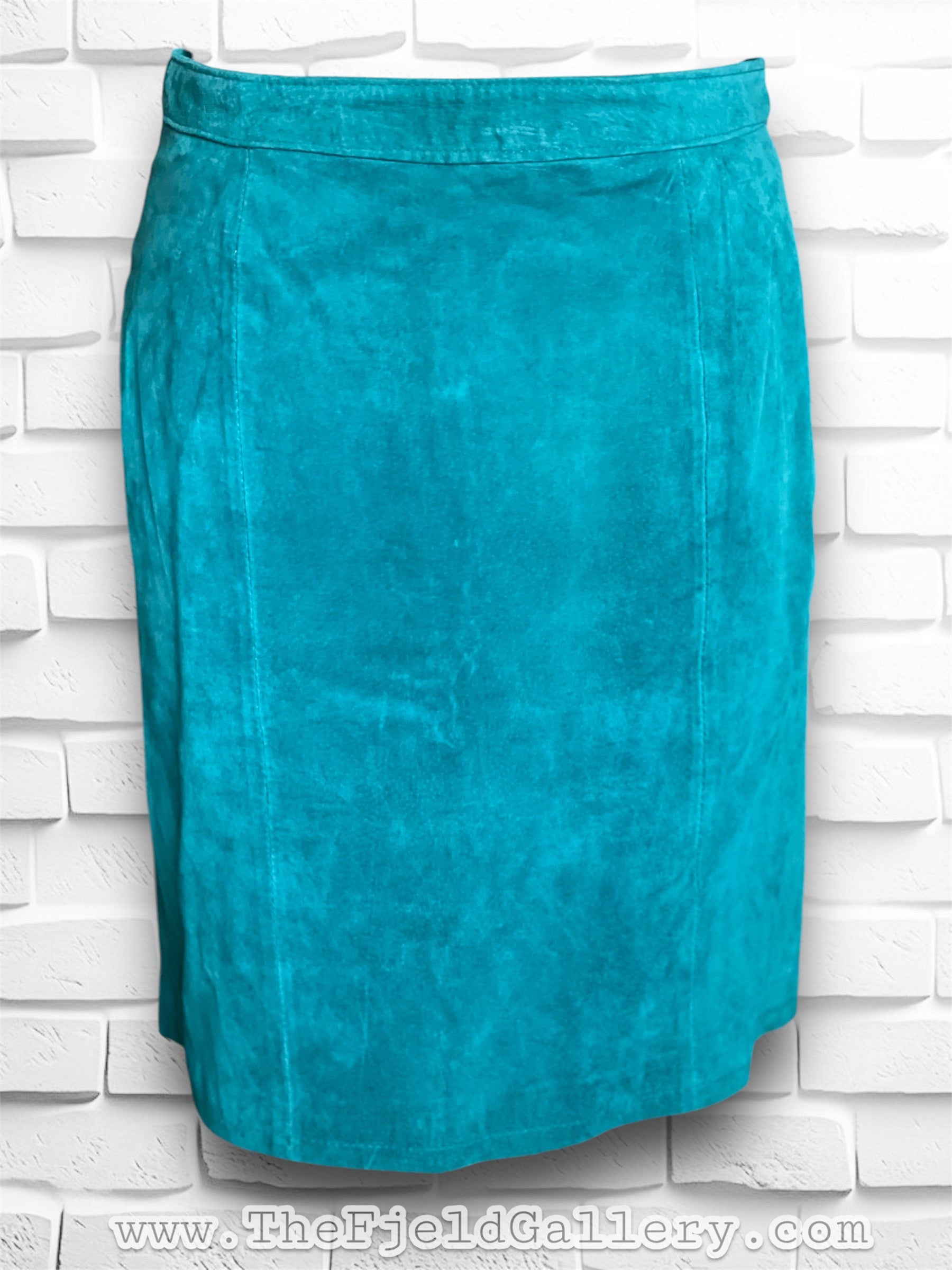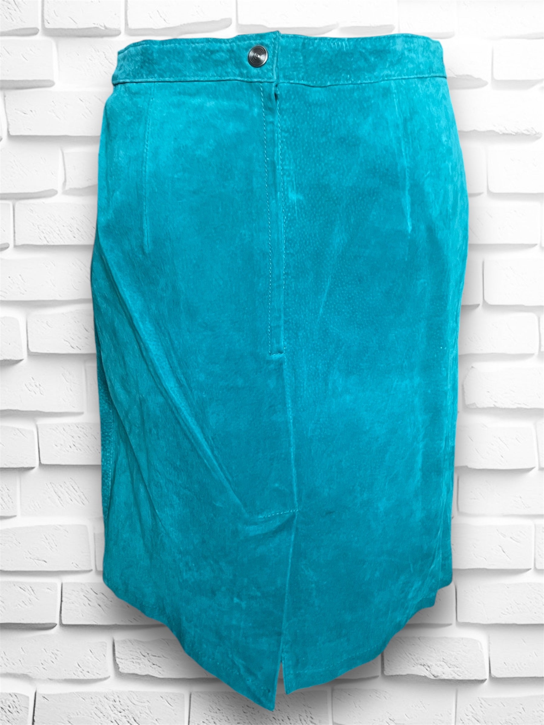 Gorgeous vintage 1980’s teal blue suede leather mini pencil skirt. Tag reads “Global Identity / Leather G-III / Size 13/14 / Outer Shell 100% Leather / Lining 100% Nylon”