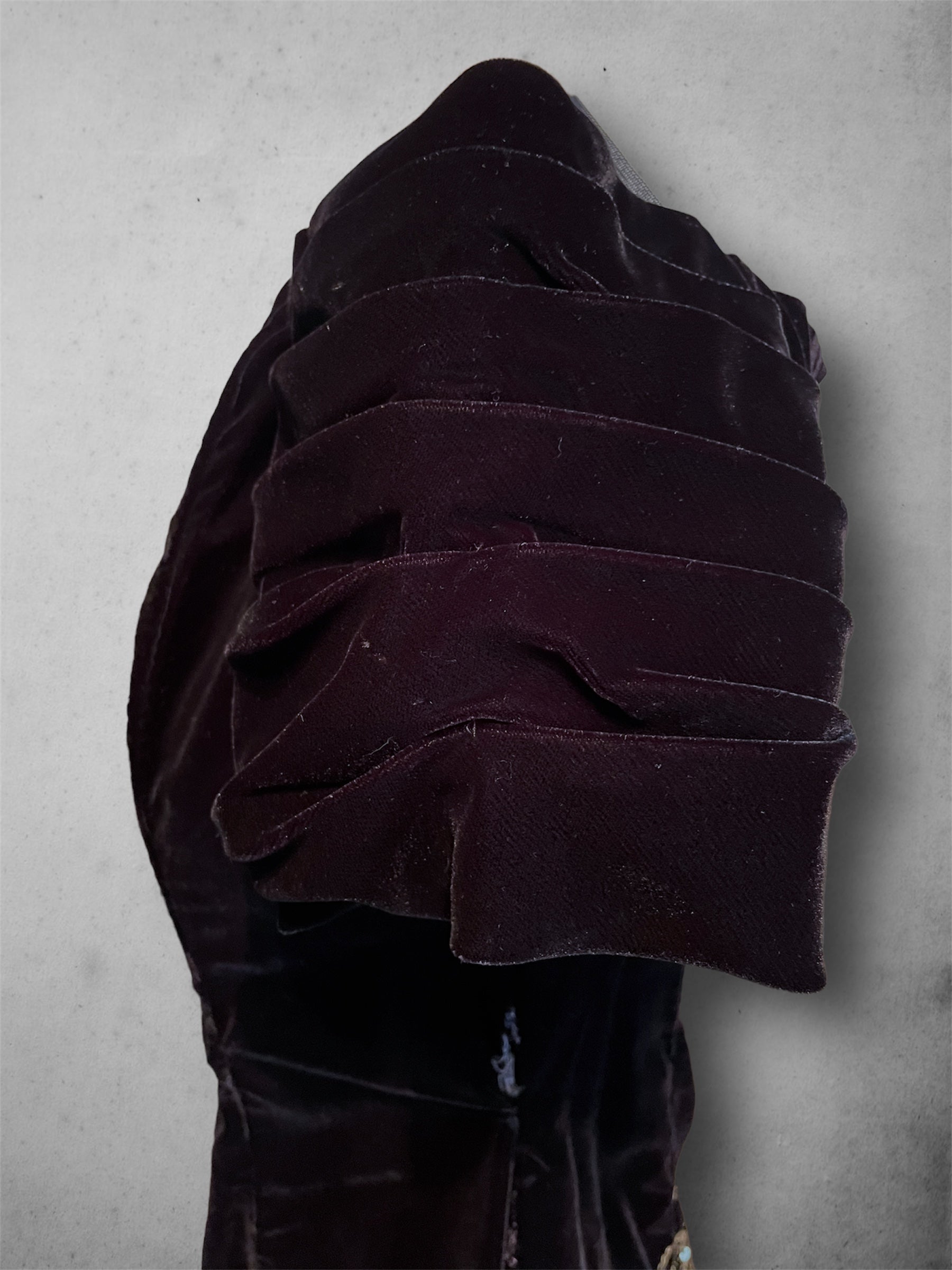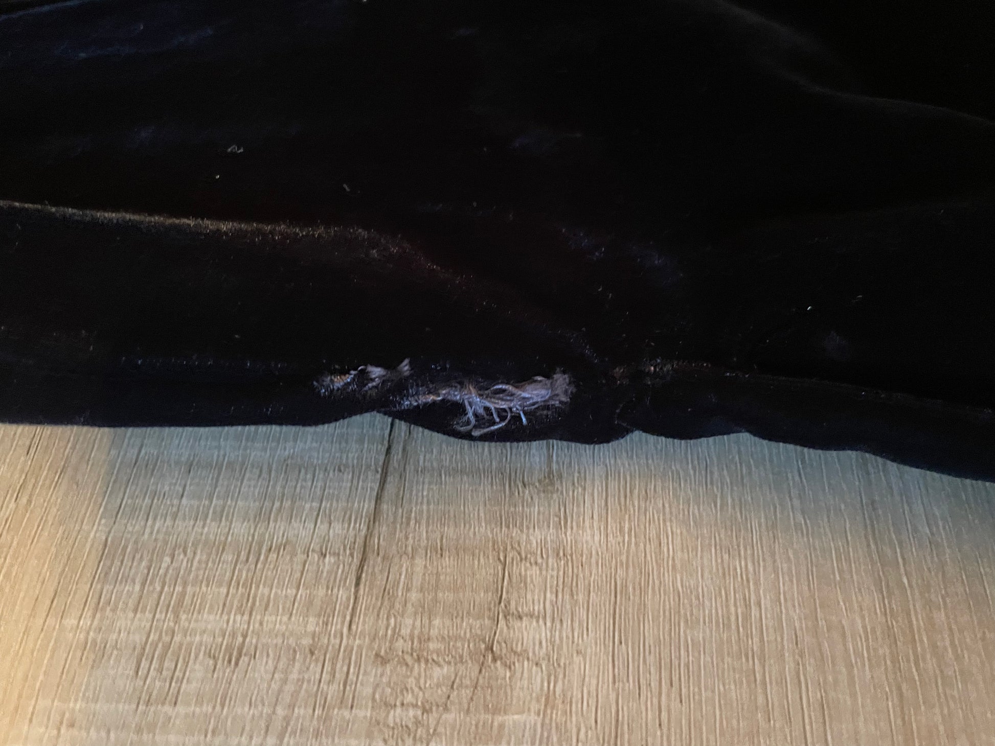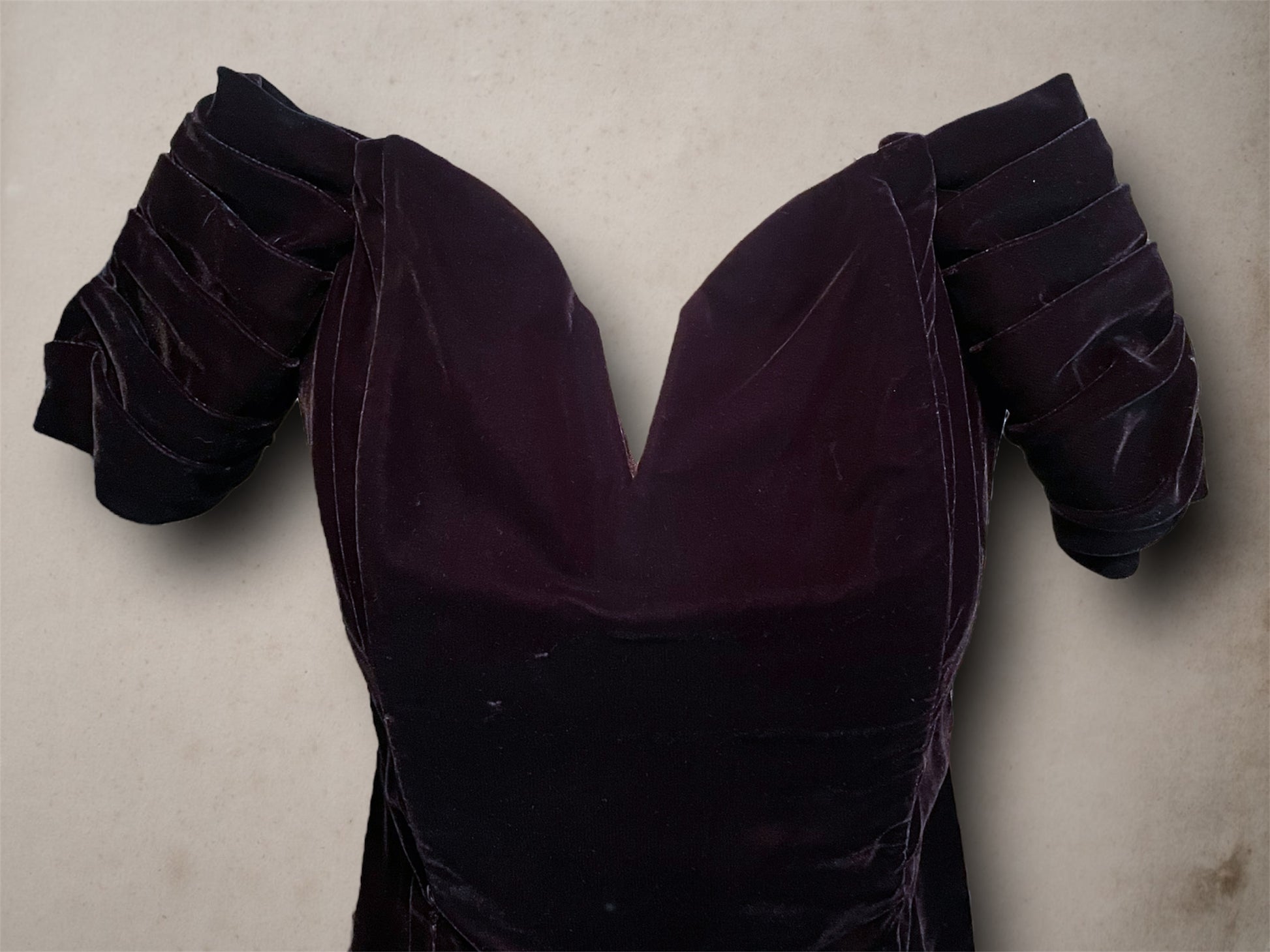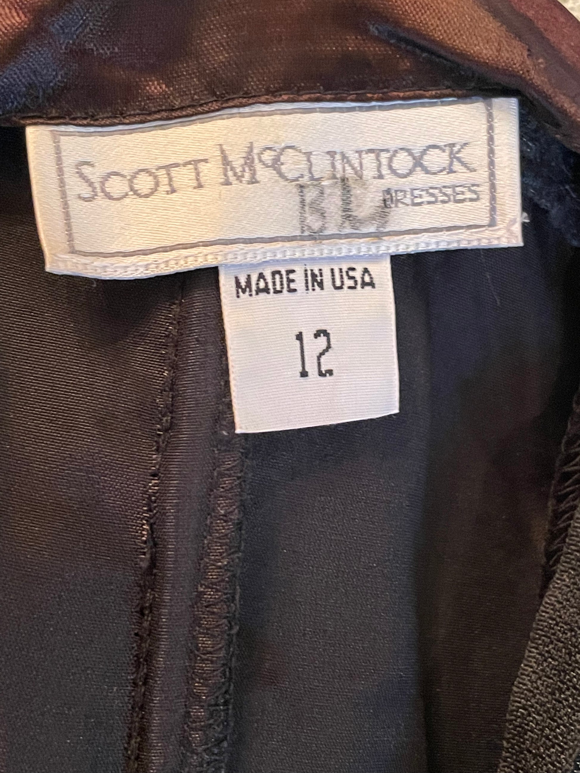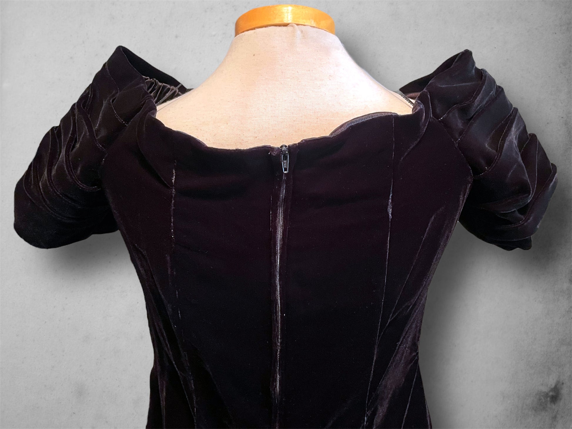 Beautiful vintage 1980’s off the shoulder black velvet party dress with gold sequin detailing and ruffled sleeves. Bodice has plastic boning, one piece of which is coming out of the seaming. Some small loose threading on seams shown in photos and easily fixed. Tags say designer brand is Scott McLintock size 12.