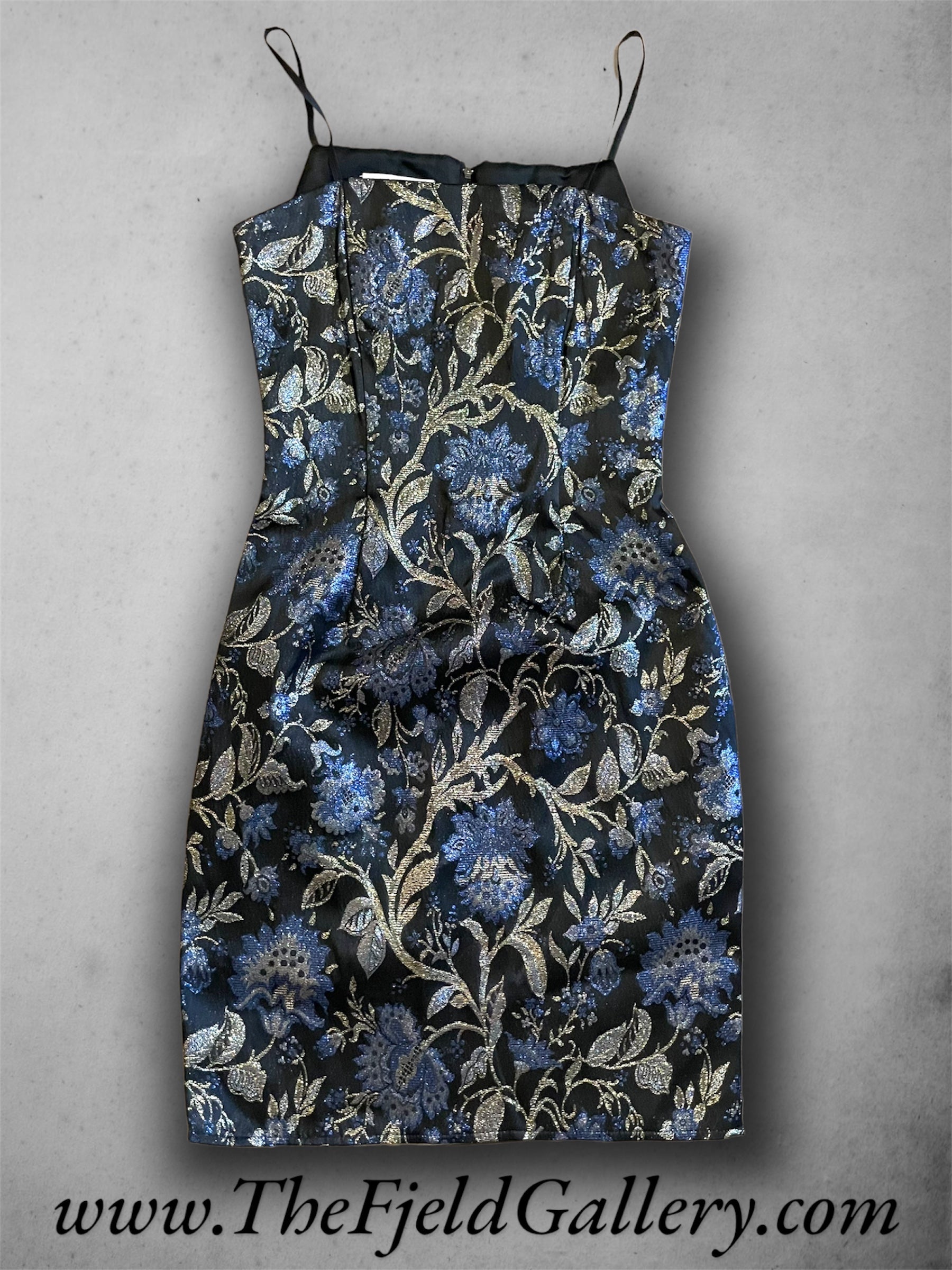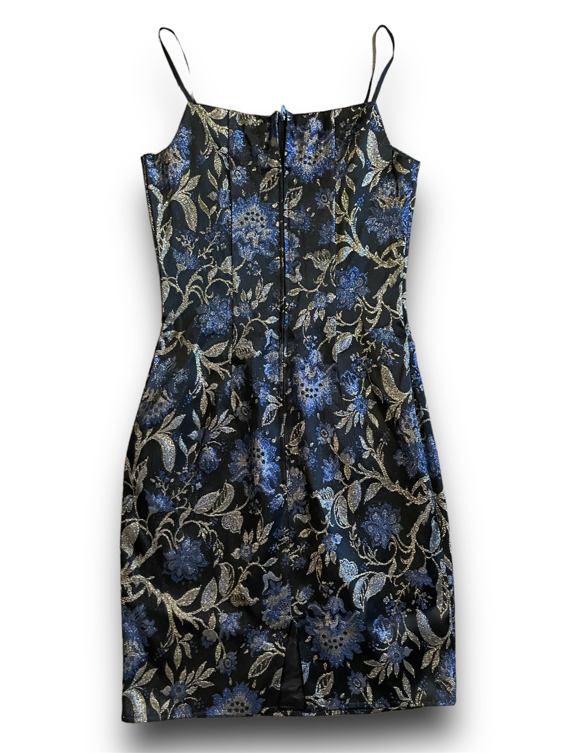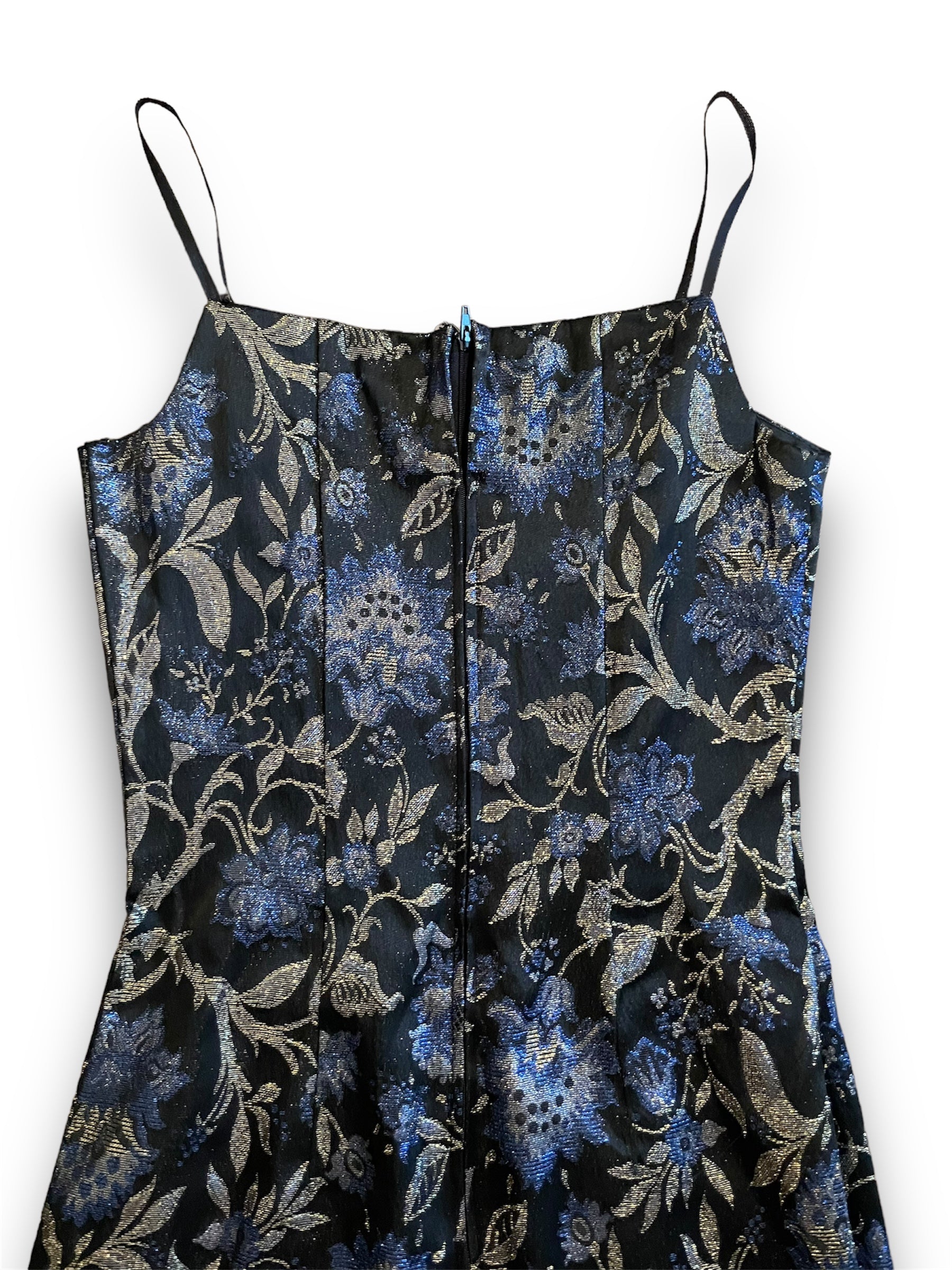 Beautiful vintage 1990’s Jessica McLintock black mini dress with spaghetti straps and metallic blue & gold floral print. Bodice has plastic boning. Tag says size 5/6 made in USA.
