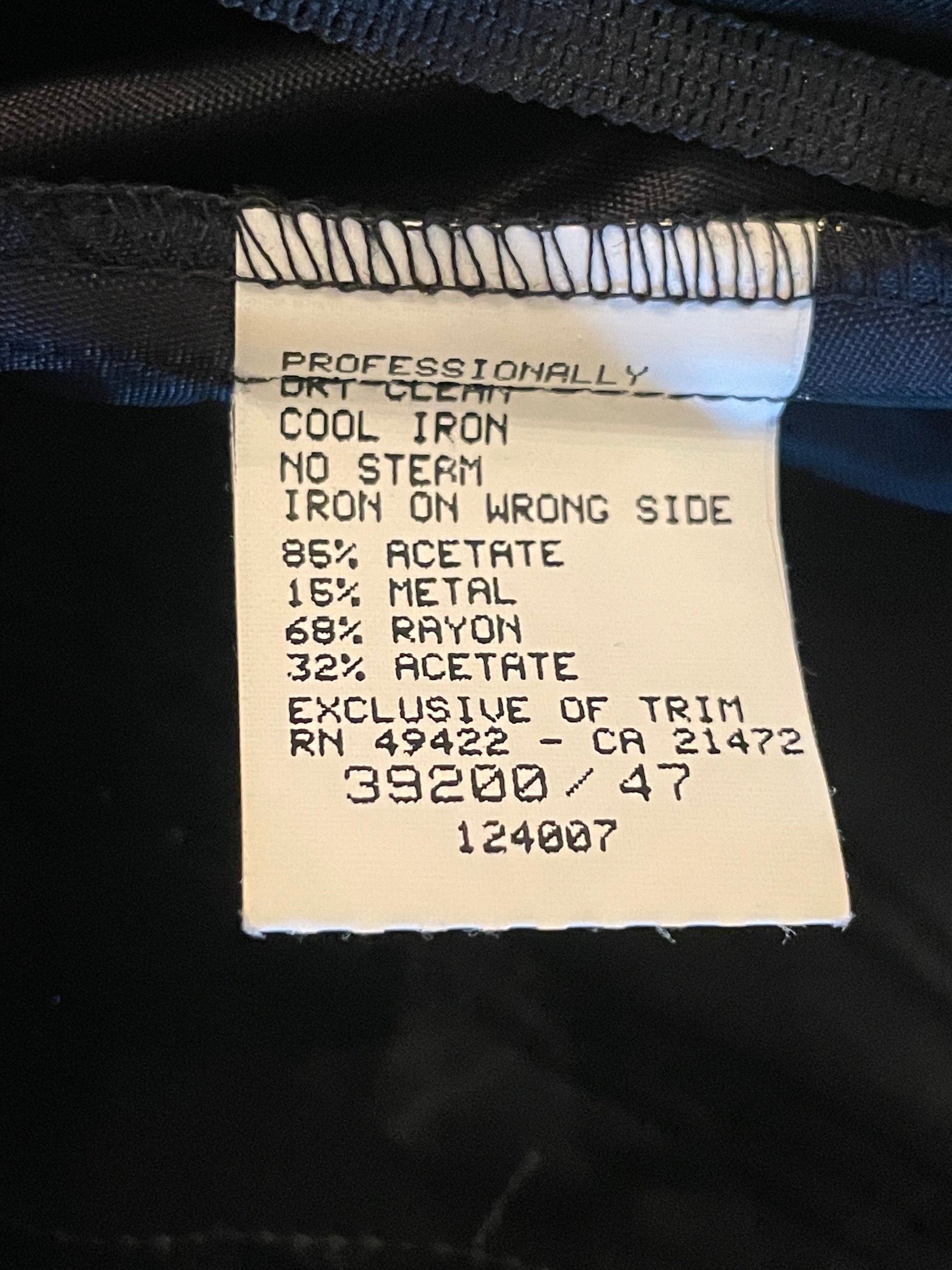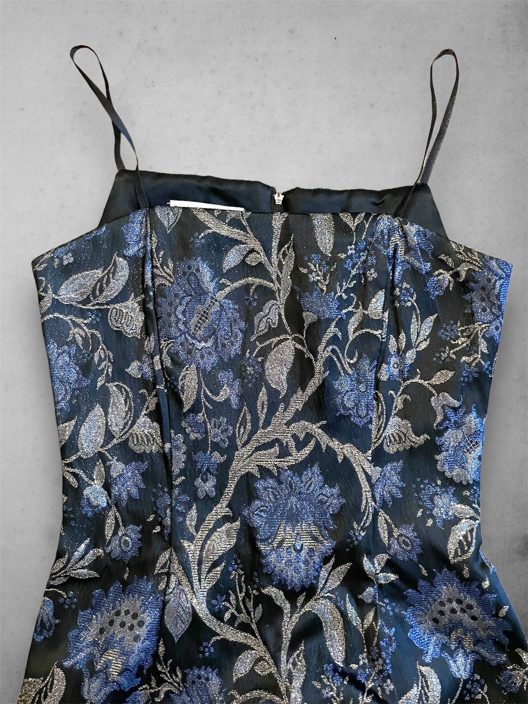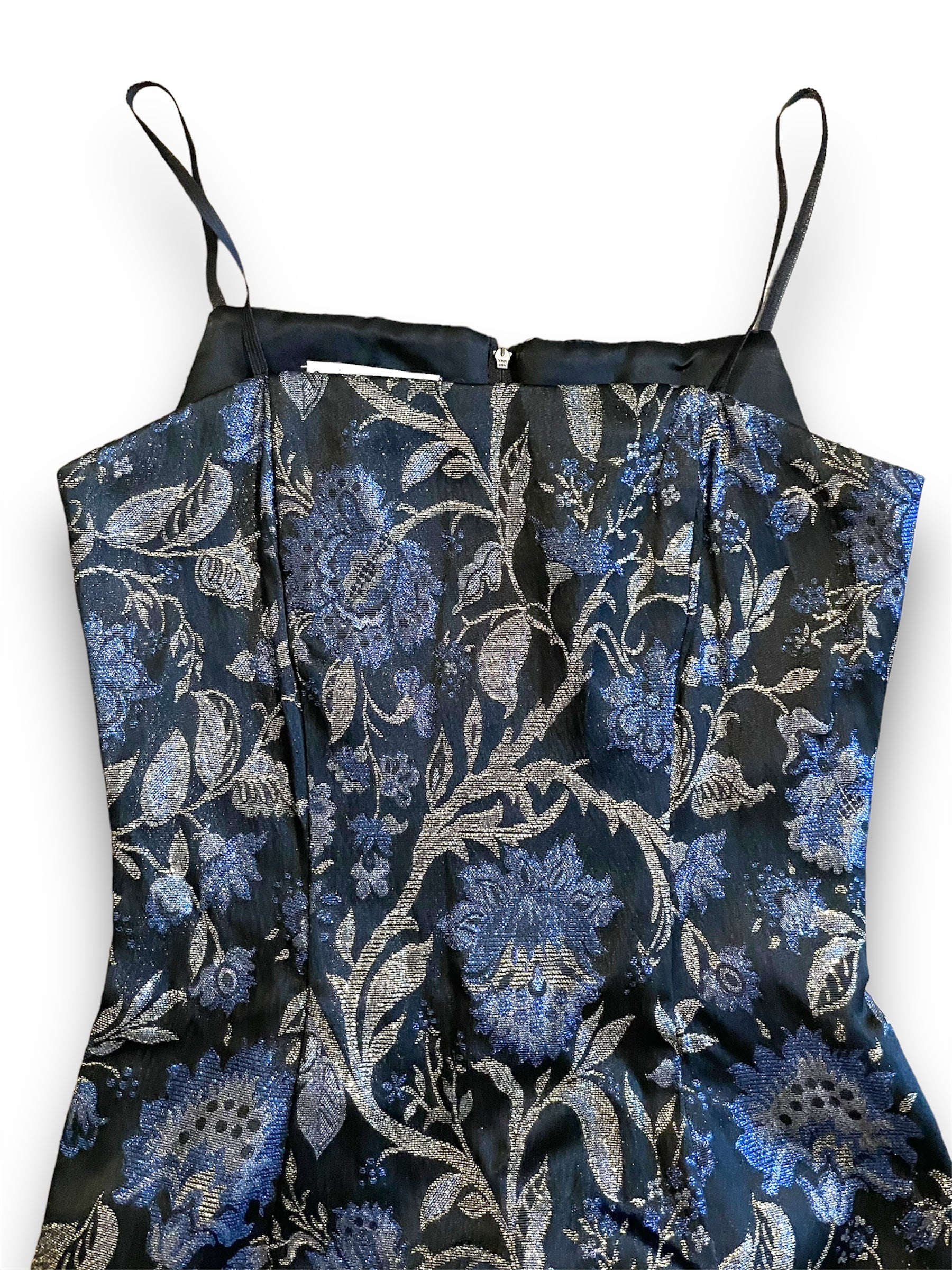 Beautiful vintage 1990’s Jessica McLintock black mini dress with spaghetti straps and metallic blue & gold floral print. Bodice has plastic boning. Tag says size 5/6 made in USA.