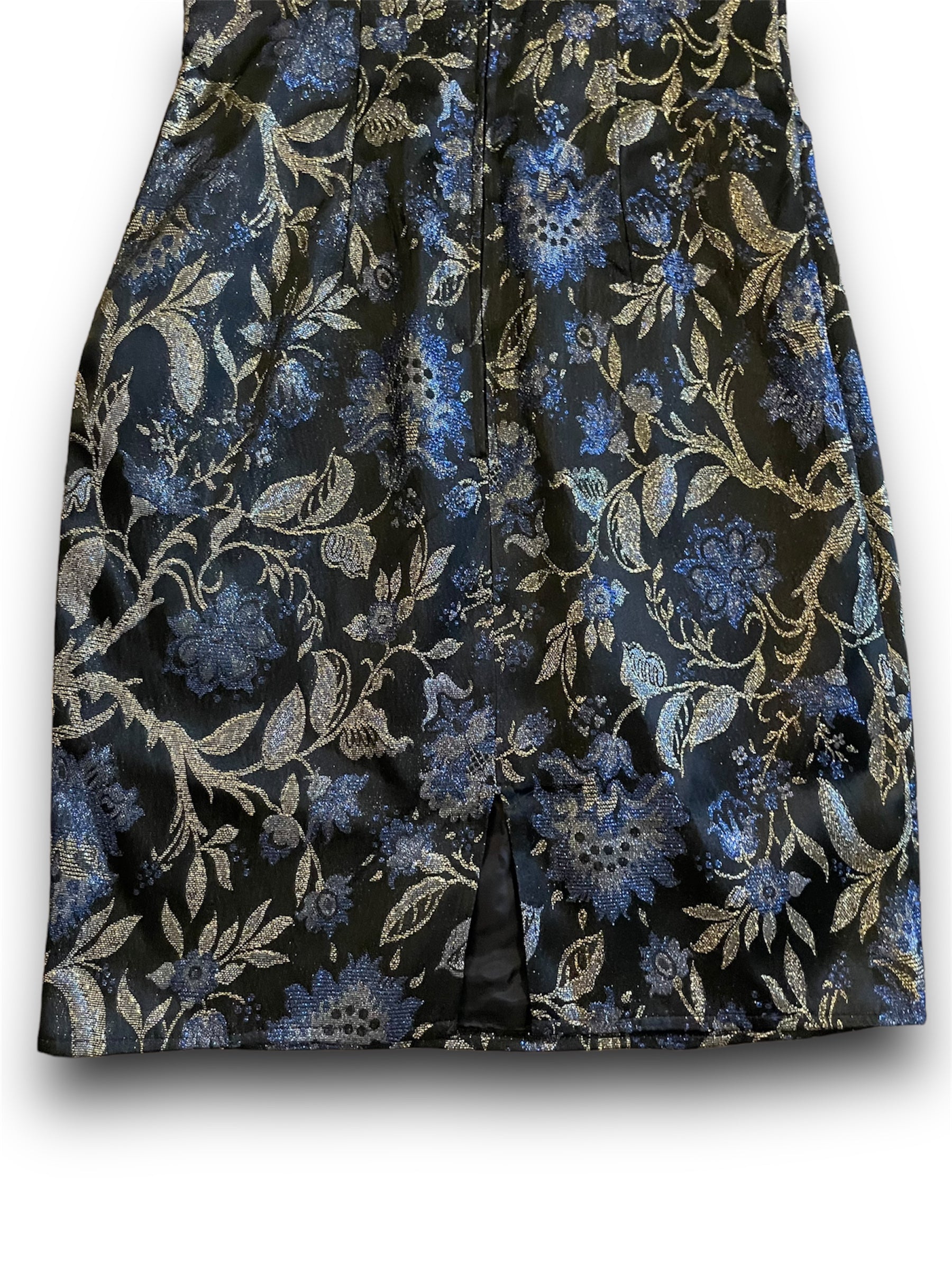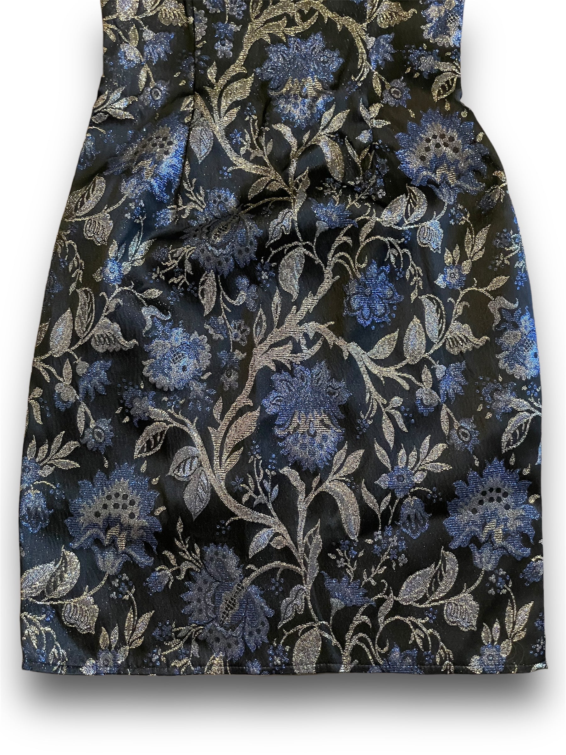 Vintage 1990’s Blue & Gold Floral Metallic Print Black Mini Dress