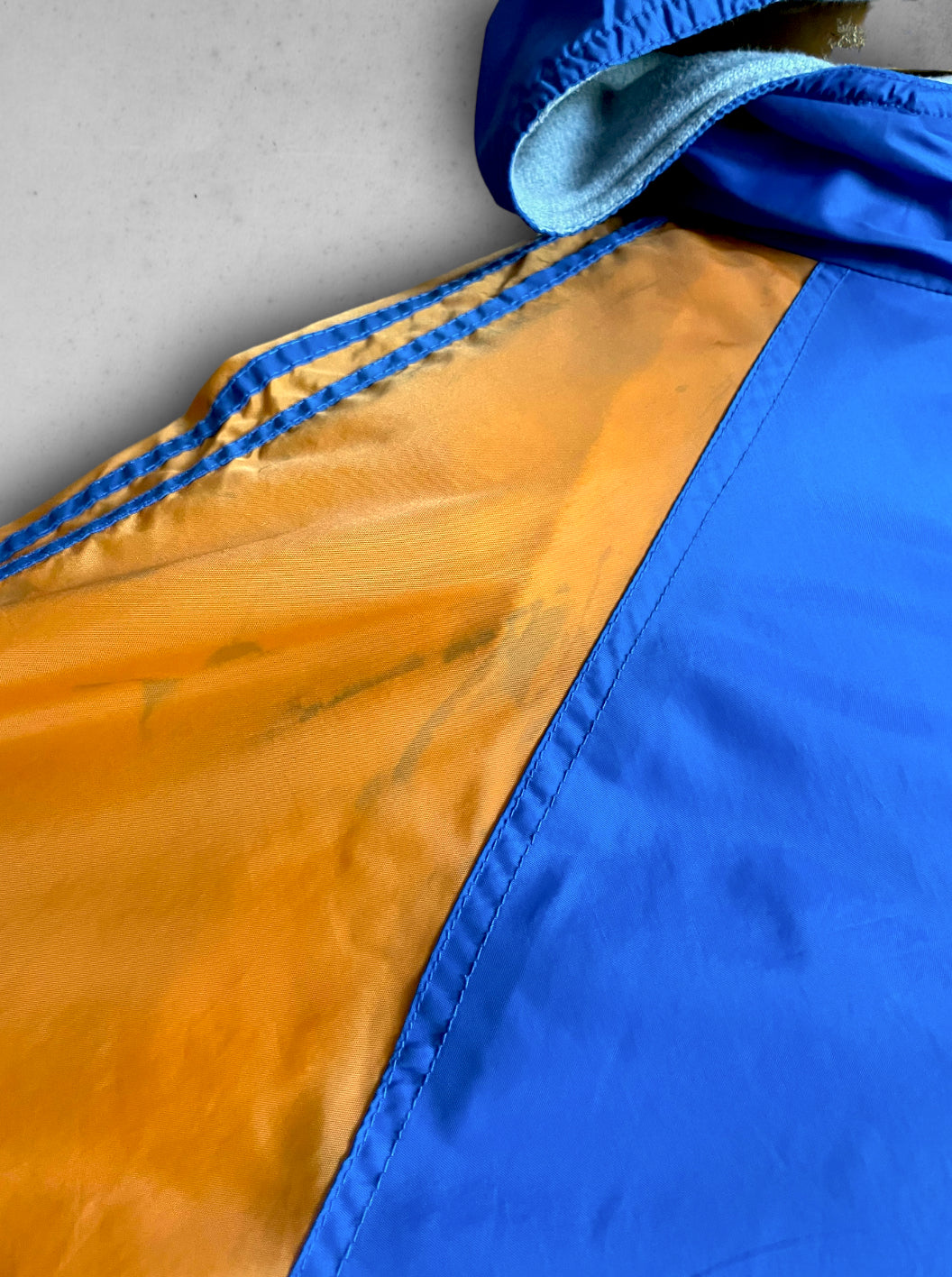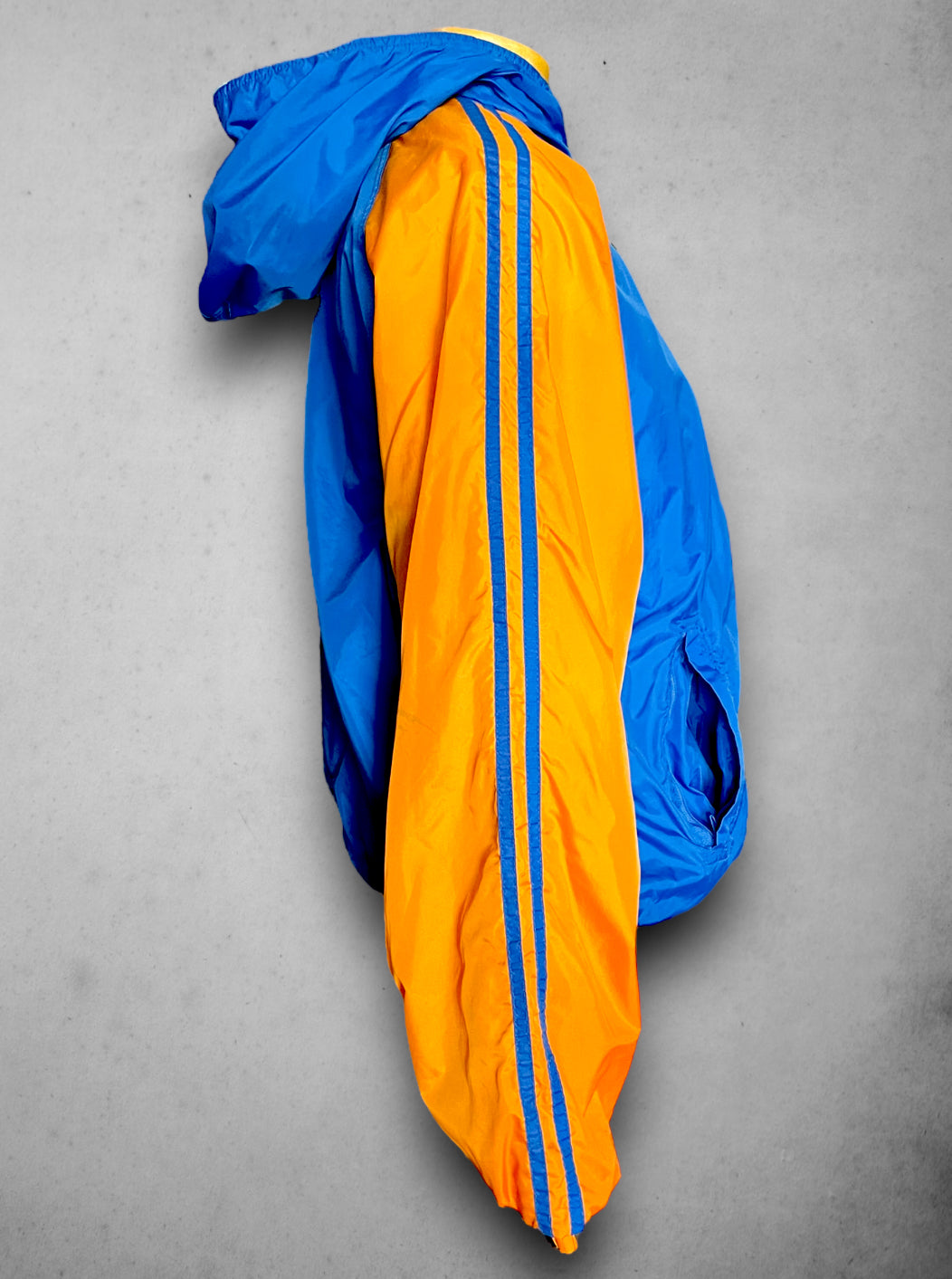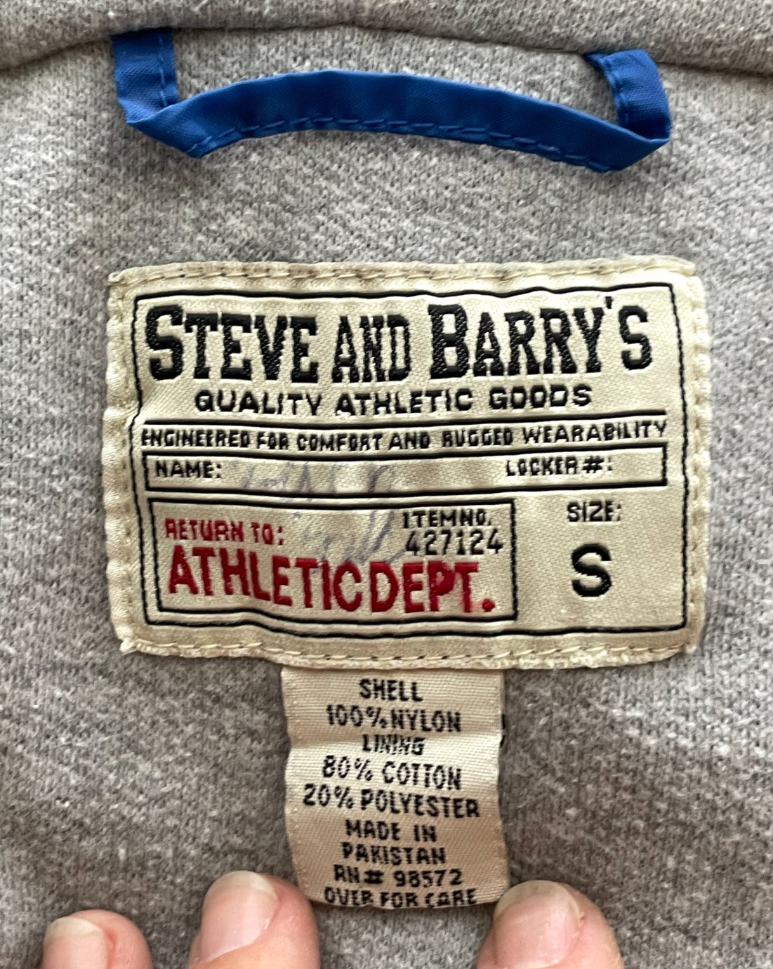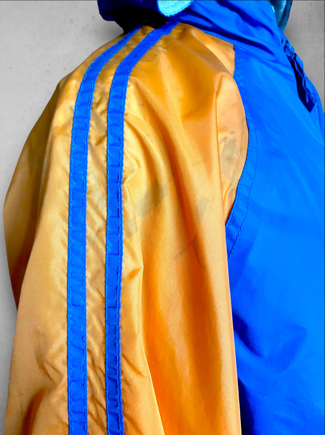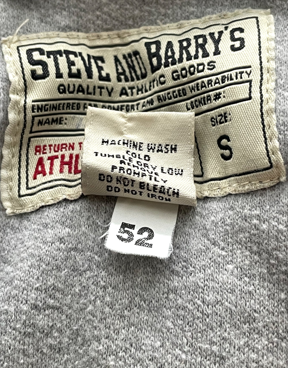 Vintage 1990’s Florida Gators zip up hooded windbreaker with grey cotton lining. Tag reads Steve and Barry’s Size S. Has elastic waistband and wrists and two pockets. Has some discoloration on orange shoulder/ armpit area shown in detail photos, not super noticeable when worn. Has a raglan style cut so doesn’t have shoulder seams.