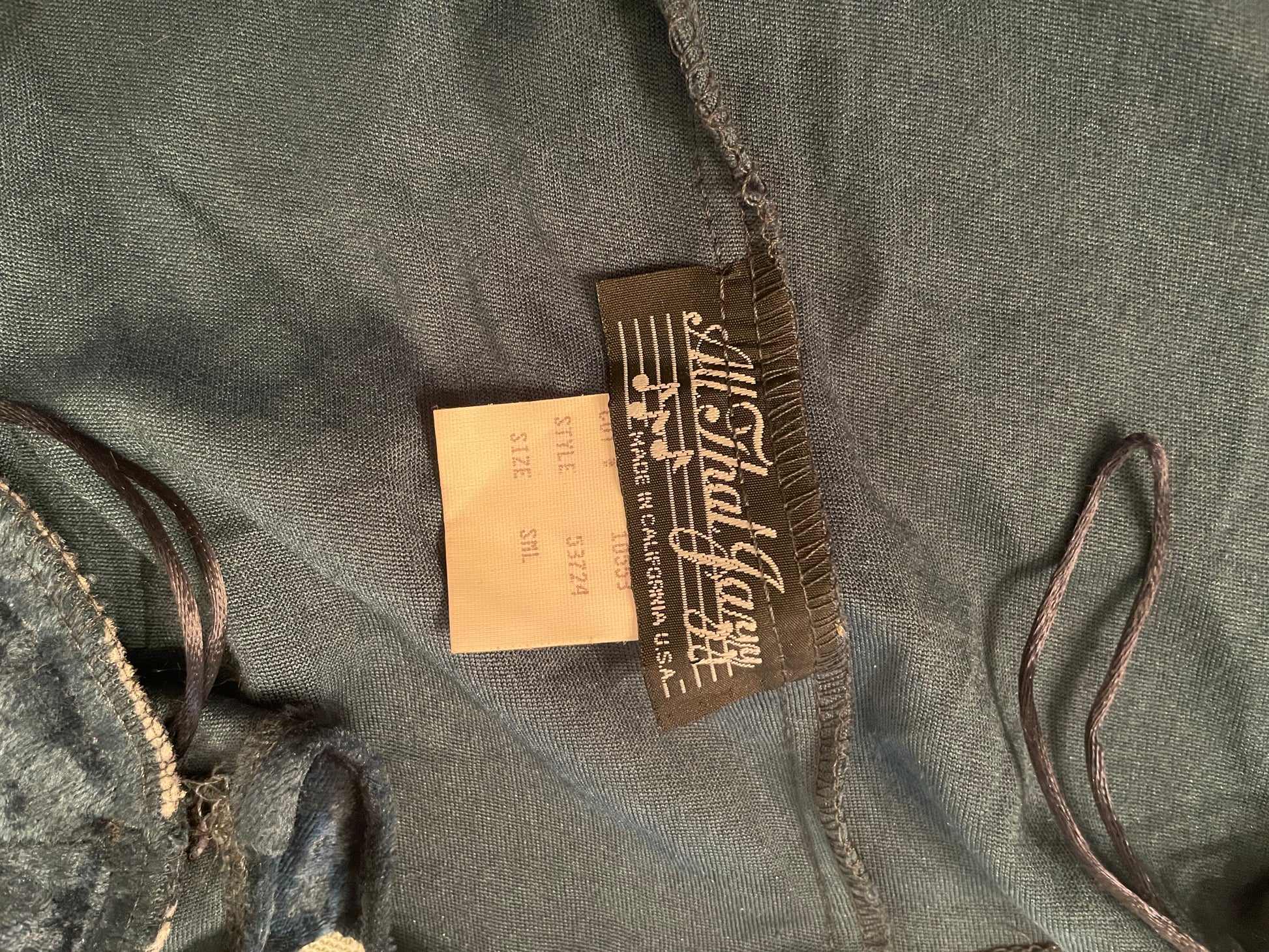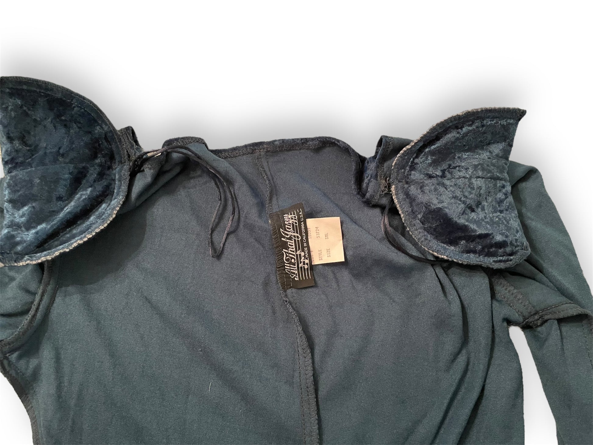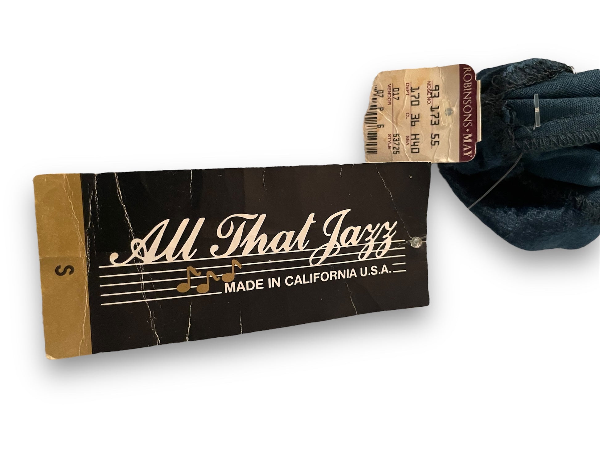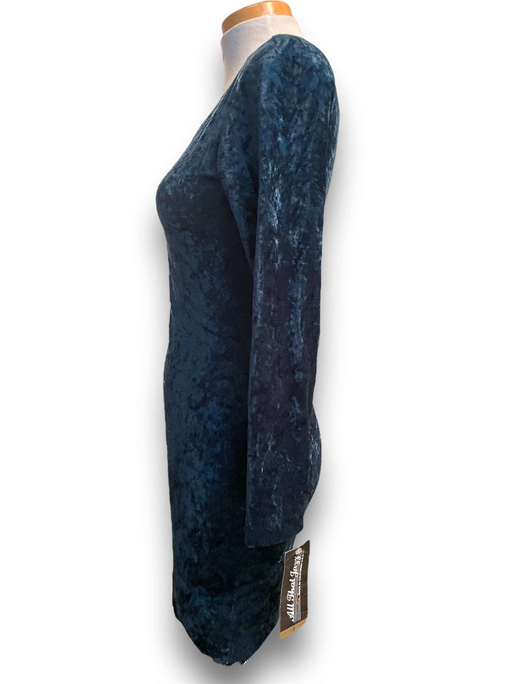Vintage New Old Stock 1990’s green crush velvet stretch mini dress with long sleeves. All That Jazz brand with original tags attached. Tags read size Small, made in California the U.S.A. Shoulder pads and original hanging assistants still attached.