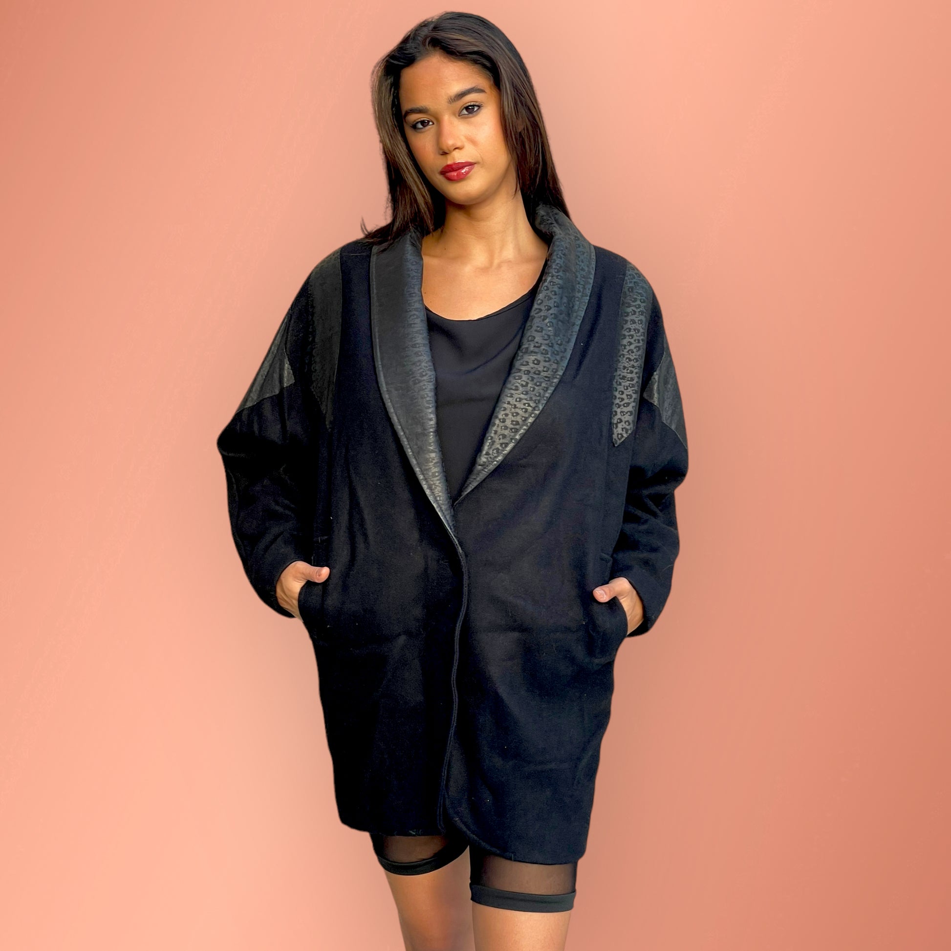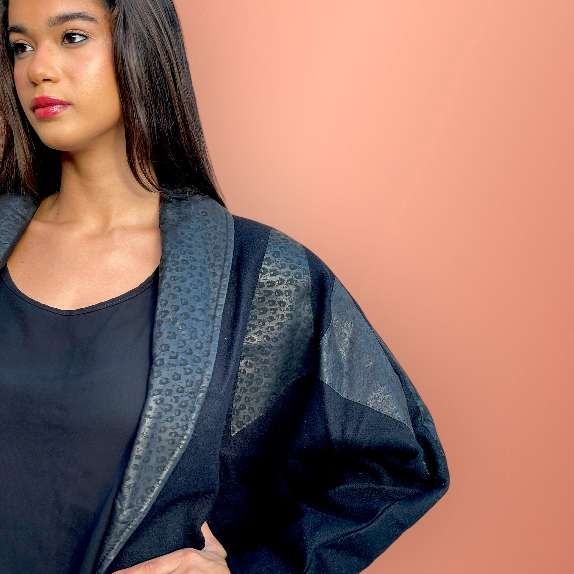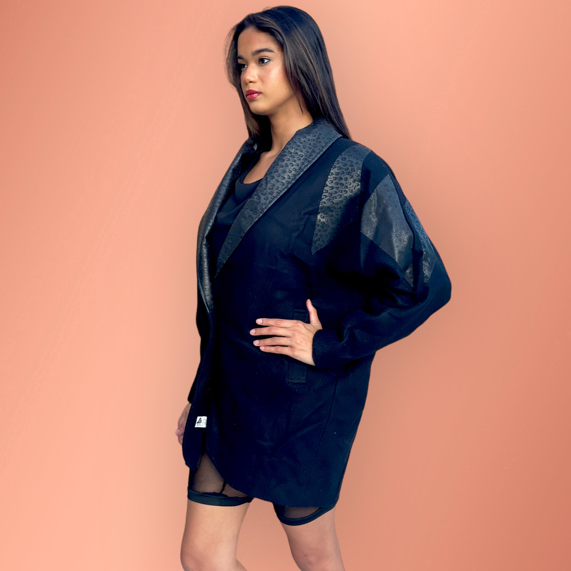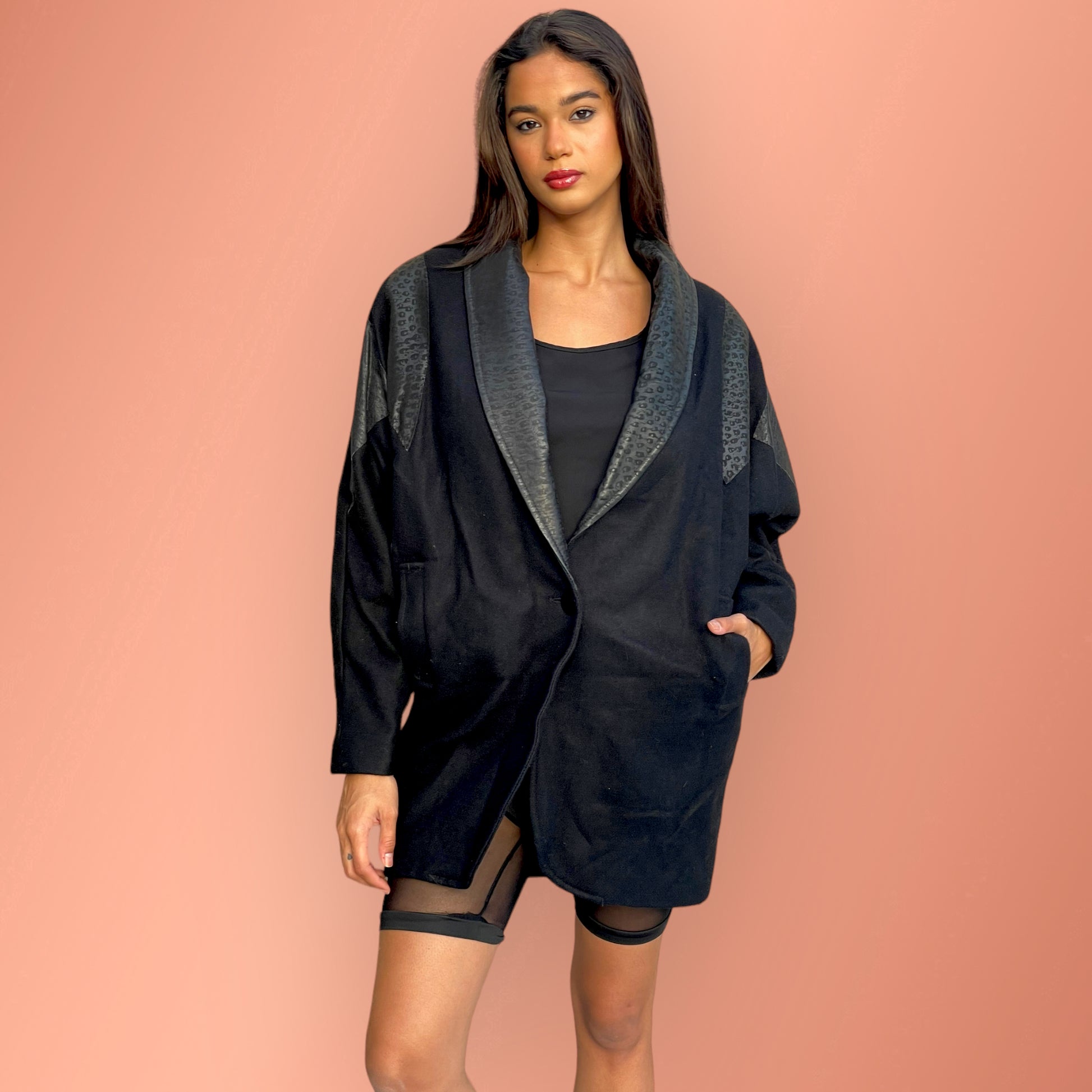 Vintage 1990’s Havoc Black Wool & Leopard Print Leather Batwing Oversized Blazer Jacket