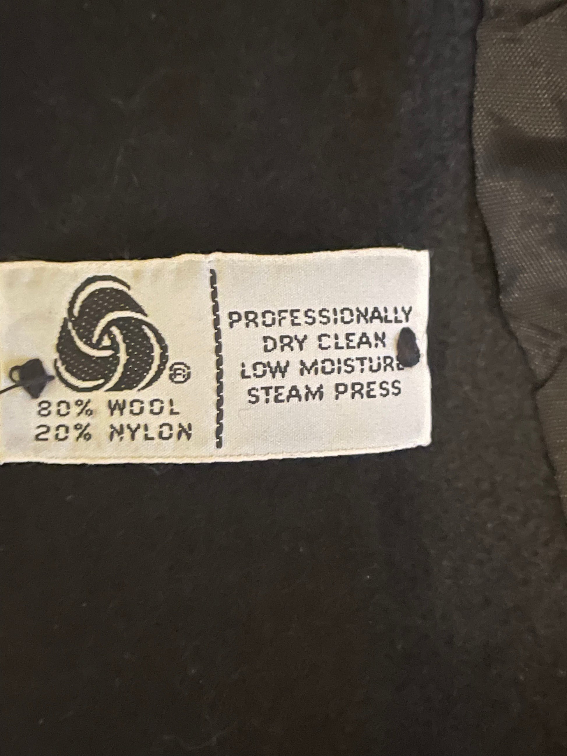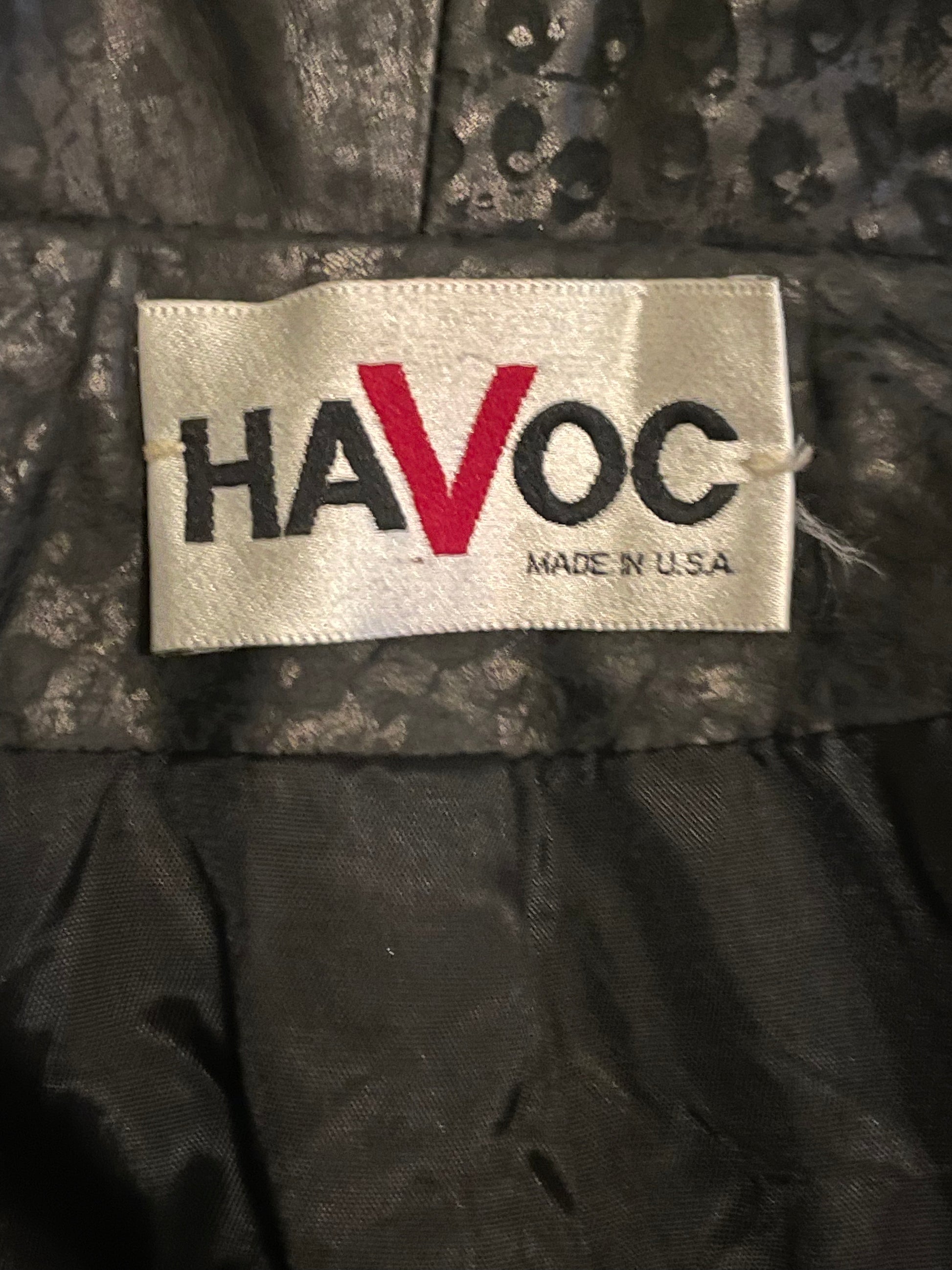 This is one of the coolest jackets I’ve ever found! It has an early 90’s baggy coolness that you just don’t see today. Batwing/ Raglan geometric cut blazer style black 80 % wool 20% nylon jacket with geometric leopard print leather cut out shoulder & sleeve detailing and collar. Single button closure. MADE IN THE USA! by Havoc. Tag says Small however it seems more like a Large to me possibly even XL by current sizing.