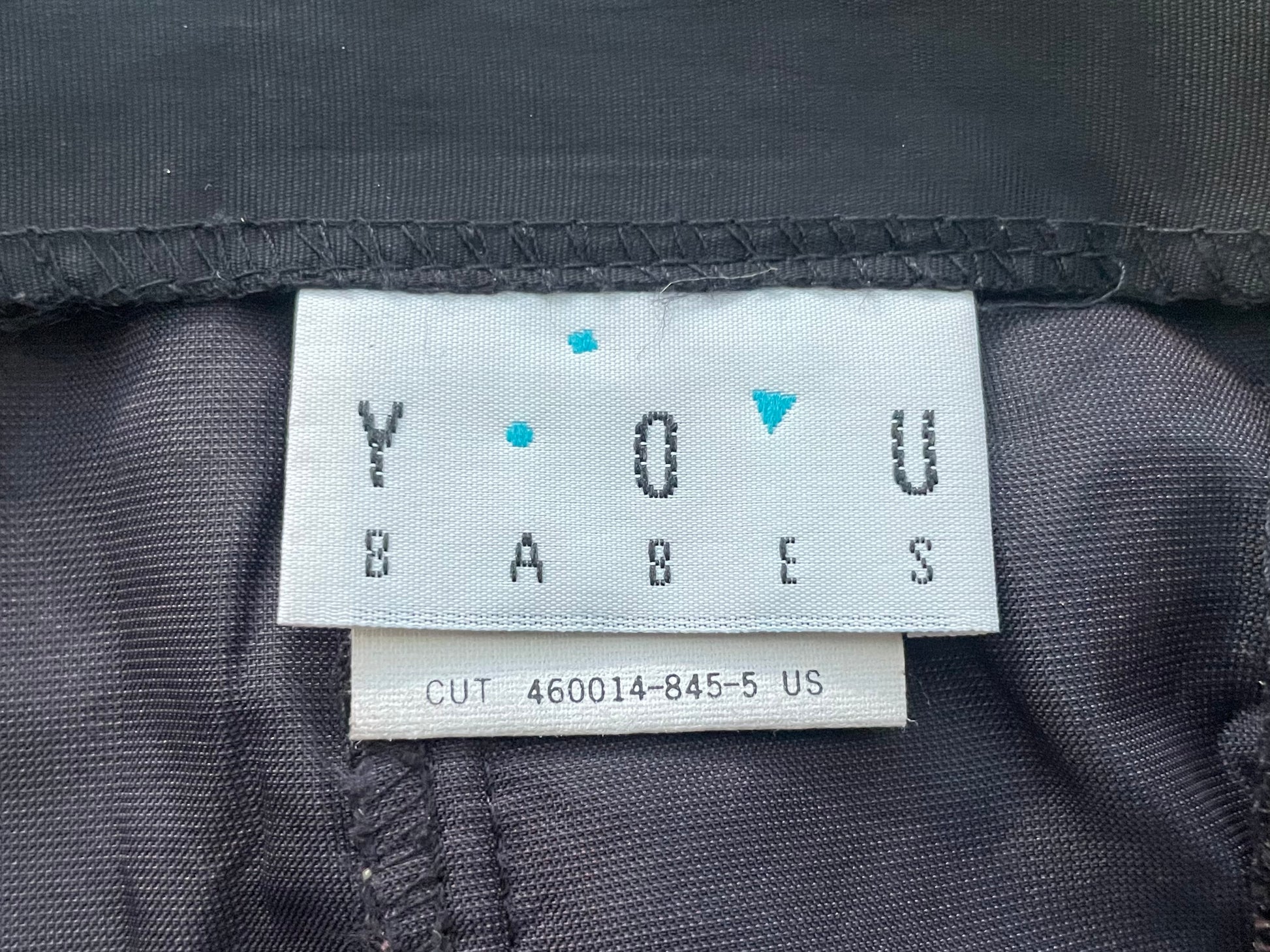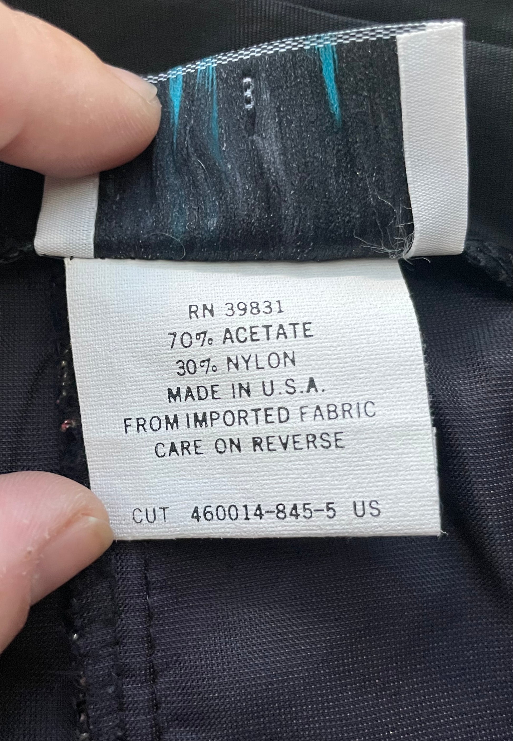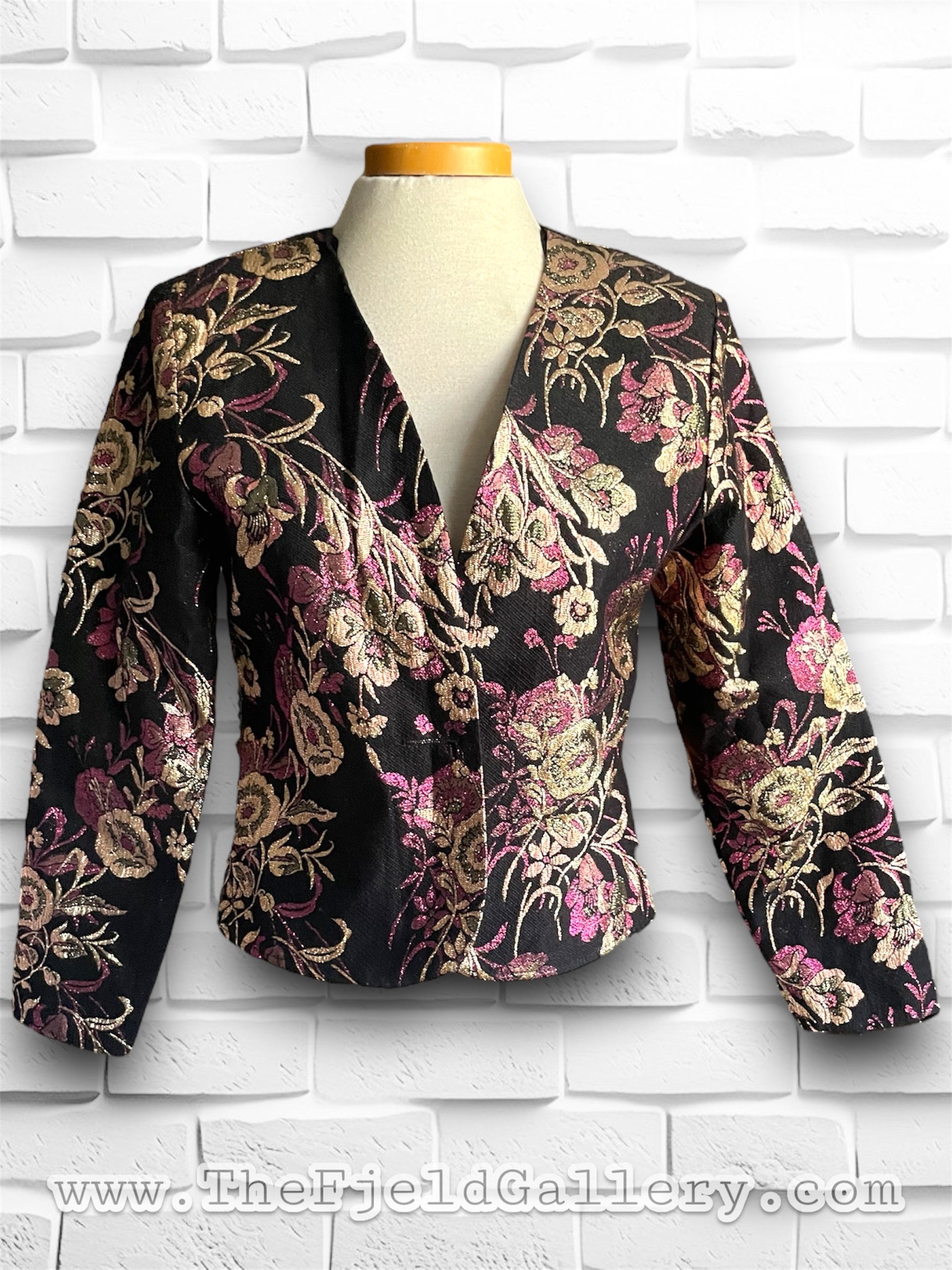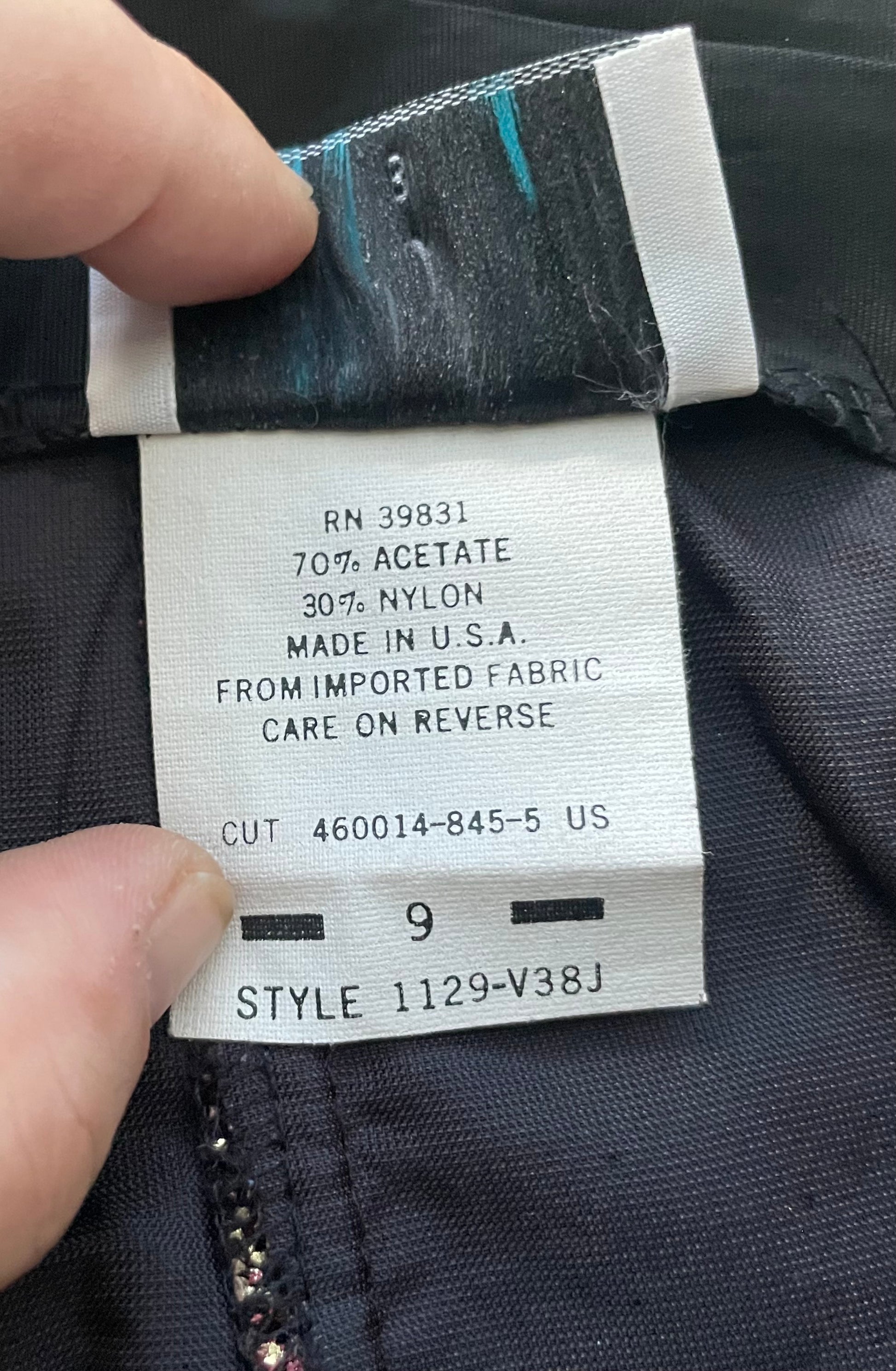 Gorgeous vintage 1990’s deep purple, maroon velvet mini pencil skirt with gold and magenta metallic printed design. Back has center slit and zipper closure. No pockets. Tag label reads “You Babes / Made in USA / 70% Acetate 30% Nylon / Size 9” In perfect condition. Has a matching jacket also available shown in last photo, it’s not a set, but matches really perfectly.
