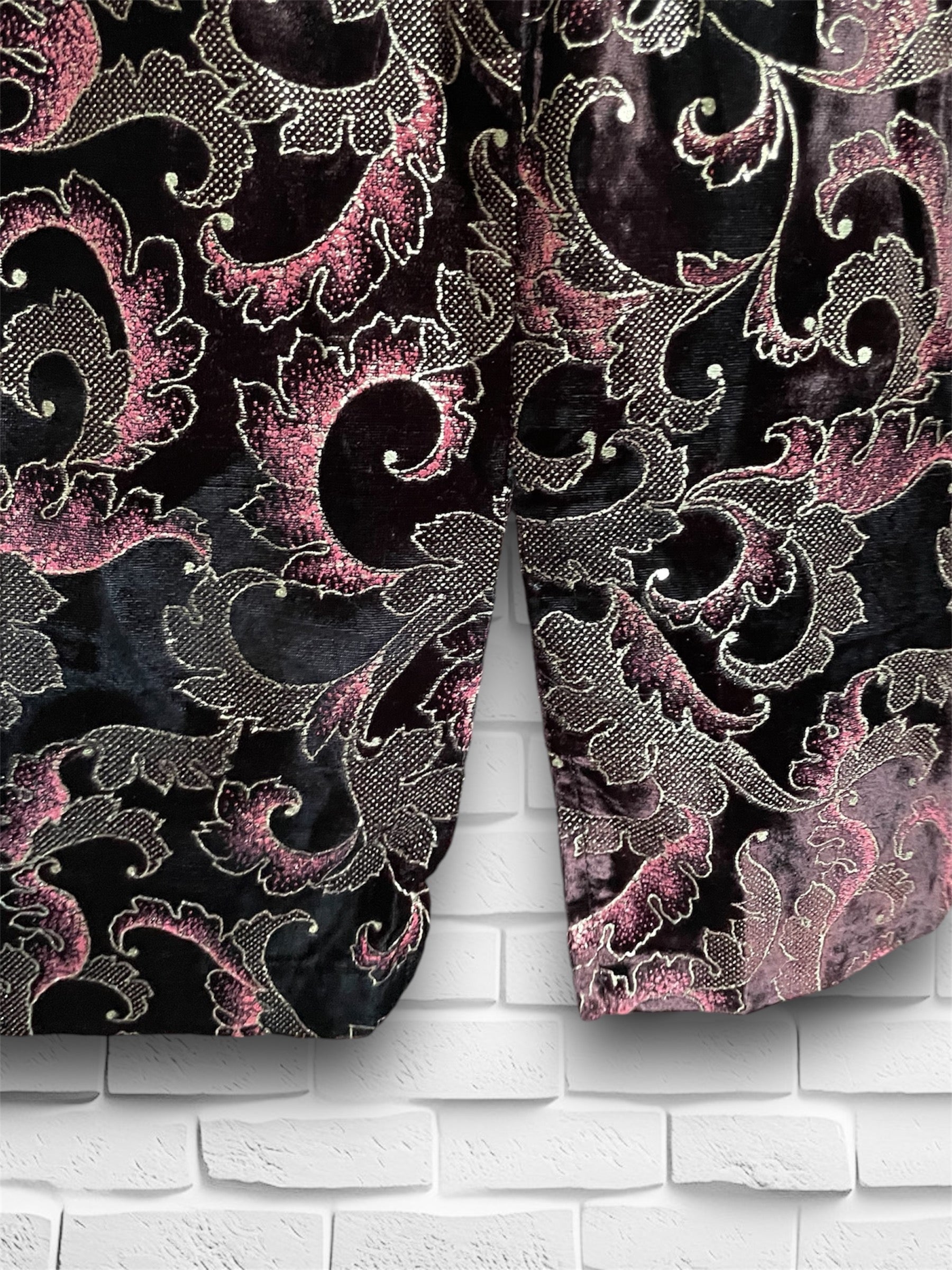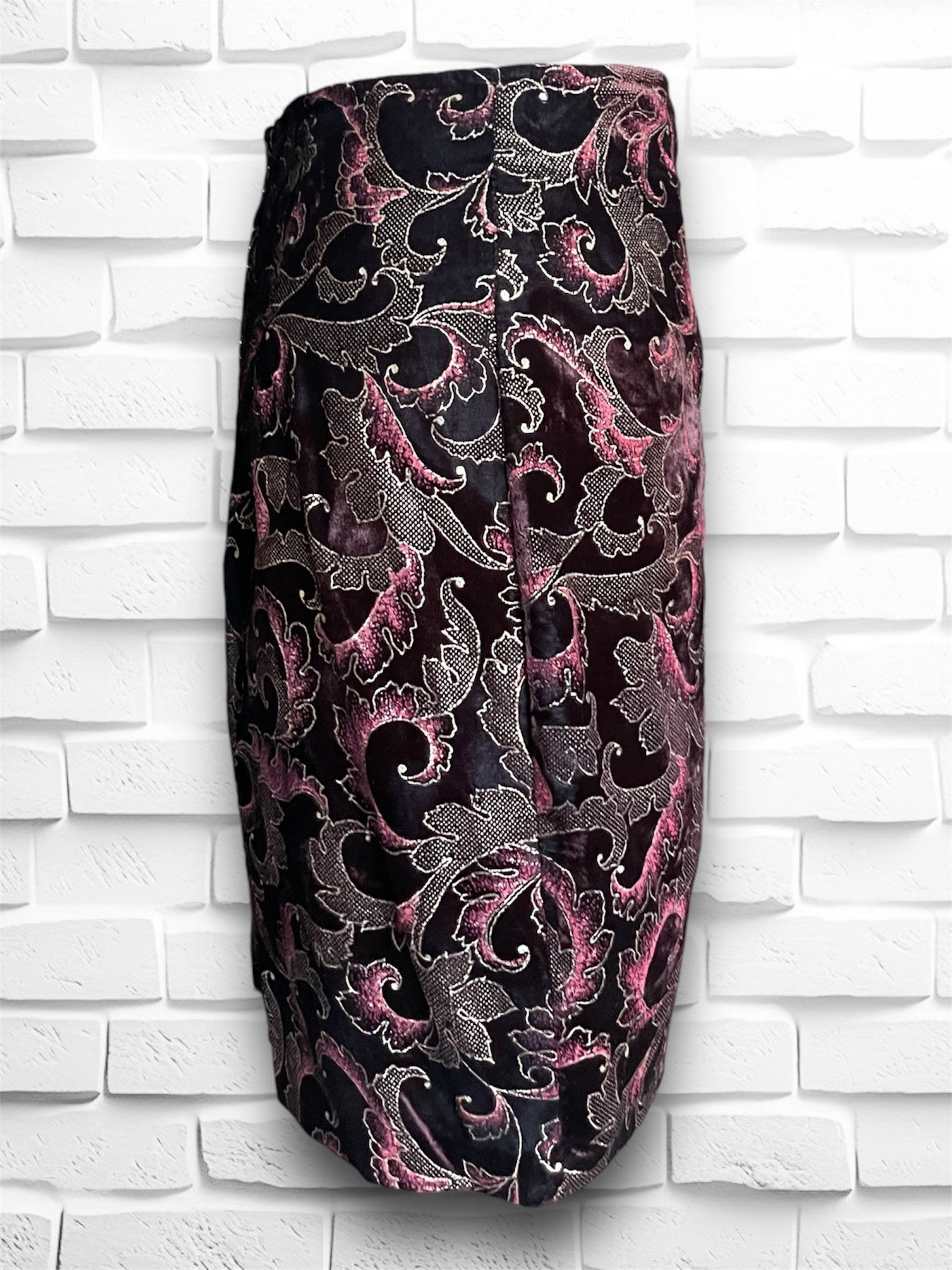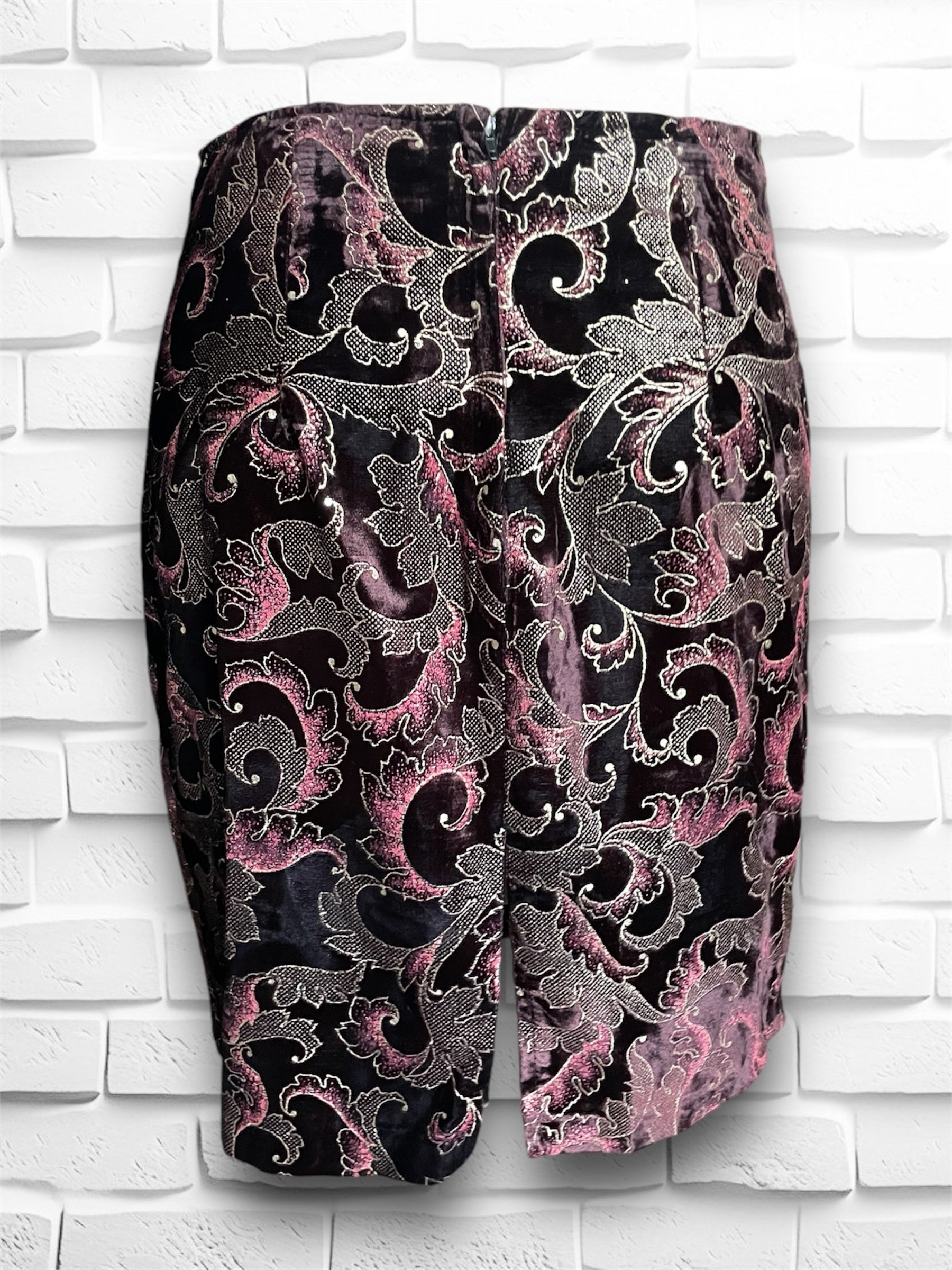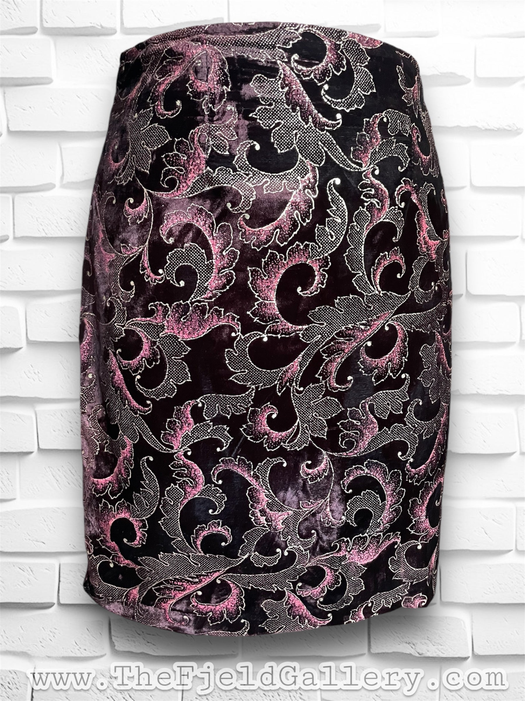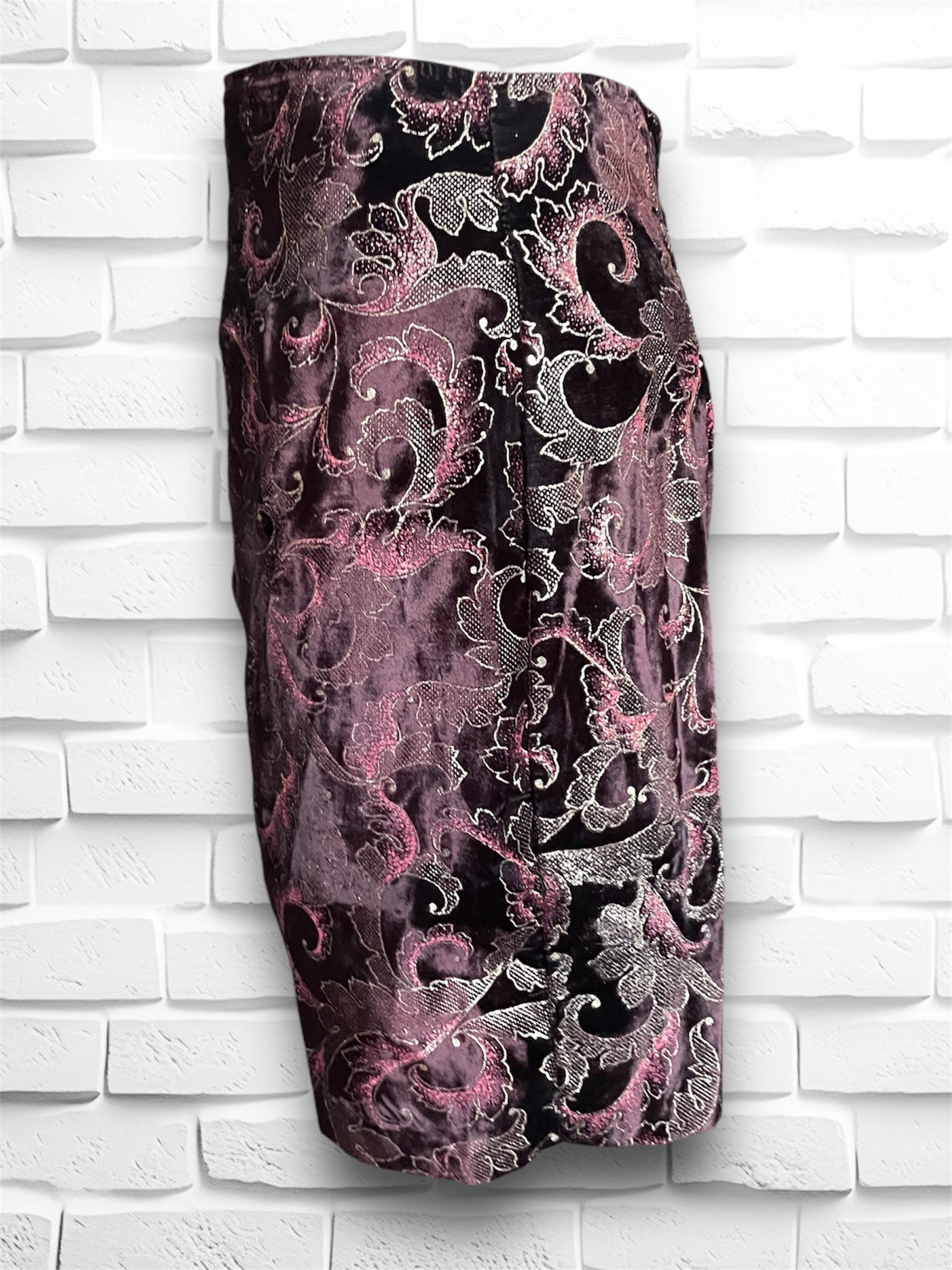 Vintage 1990’s Maroon Velvet & Metallic Gold & Magenta Paisley Mini Pencil Skirt