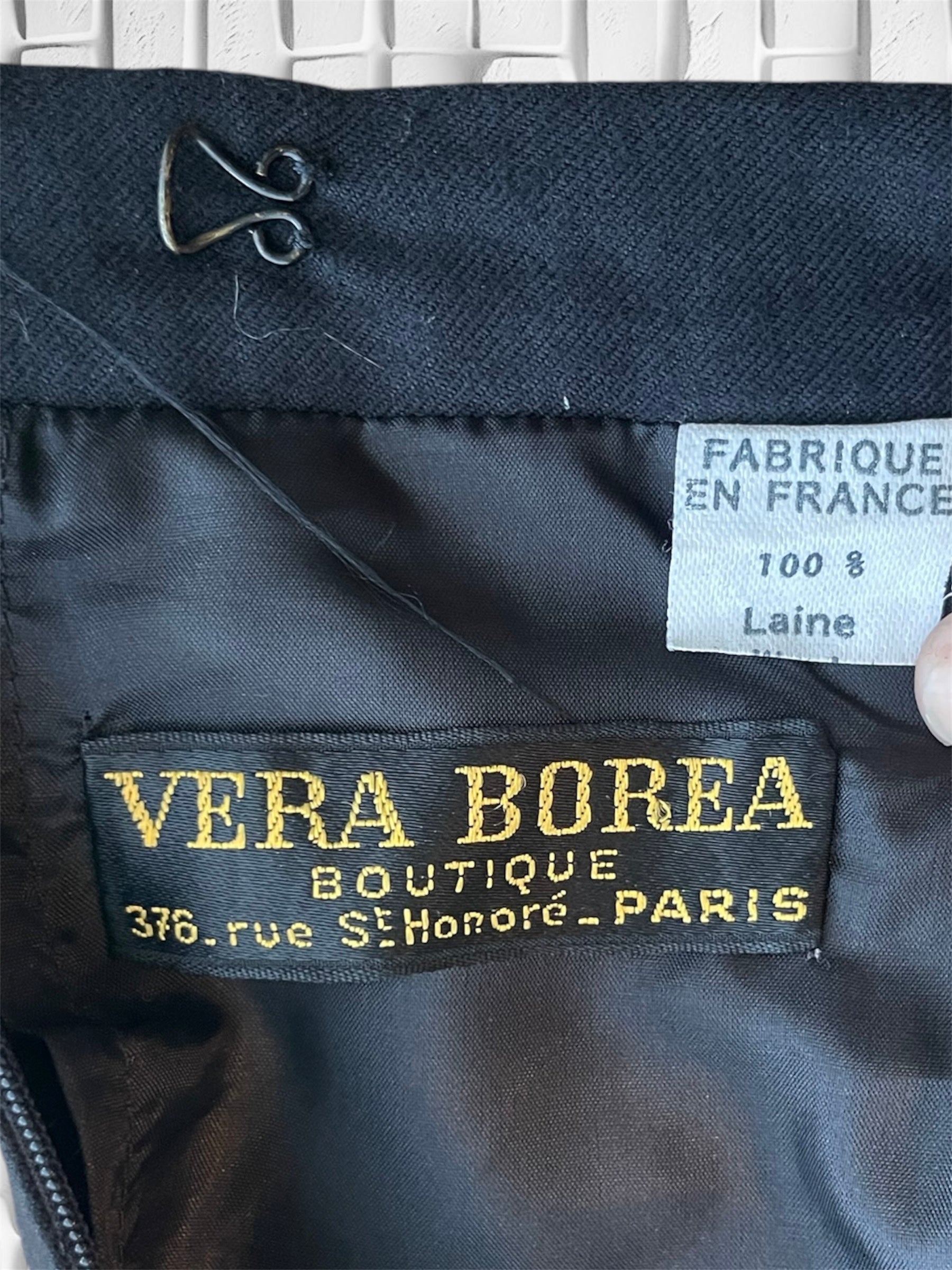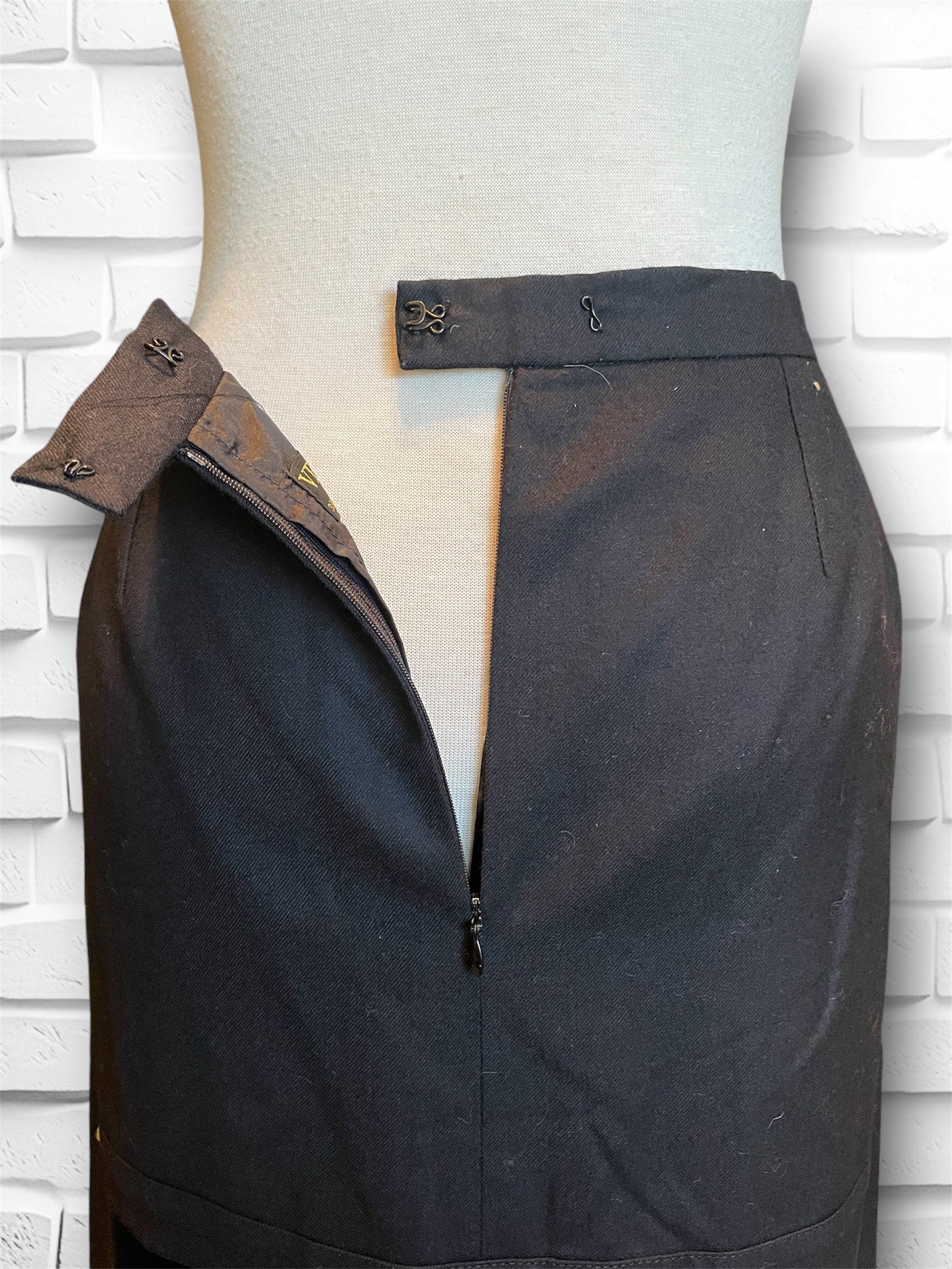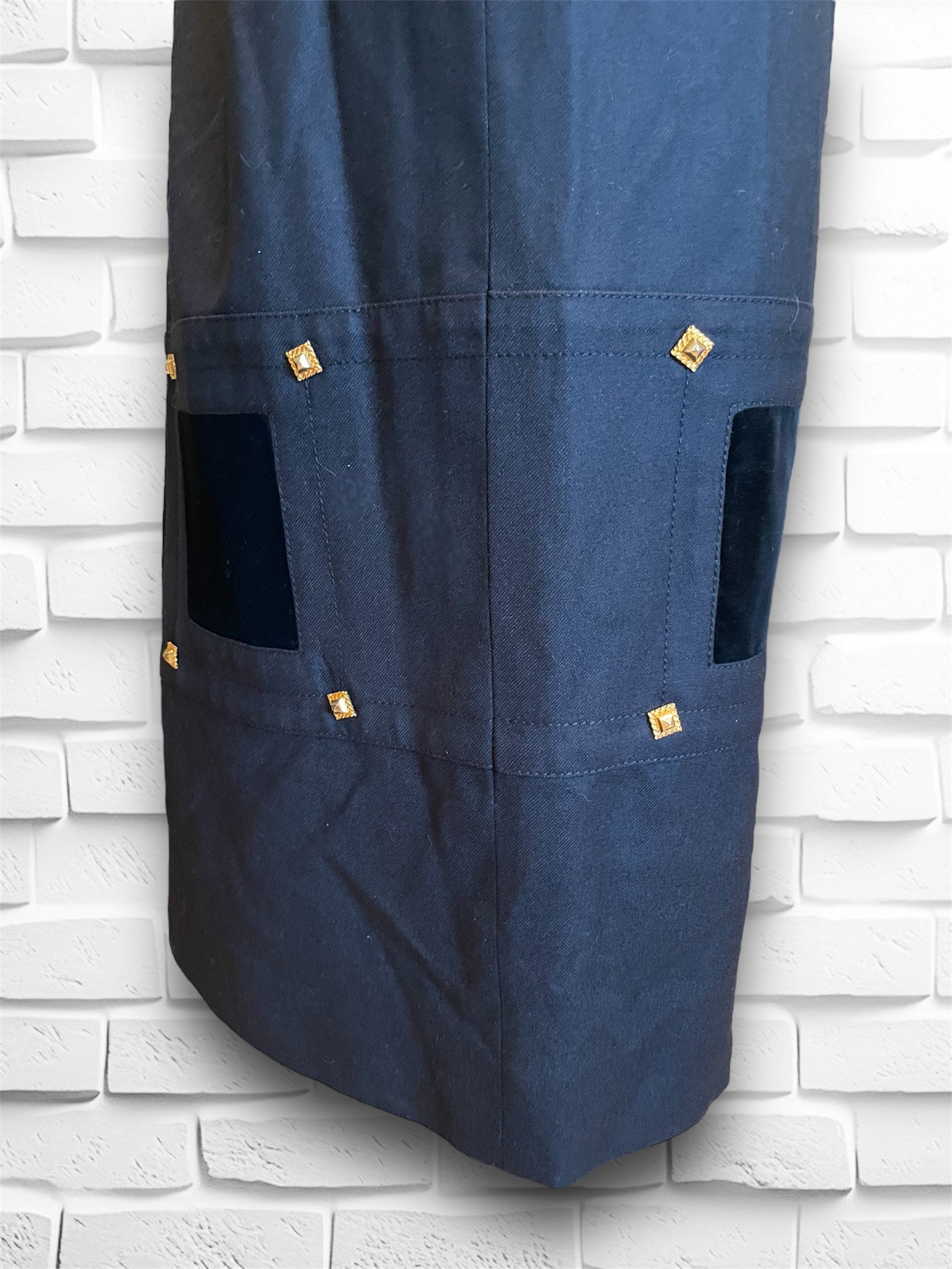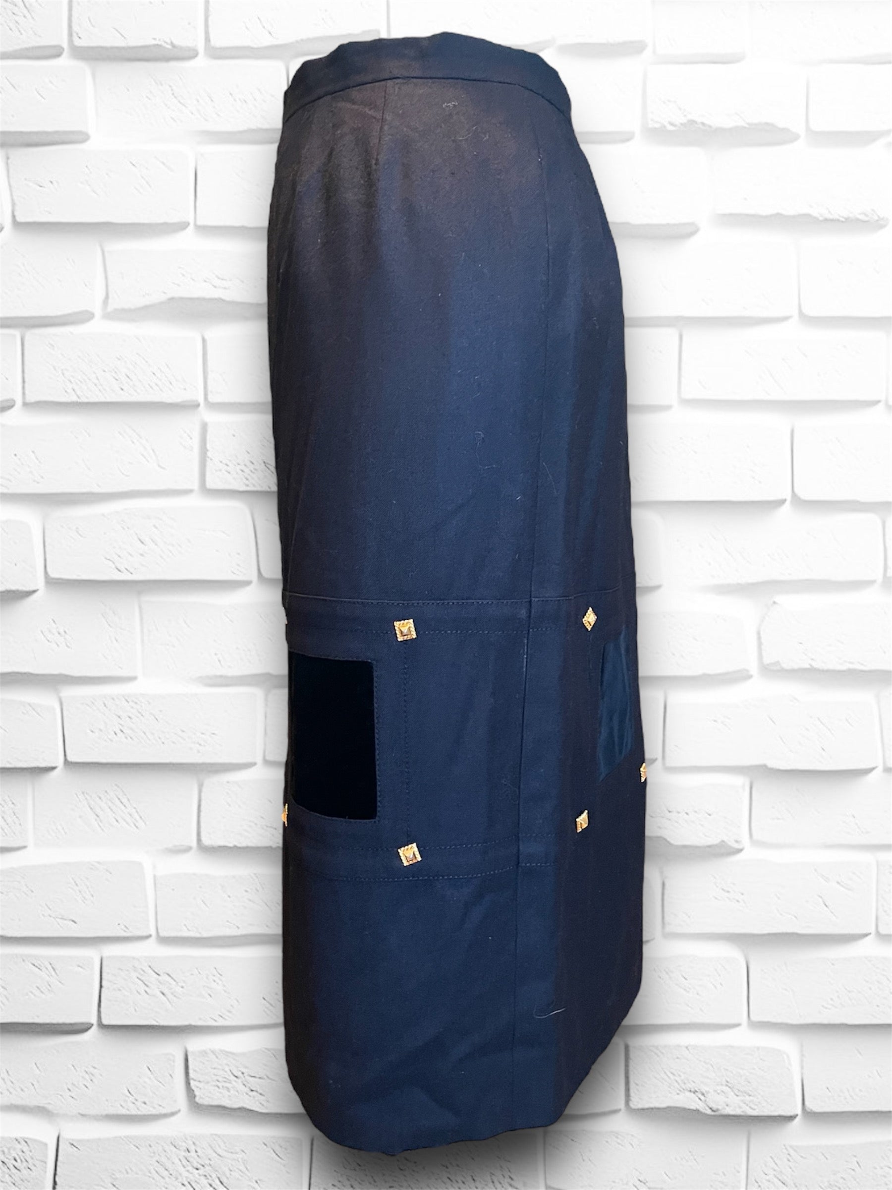 Gorgeous vintage 1990’s calf length wool straight cut black skirt with black velvet square details and gold square pyramid rivets. Zipper closure in back center with hook and eye closure and slit at center bottom. No pockets. Tag Label reads “Vera Borea Boutique / 376.rue St.Honoré PARIS / Fabric en France / 100% Wool”