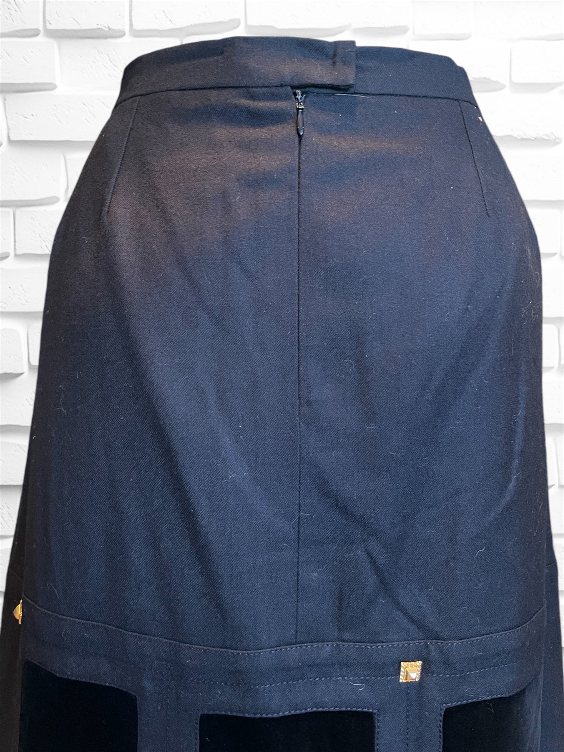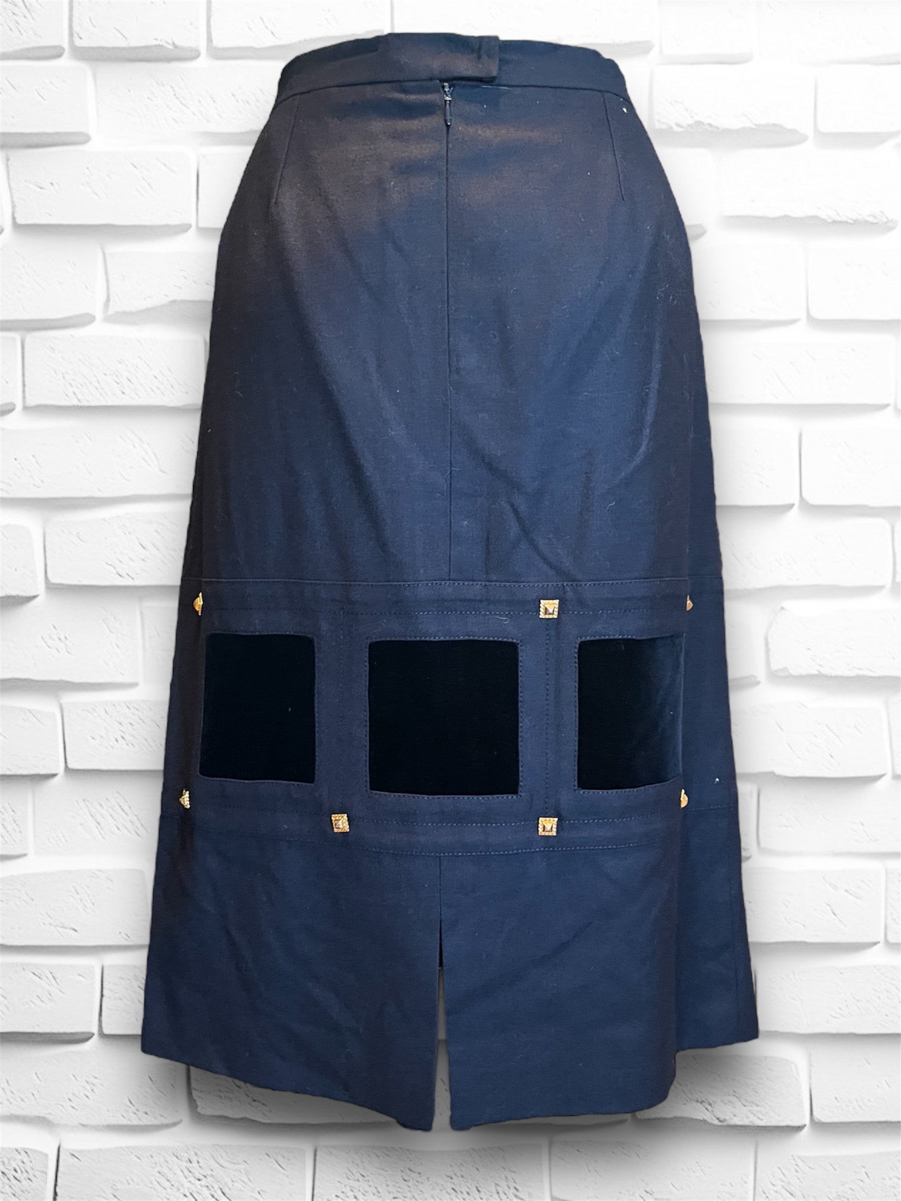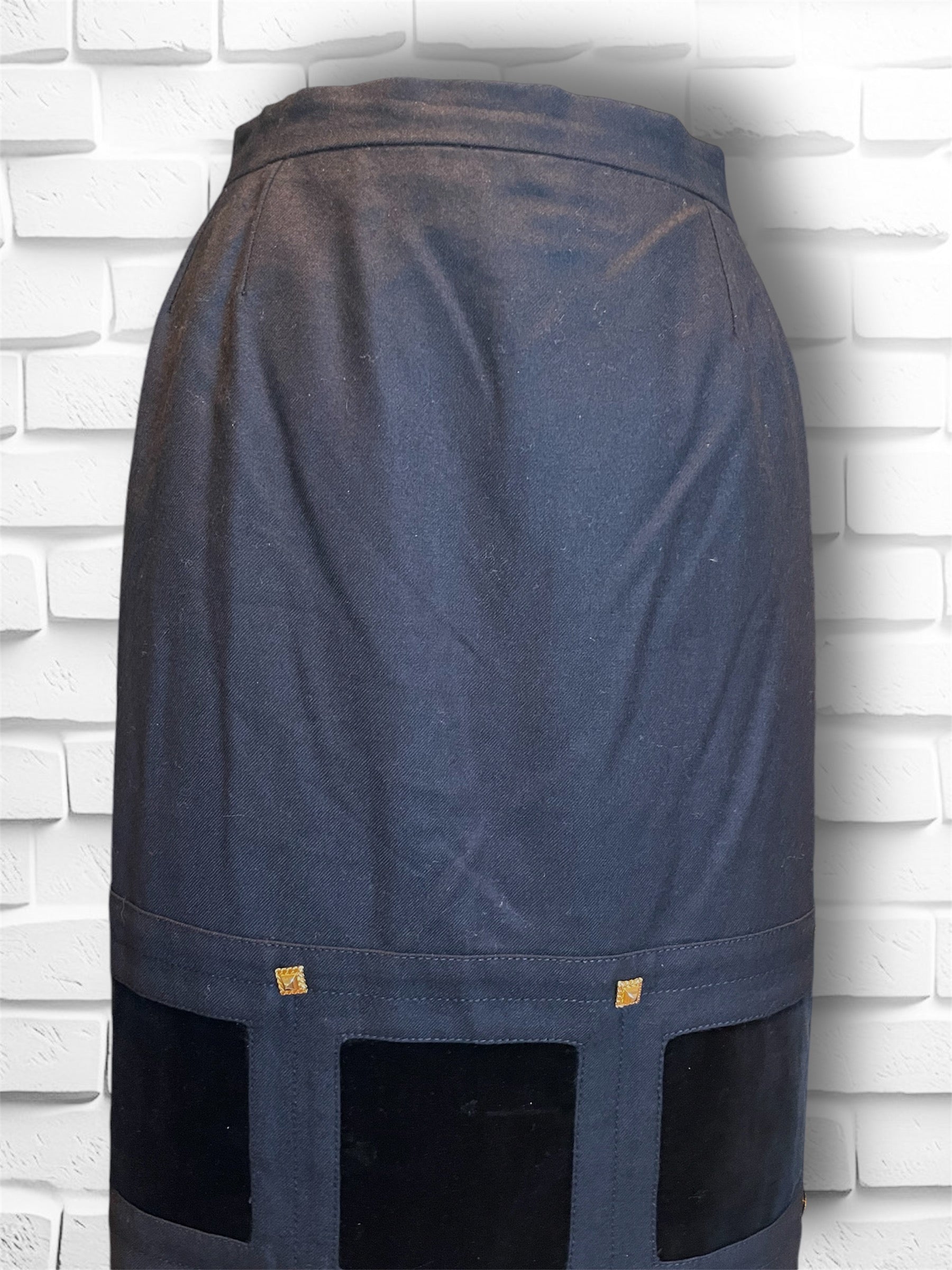 Vintage 1990’s Parisian Made Black Wool Skirt with Velvet Squares & Gold Rivets