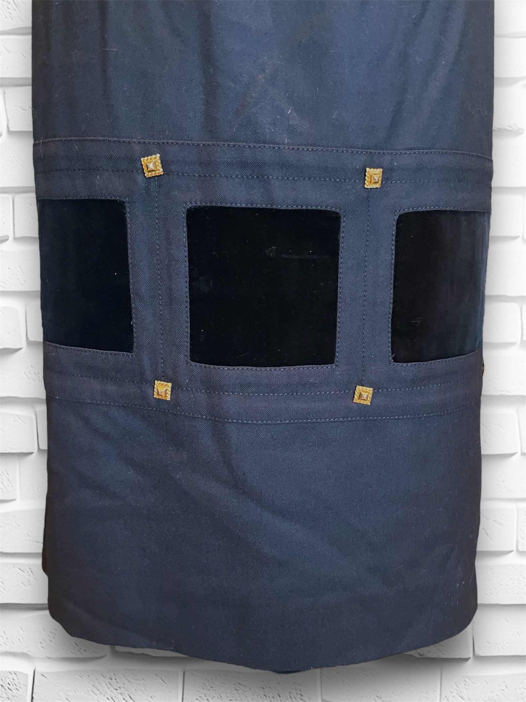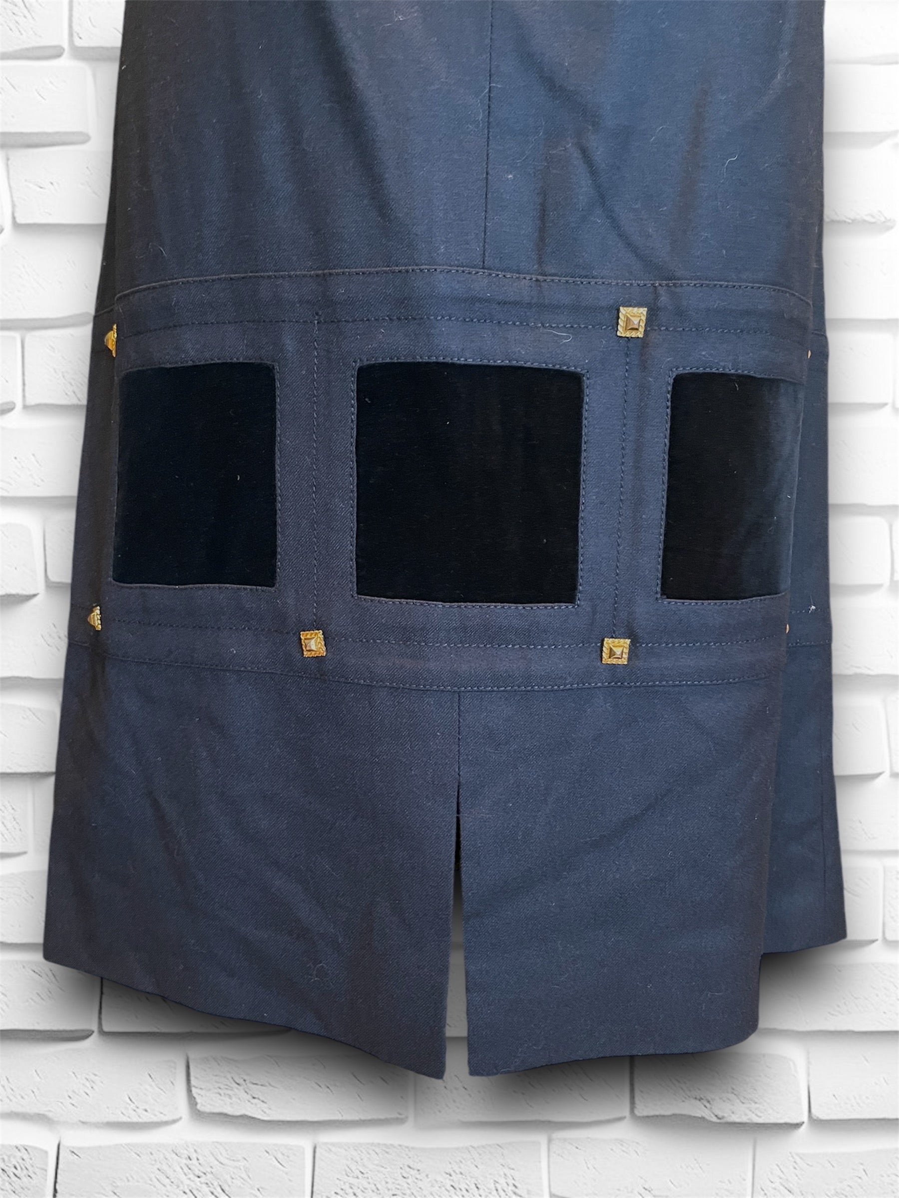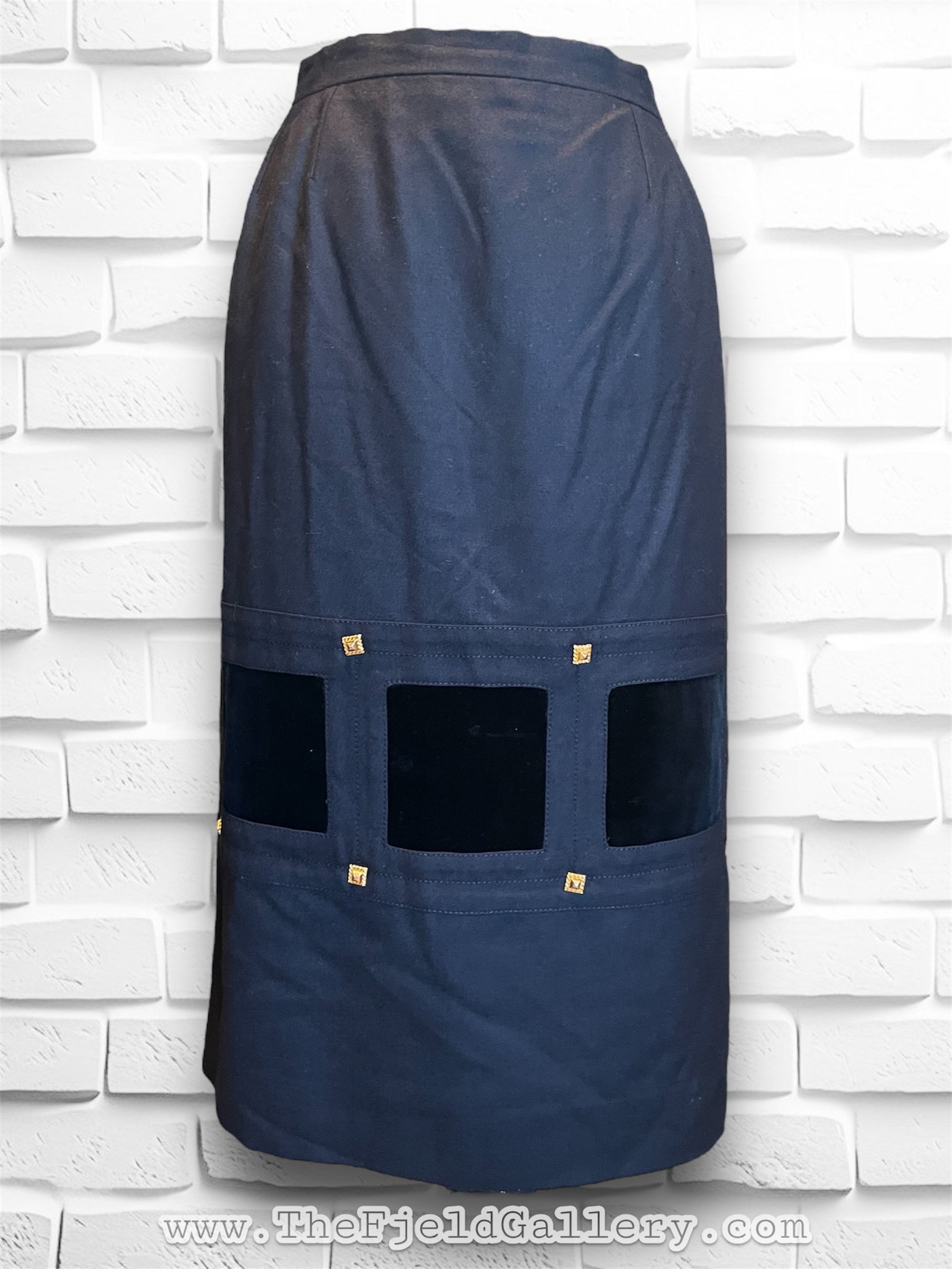 Vintage 1990’s Parisian Made Black Wool Skirt with Velvet Squares & Gold Rivets