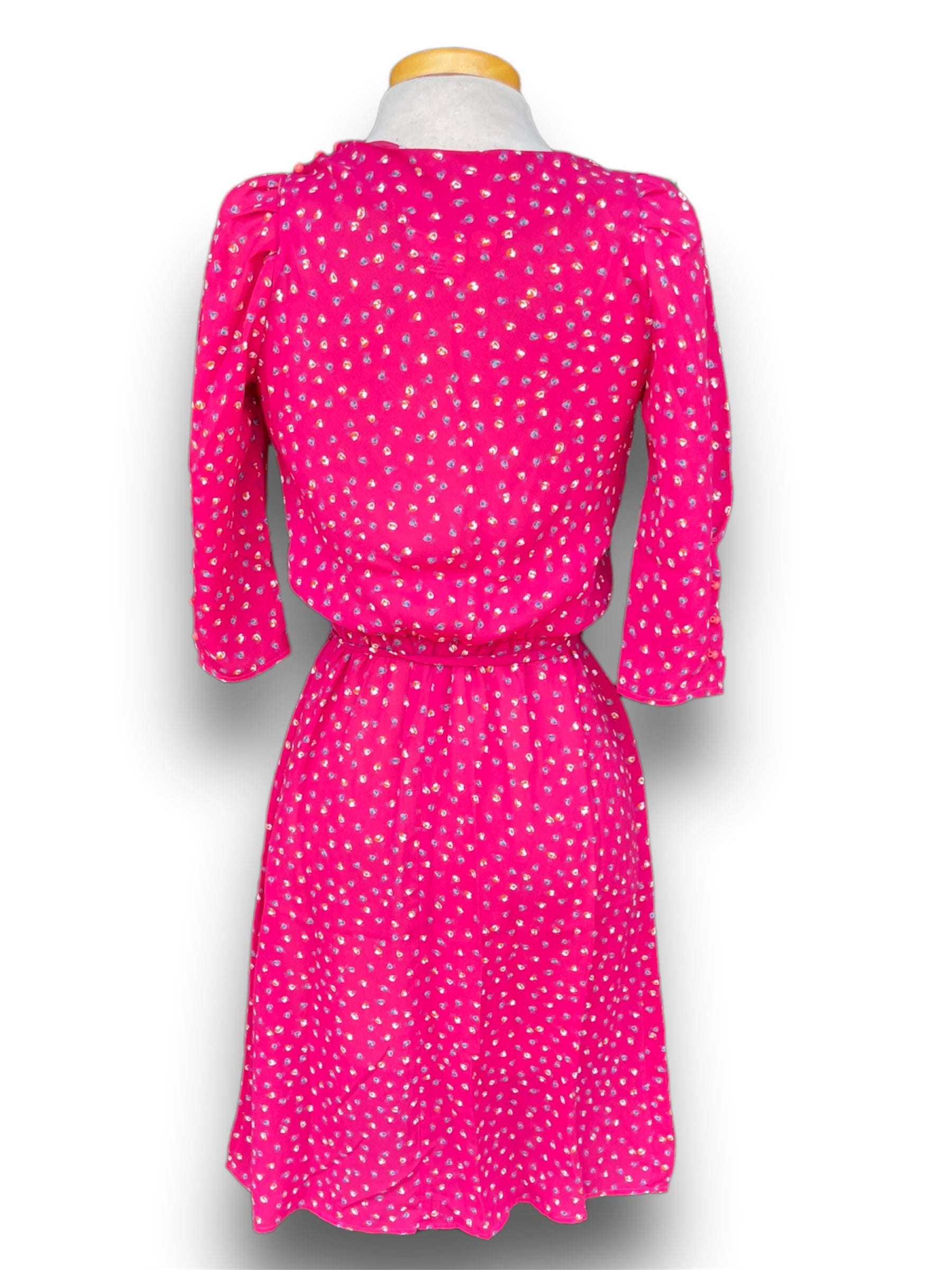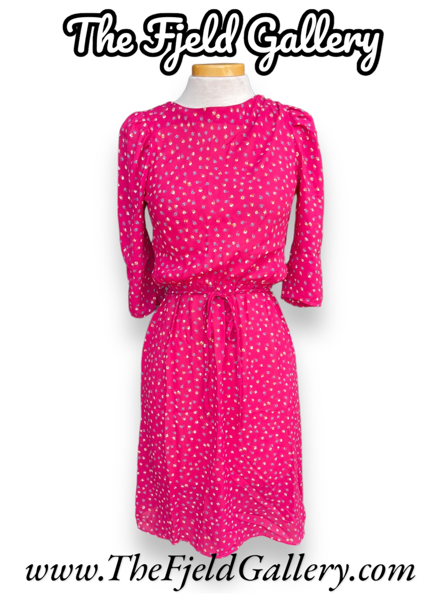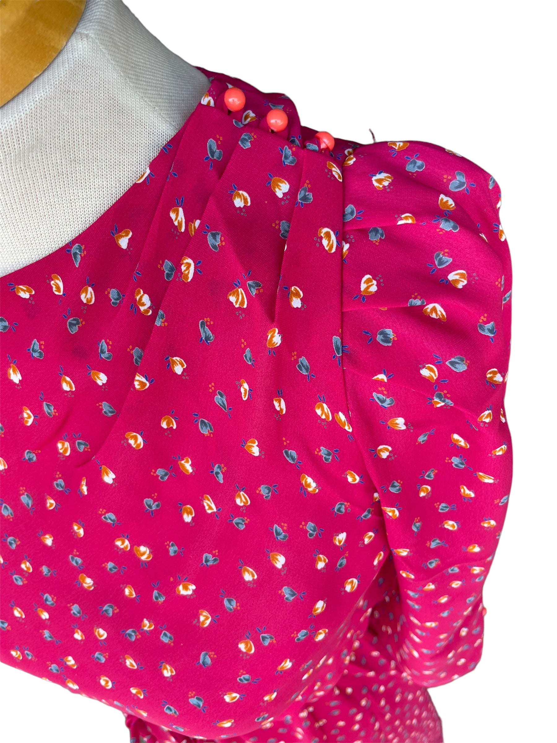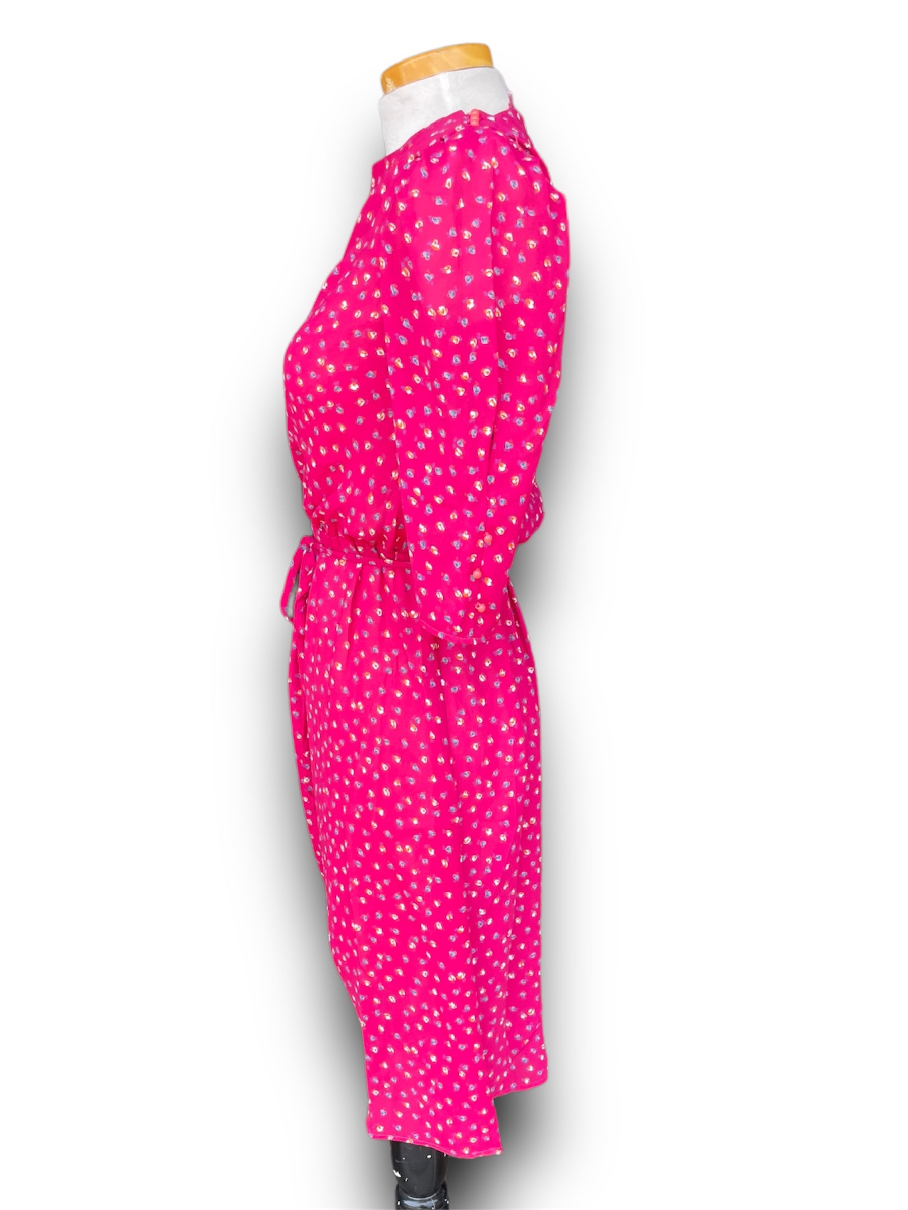Super adorable early 90’s pink floral print dress with elastic waistband and waist tie. Shoulder & sleeves button detail.