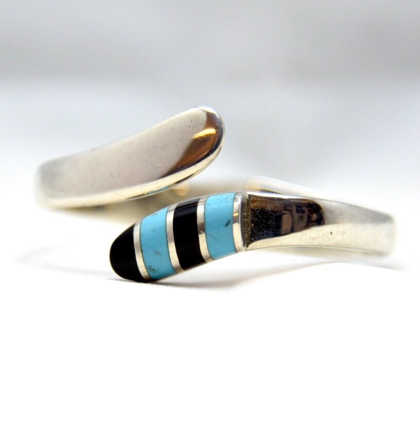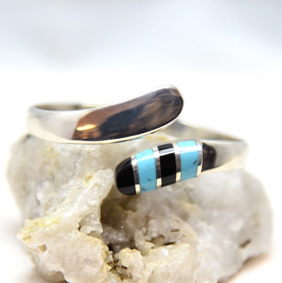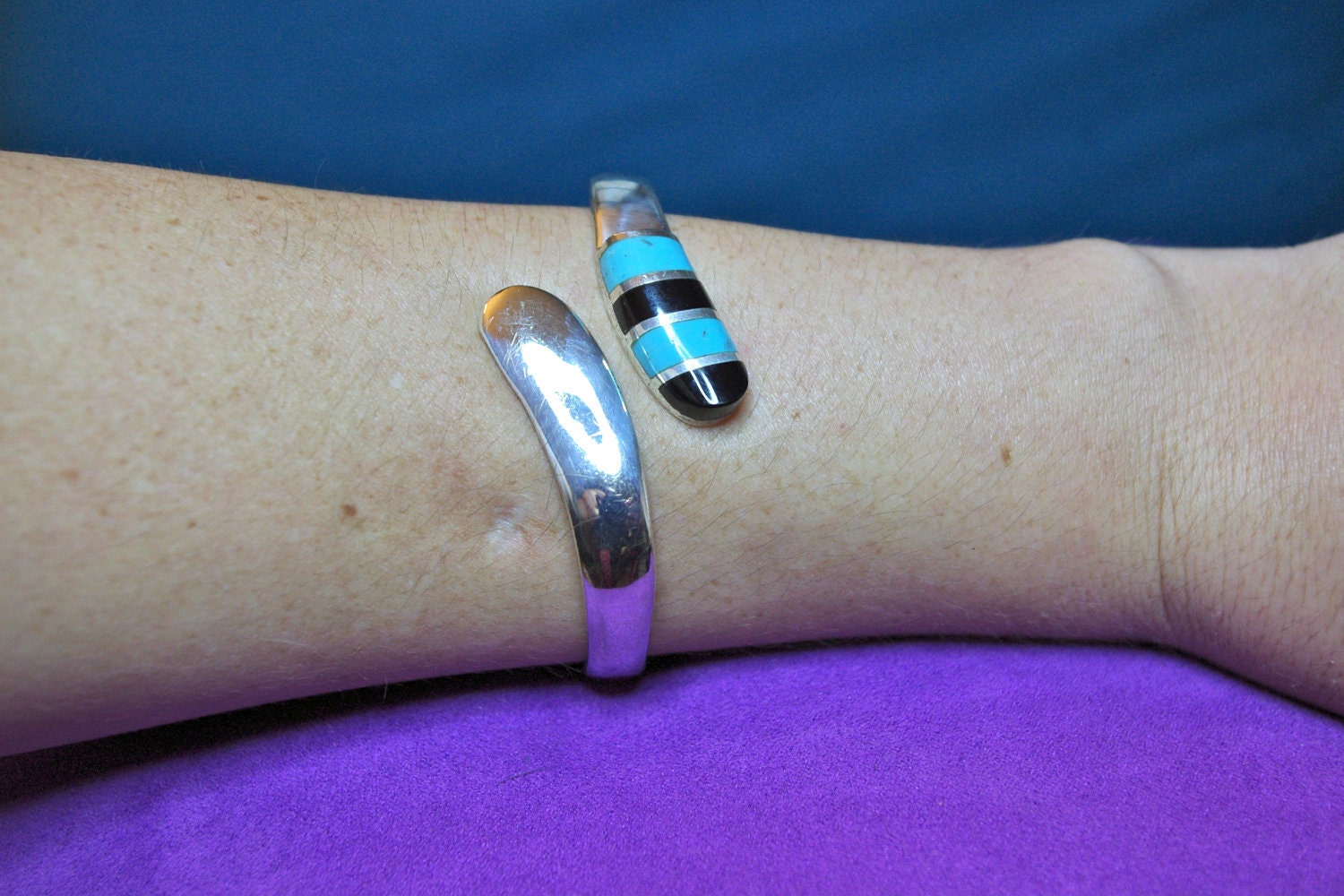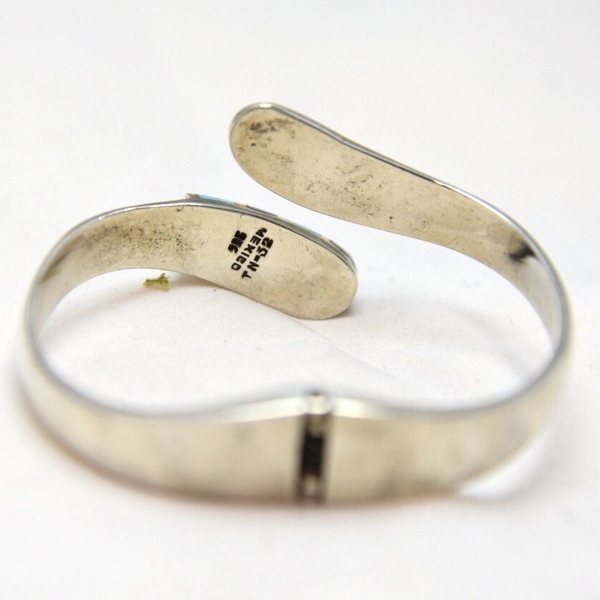 Vintage 925 Sterling Silver, Turquoise & Onyx Taxco Mexico Hinged Mid Century Modernist Clamper Bypass Bracelet