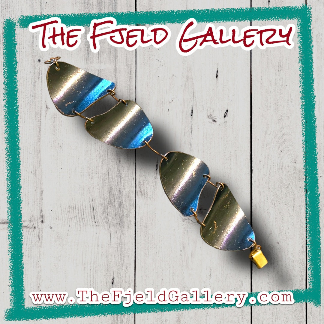 Beautiful vintage arts and crafts vintage copper panel link bracelet with triangle white, black and red enamels links with blue hammertone enamel back sides. Fold over clasp. 7.25”