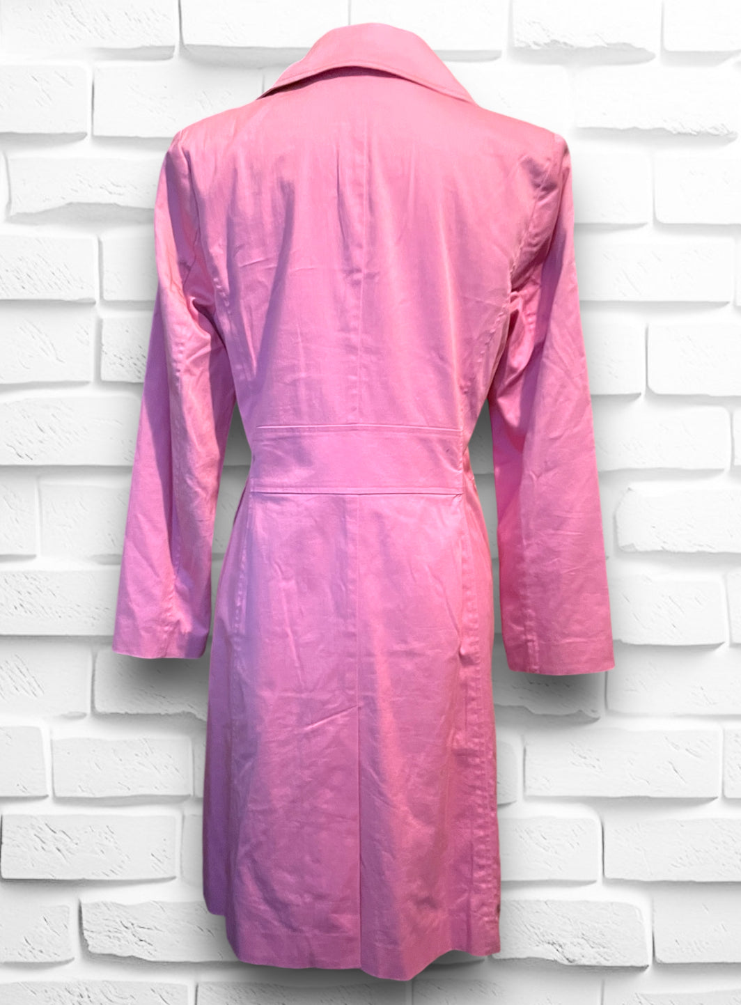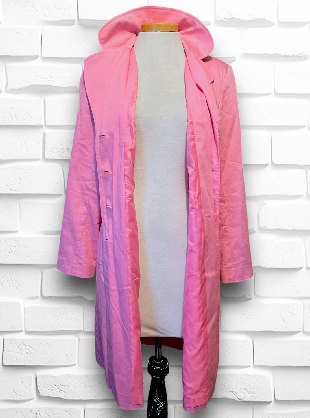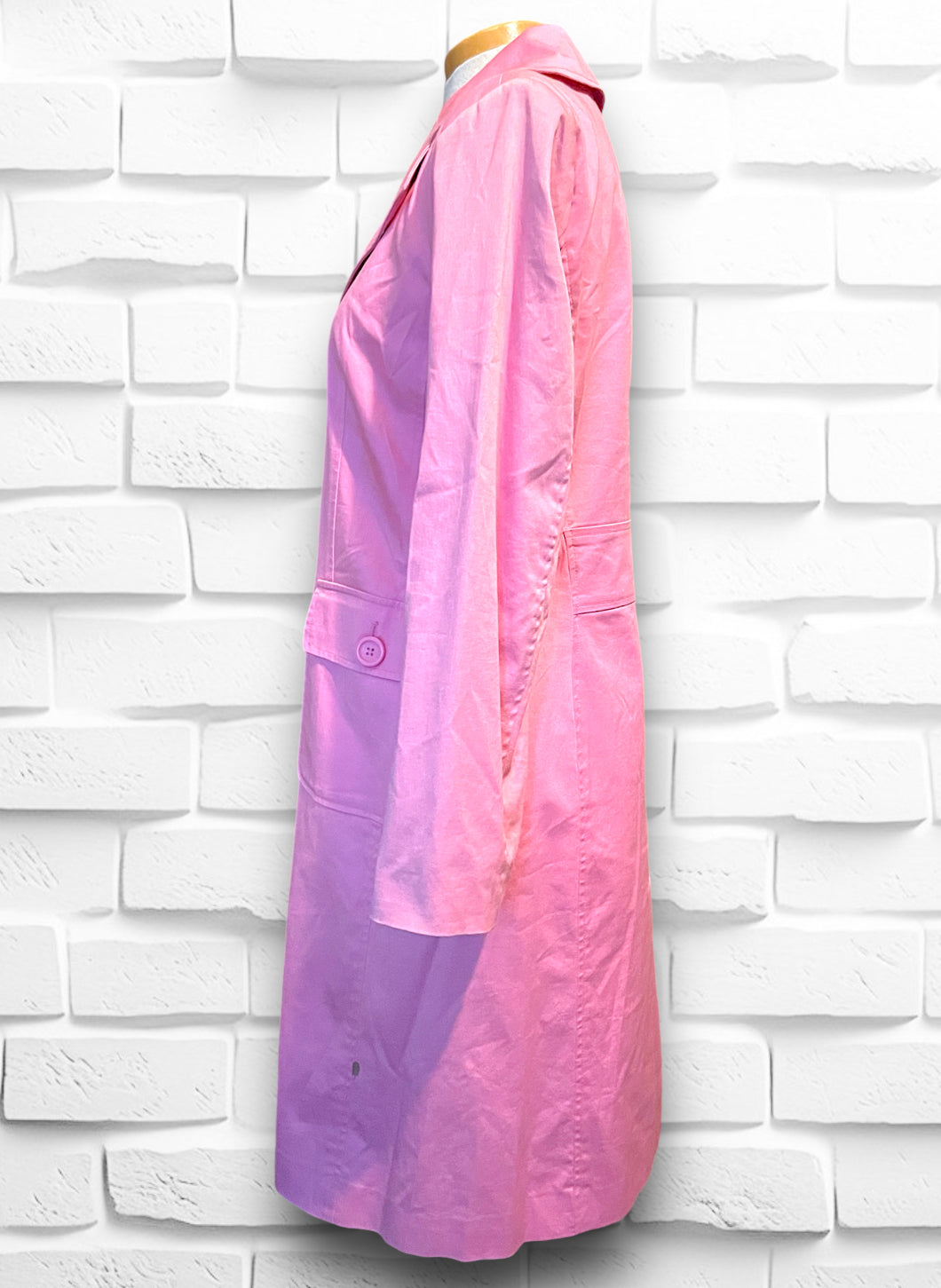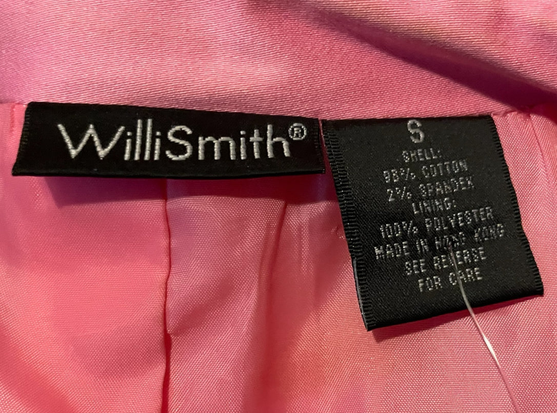 This is a beautiful soft pink long button up trench coat.  Label is “Willi Smith” 98% cotton 2% spandex so has a bit of stretch.  Size is Small and “Made in Hong Kong” Fully lined with a pink satin polyester lining.  Has a small shoulder pad, but not huge, just enough to give structure. Has two flap over button close pockets on the front.  In really great condition, no holes or stitching issues.  Has a small spot on the right side bottom that is aprox 1.5 cm by 1/2 cm but not noticeable while wearing.