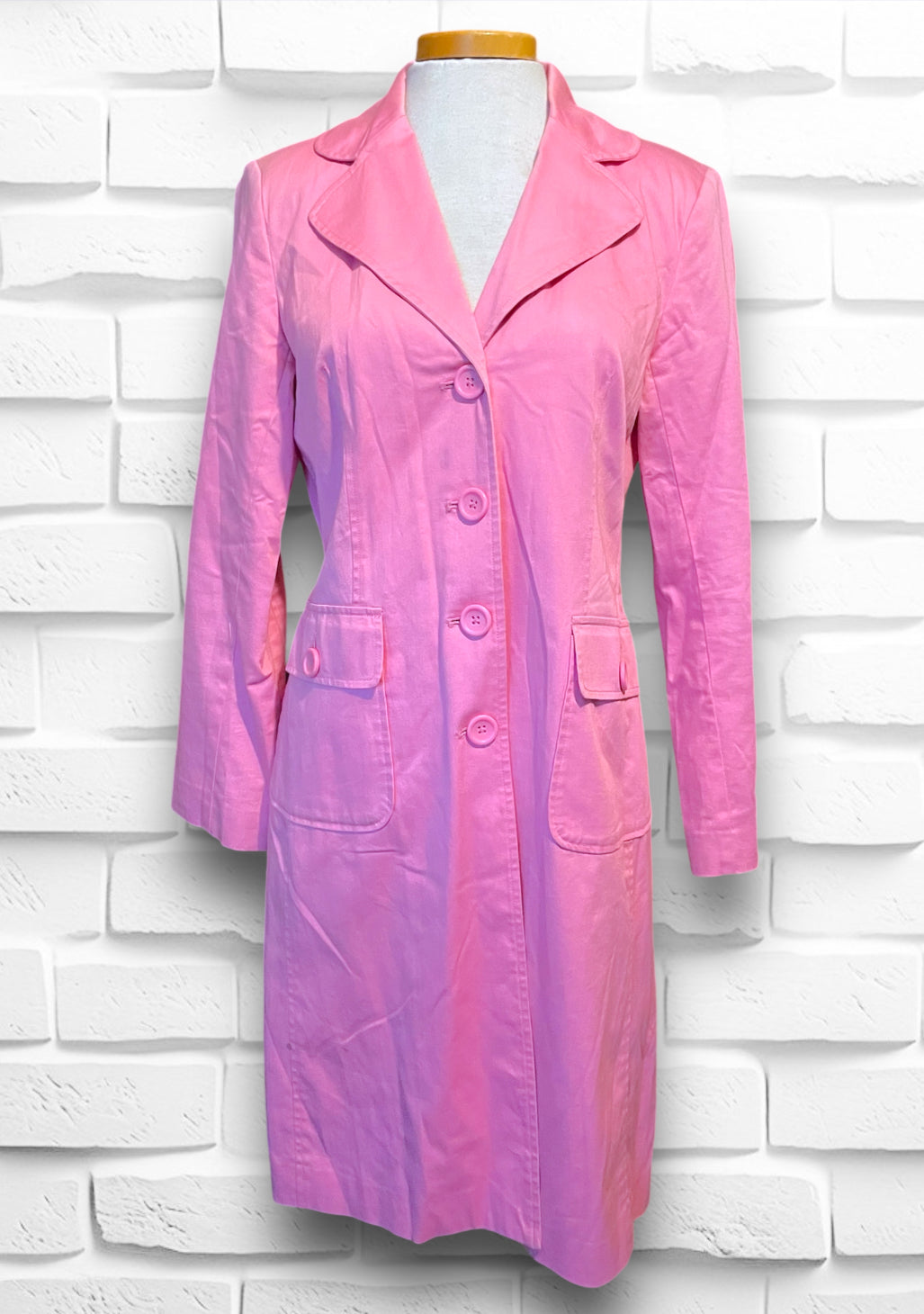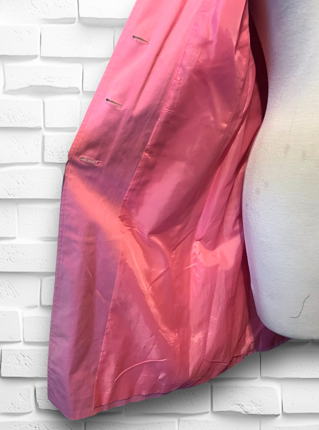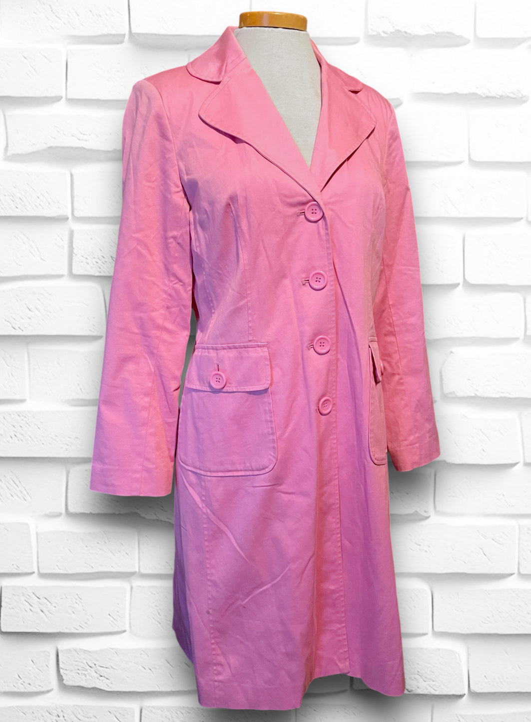 This is a beautiful soft pink long button up trench coat.  Label is “Willi Smith” 98% cotton 2% spandex so has a bit of stretch.  Size is Small and “Made in Hong Kong” Fully lined with a pink satin polyester lining.  Has a small shoulder pad, but not huge, just enough to give structure. Has two flap over button close pockets on the front.  In really great condition, no holes or stitching issues.  Has a small spot on the right side bottom that is aprox 1.5 cm by 1/2 cm but not noticeable while wearing.