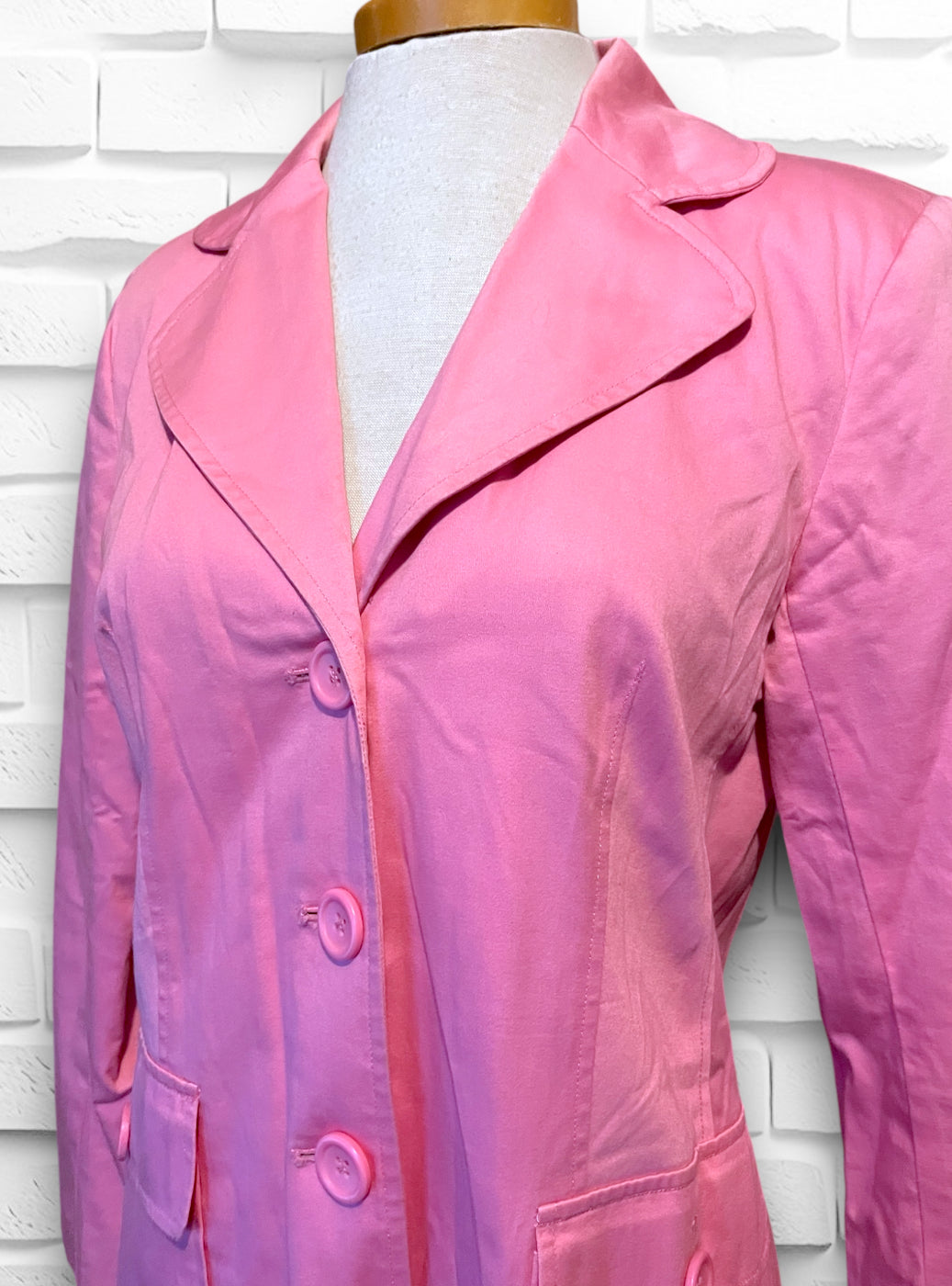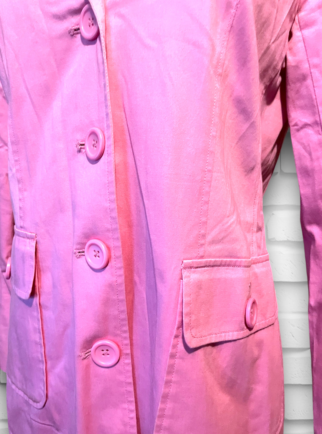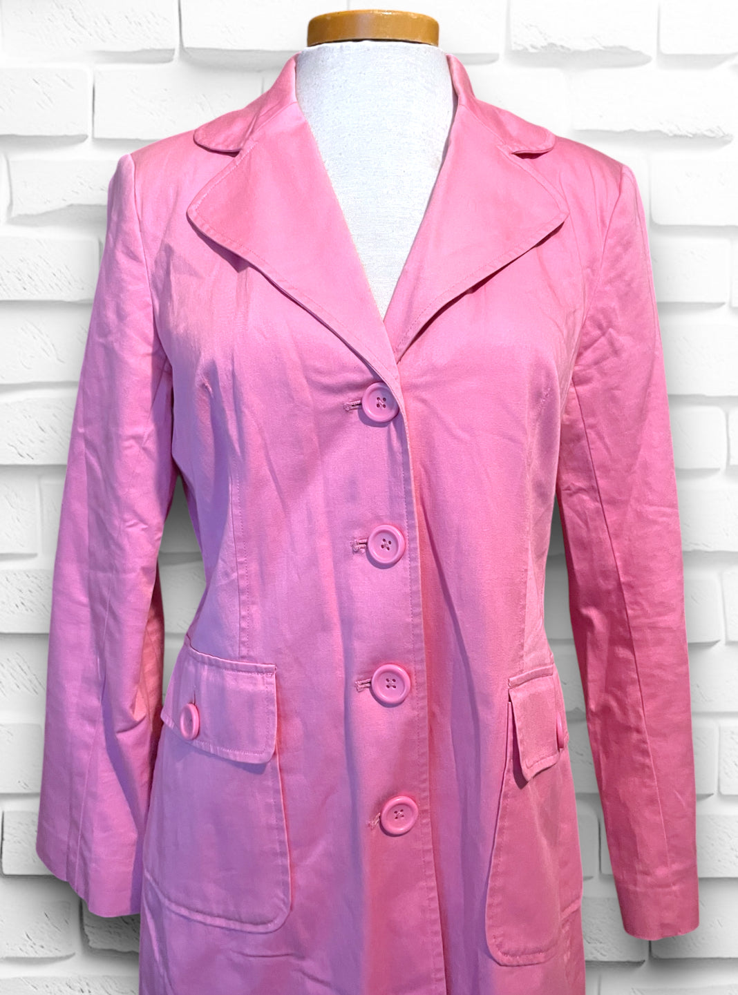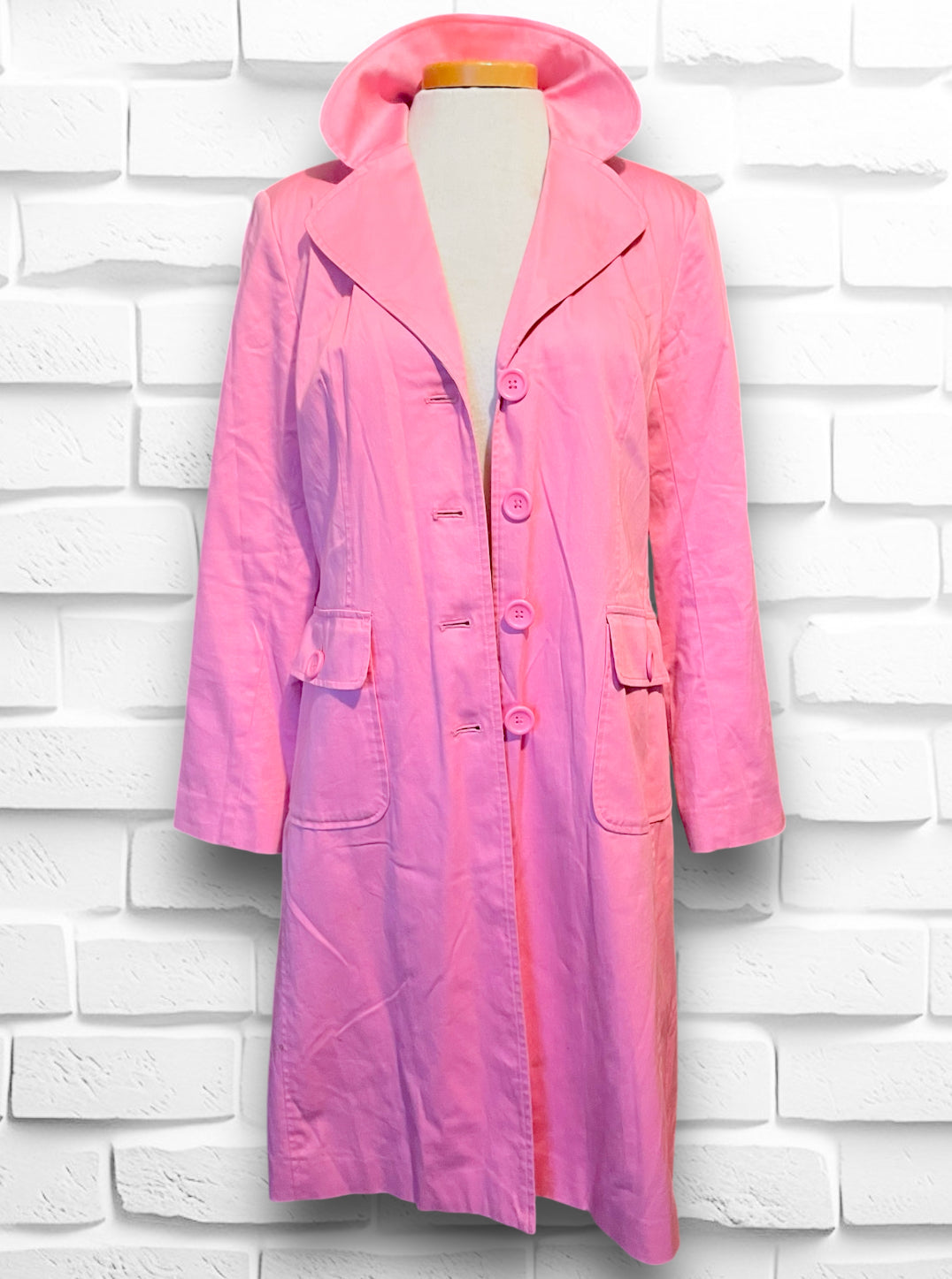 This is a beautiful soft pink long button up trench coat.  Label is “Willi Smith” 98% cotton 2% spandex so has a bit of stretch.  Size is Small and “Made in Hong Kong” Fully lined with a pink satin polyester lining.  Has a small shoulder pad, but not huge, just enough to give structure. Has two flap over button close pockets on the front.  In really great condition, no holes or stitching issues.  Has a small spot on the right side bottom that is aprox 1.5 cm by 1/2 cm but not noticeable while wearing.