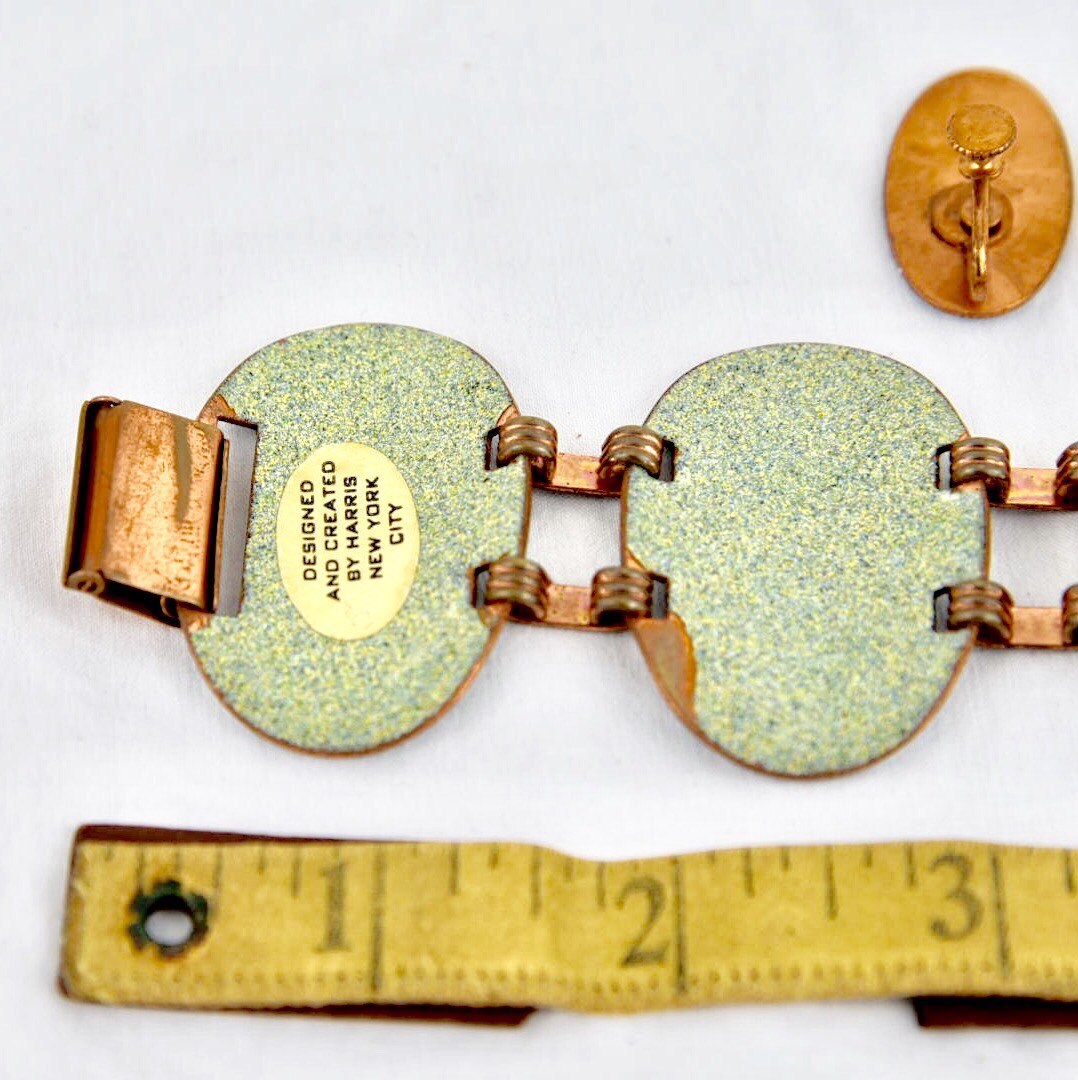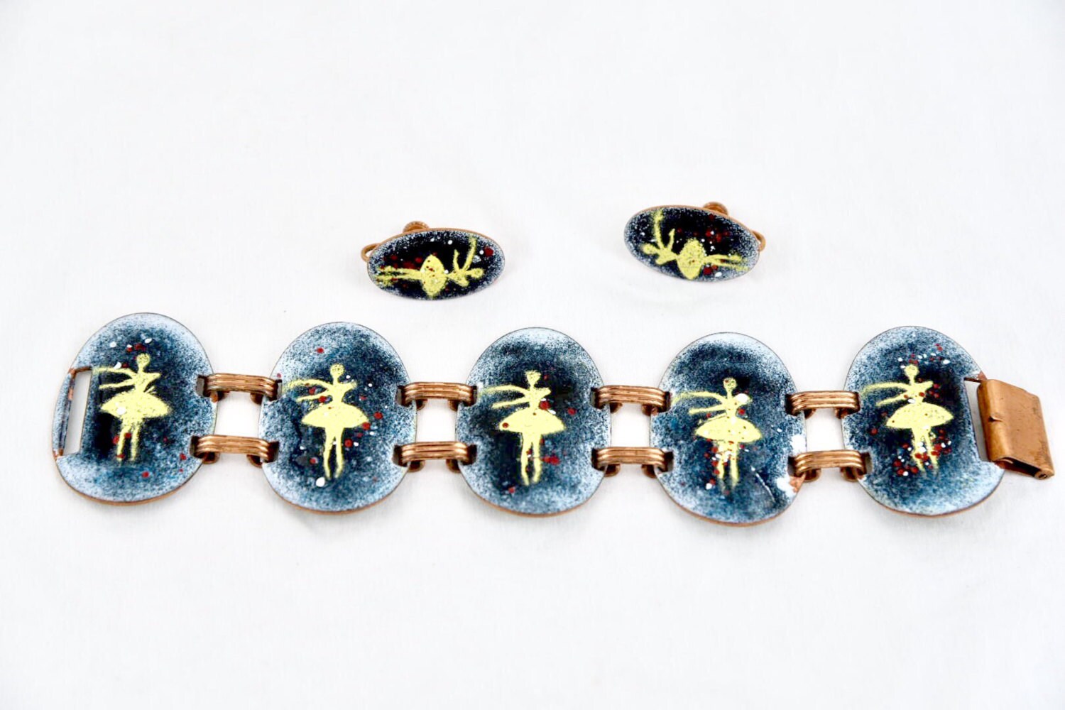 Vintage Ballerina Glass Enamel Copper Link Bracelet & Earring set by designer Harris New York City