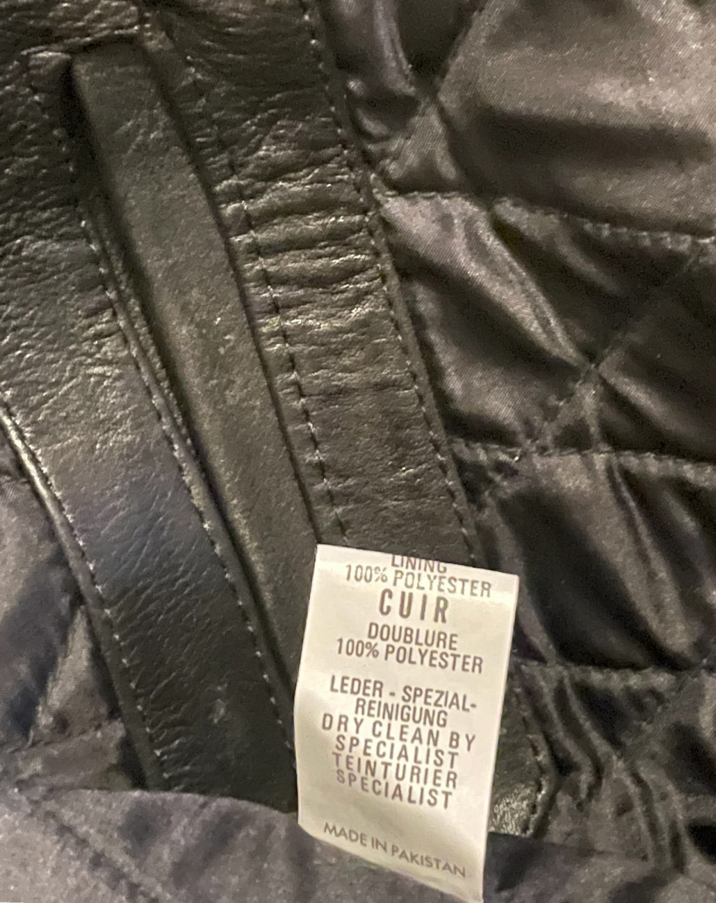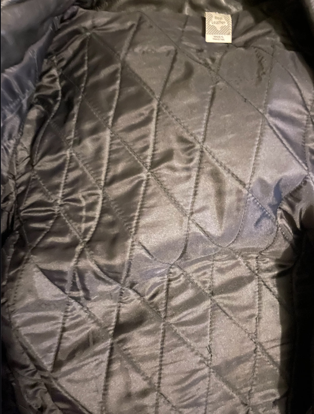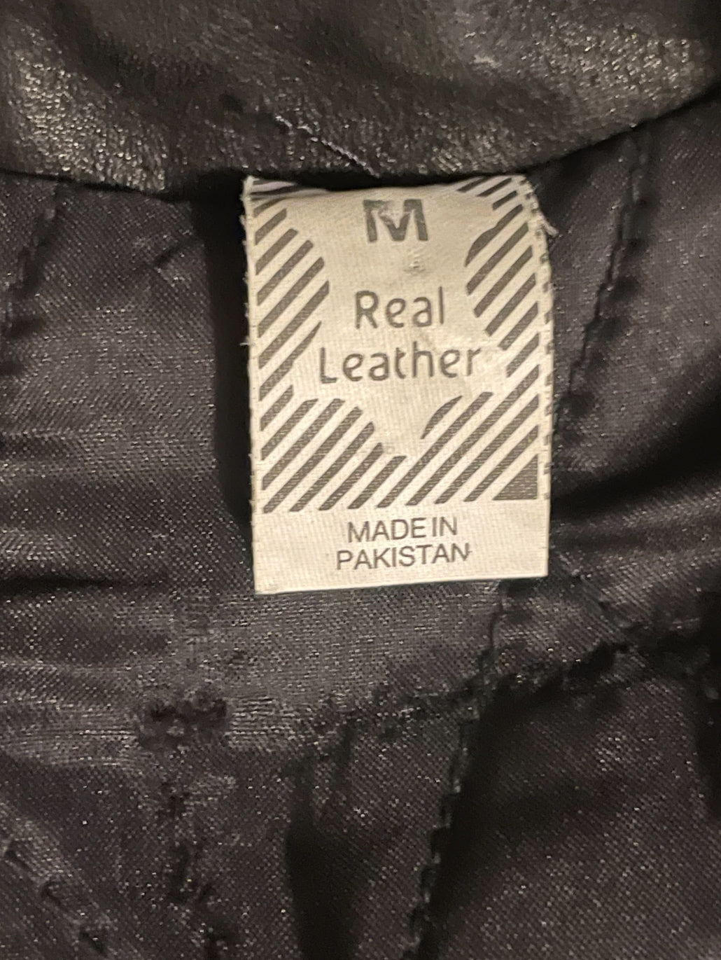 Amazing high quality heavy quilting lined black leather motorcycle jacket. In perfect condition inside and out. Very warm and heavy. Has a thick quilted lining. Made in Pakistan. No label name. Lots of zippers and pockets, all real no faux pockets. Size M.