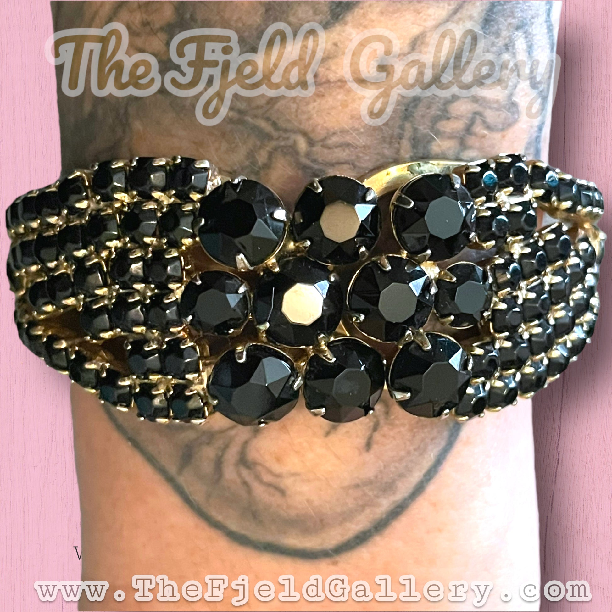 Vintage Black Prong Set Crystal Gold Hinged Clamper Bangle Bracelet