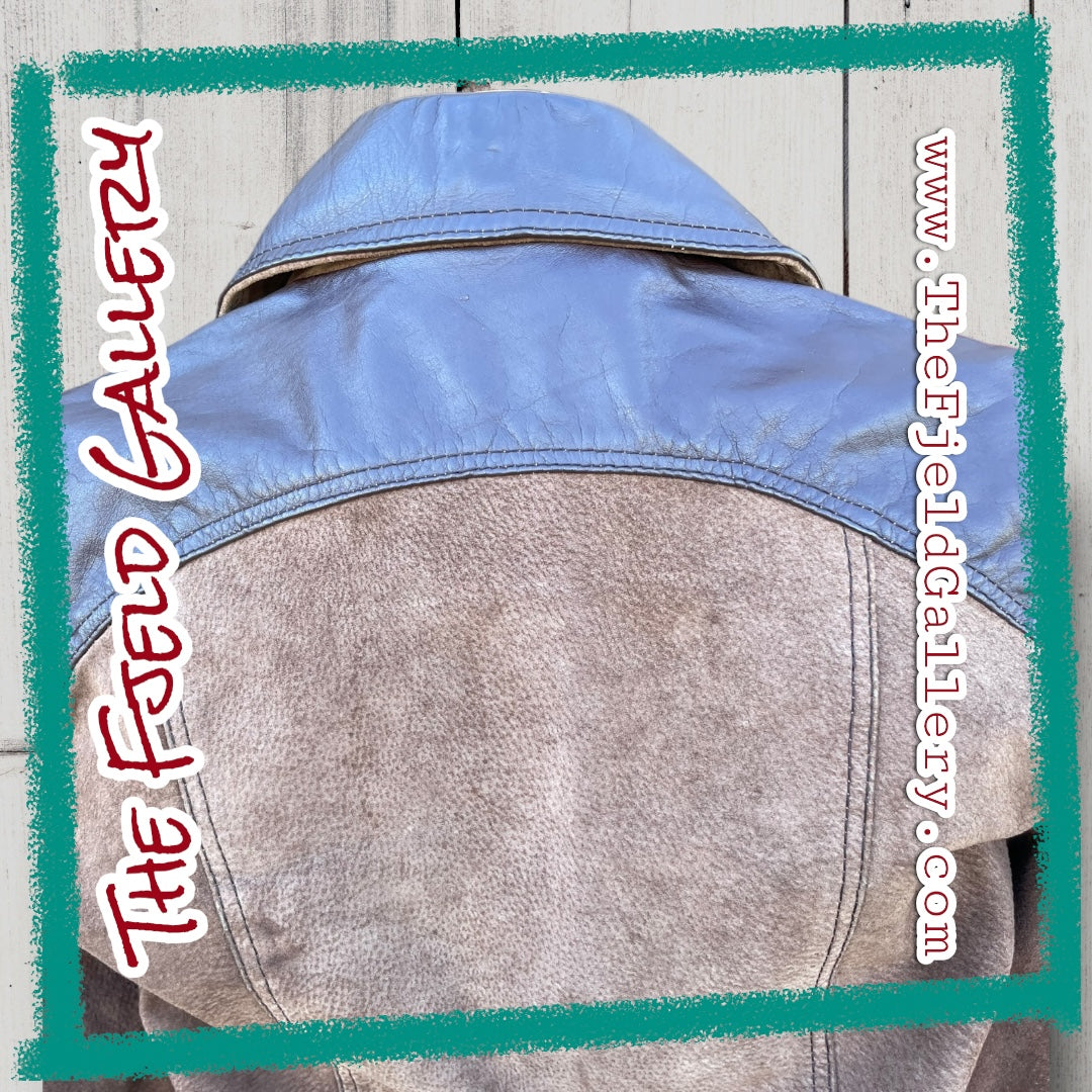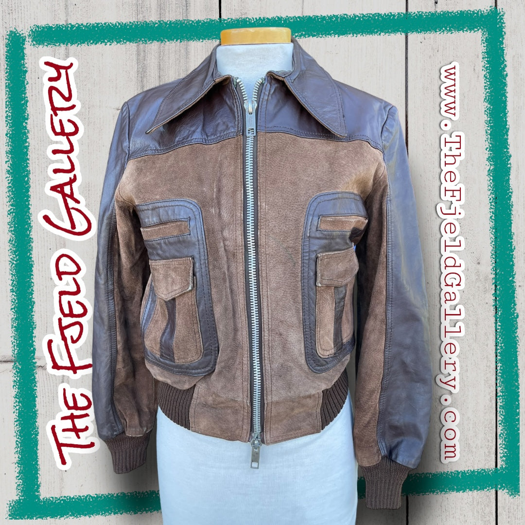 Super cool retro brown leather, suede and knit cuff and waist detail bomber style jacket with a double zipper and pockets. Great condition with perfect black lining. Kian Kao Co. Made in the USA. Size Large. Zipper on the bottom does tend to stick, but works.