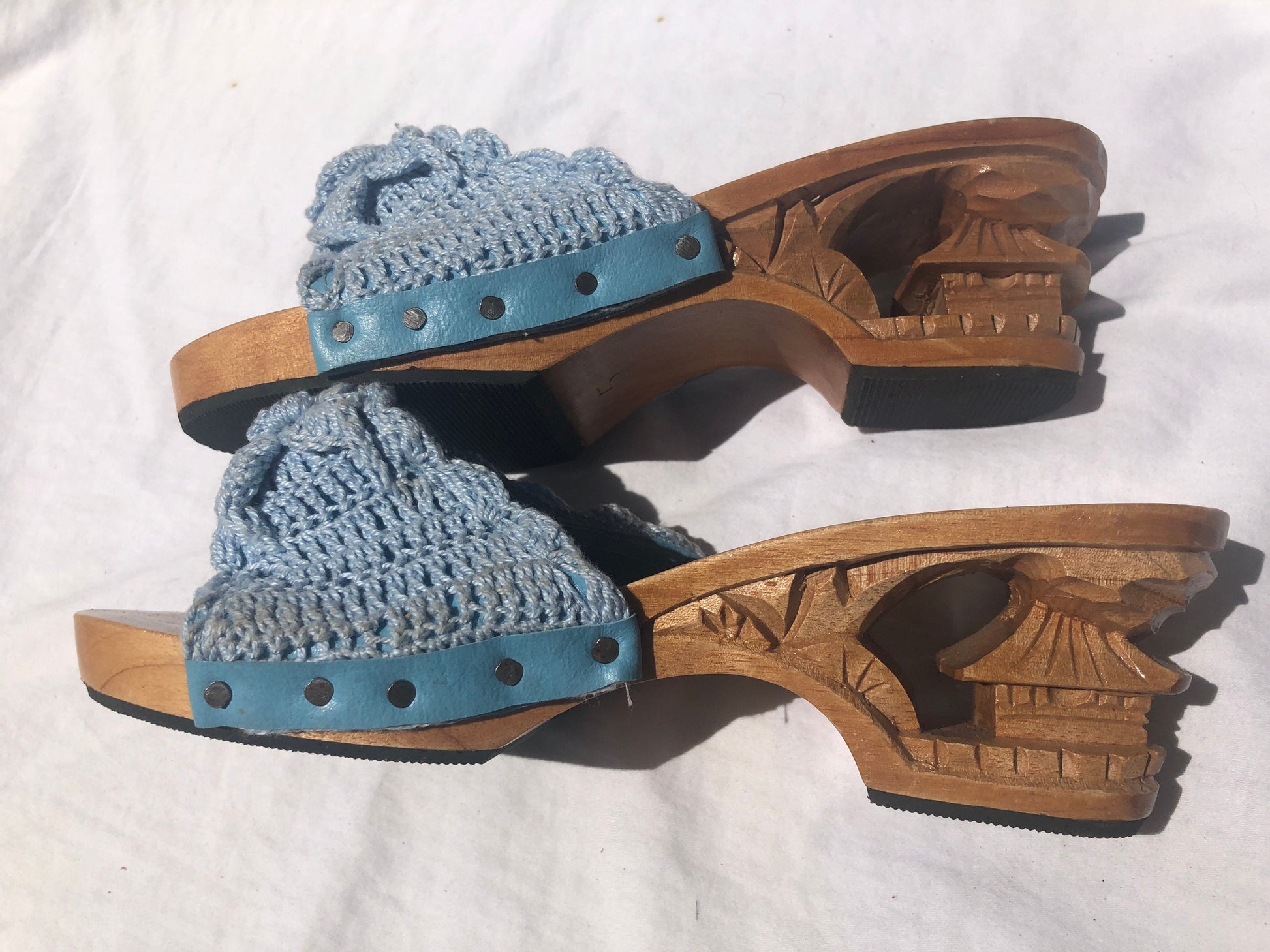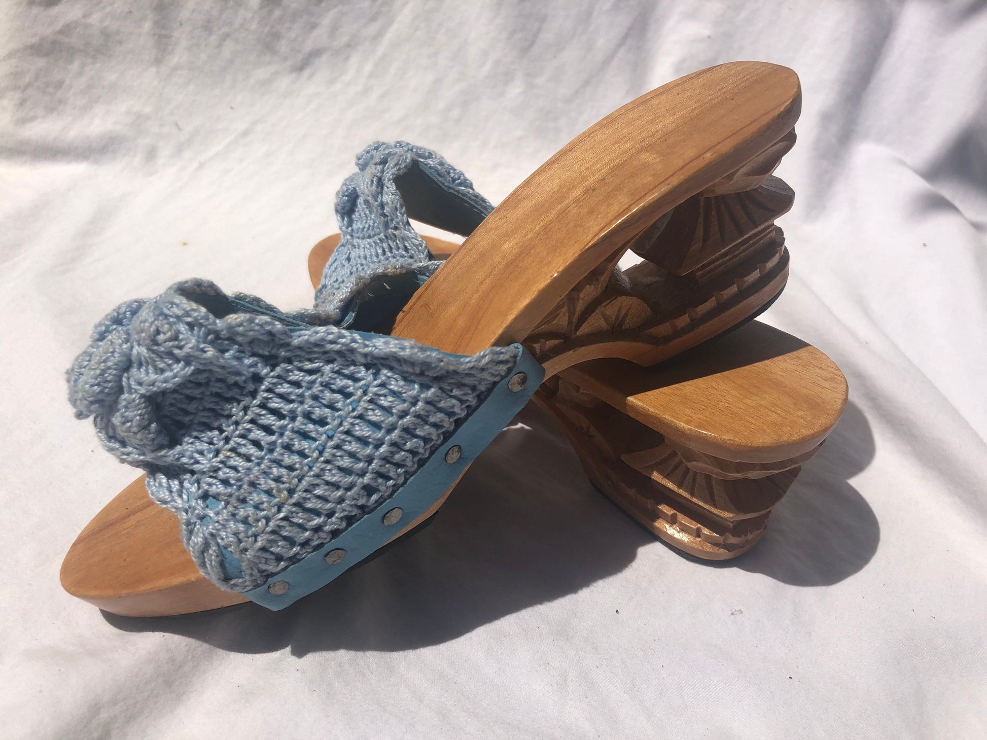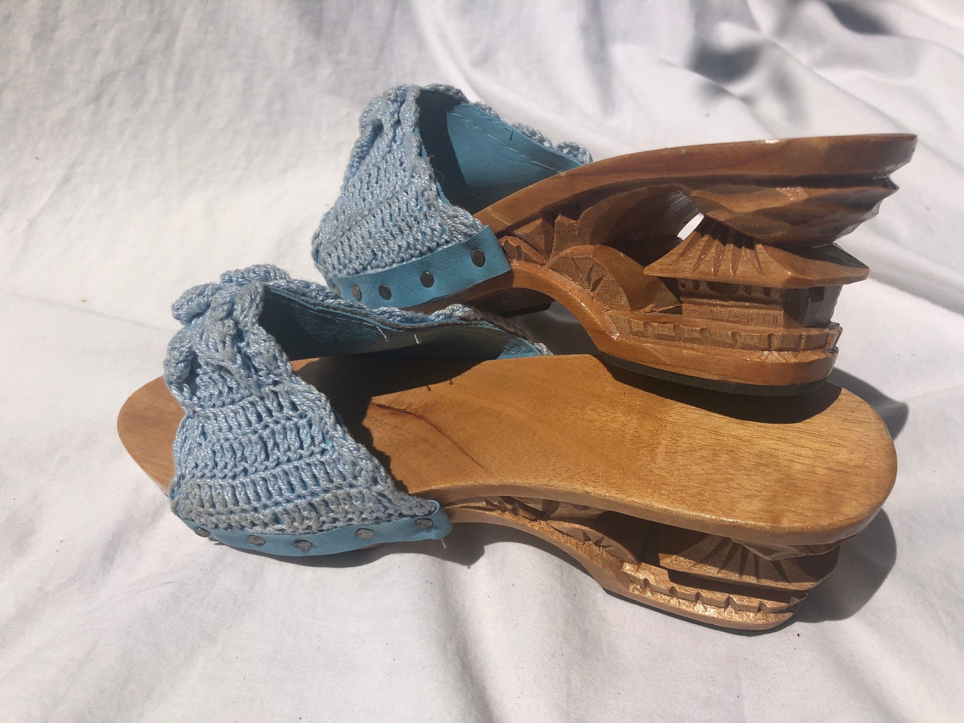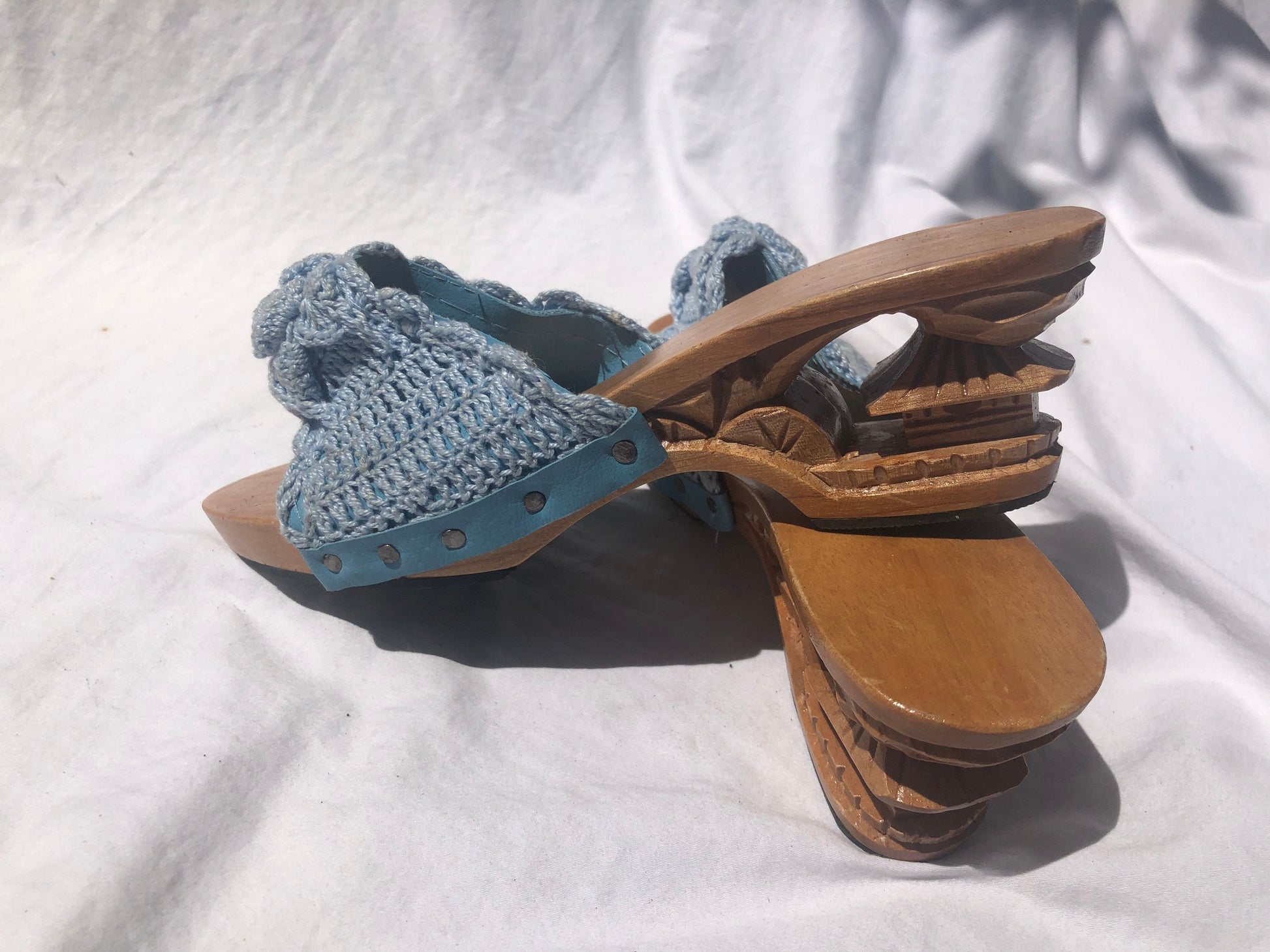 Vintage Carved Bamboo Pagoda Heel Wedges with Light Blue Knit Slides Size 5