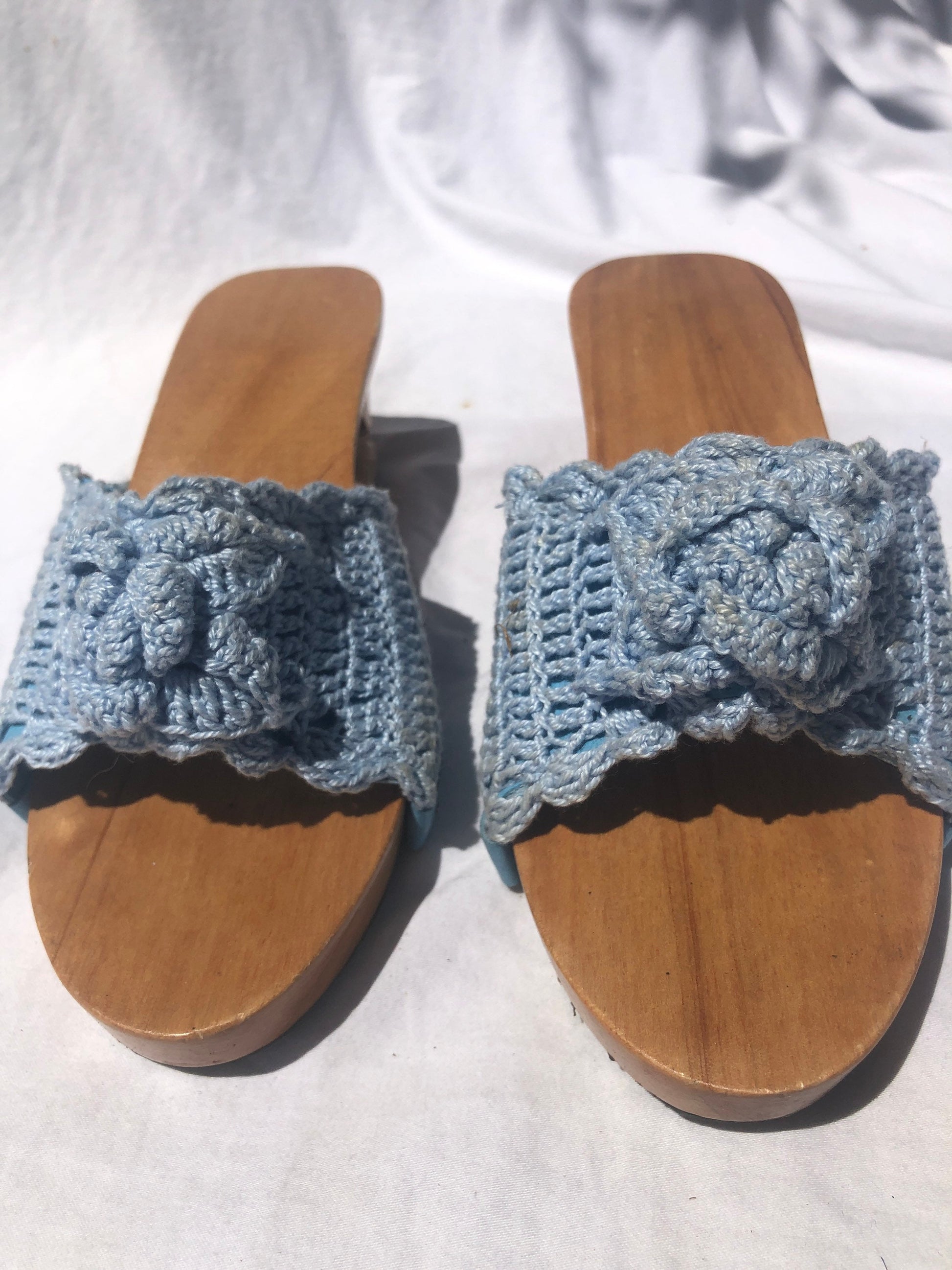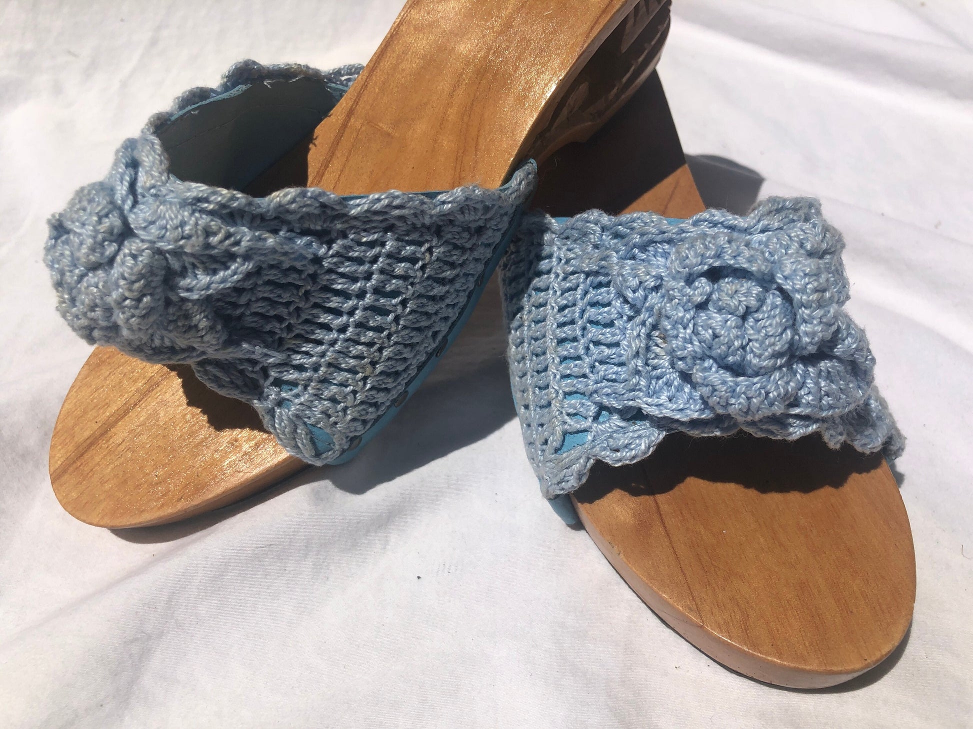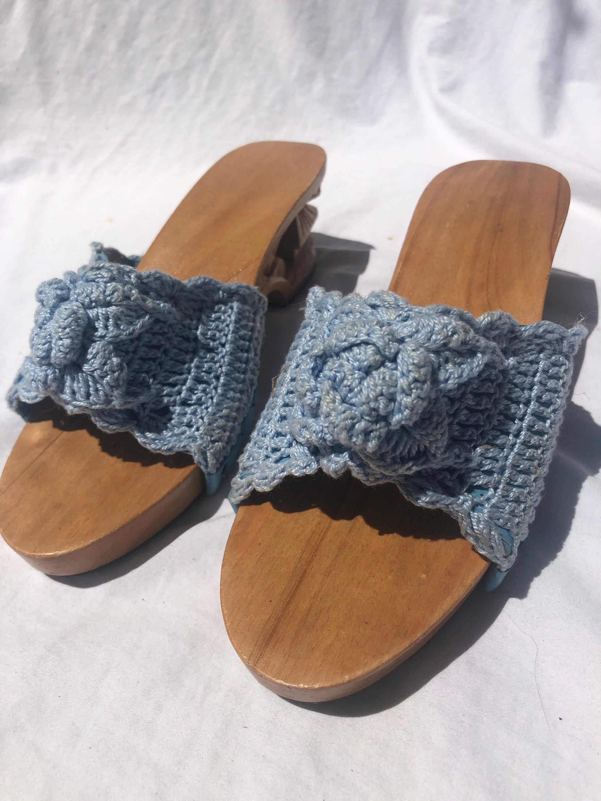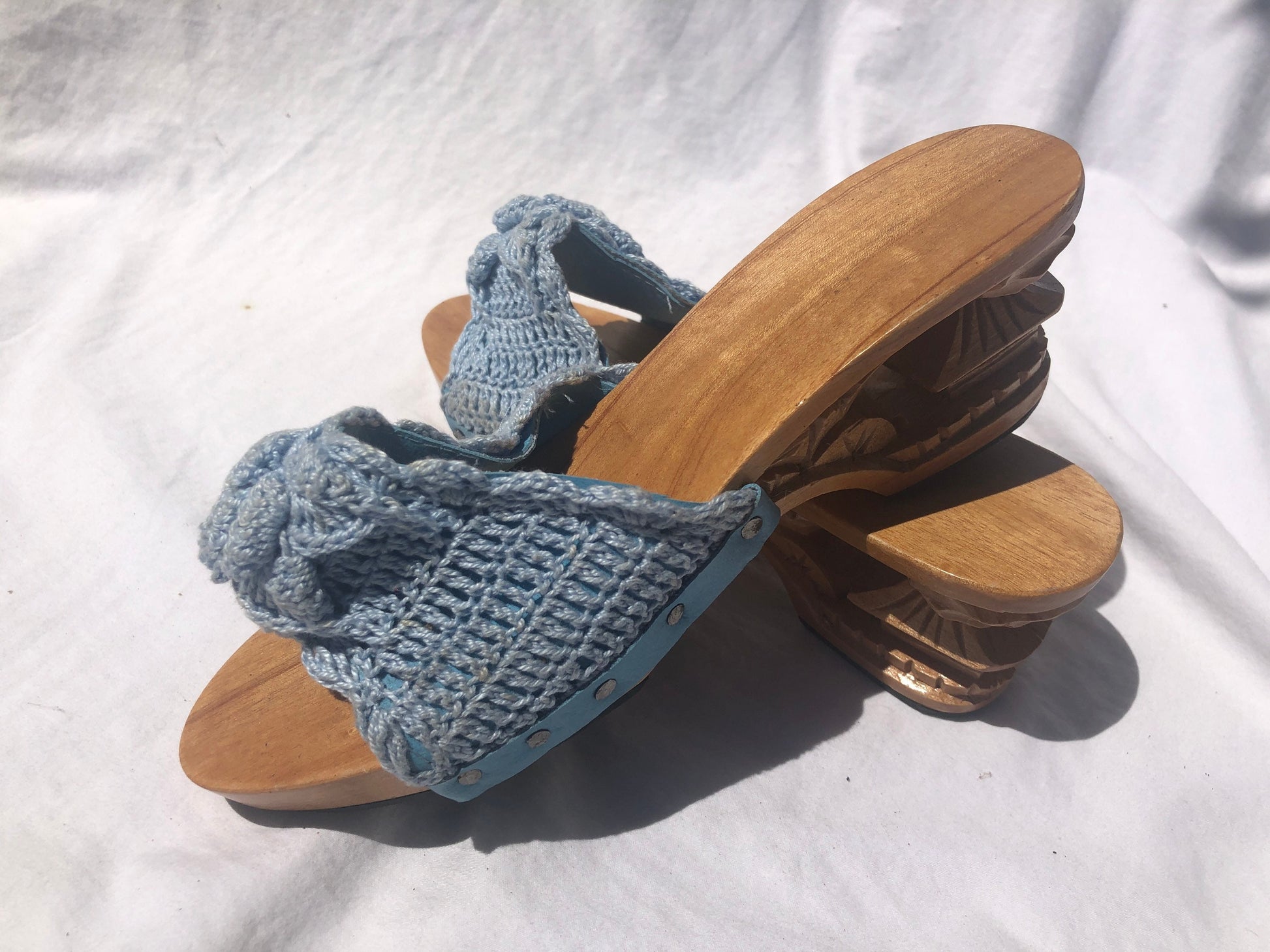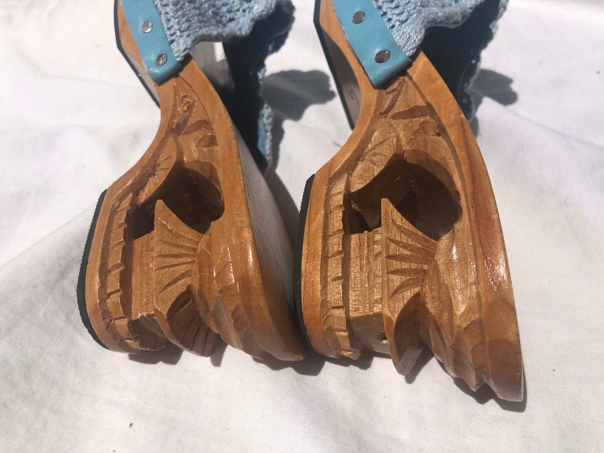 Vintage Carved Bamboo Pagoda Heel Wedges with Light Blue Knit Slides Size 5