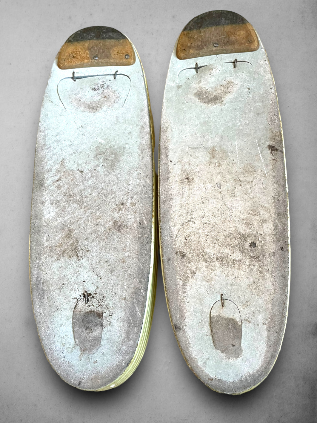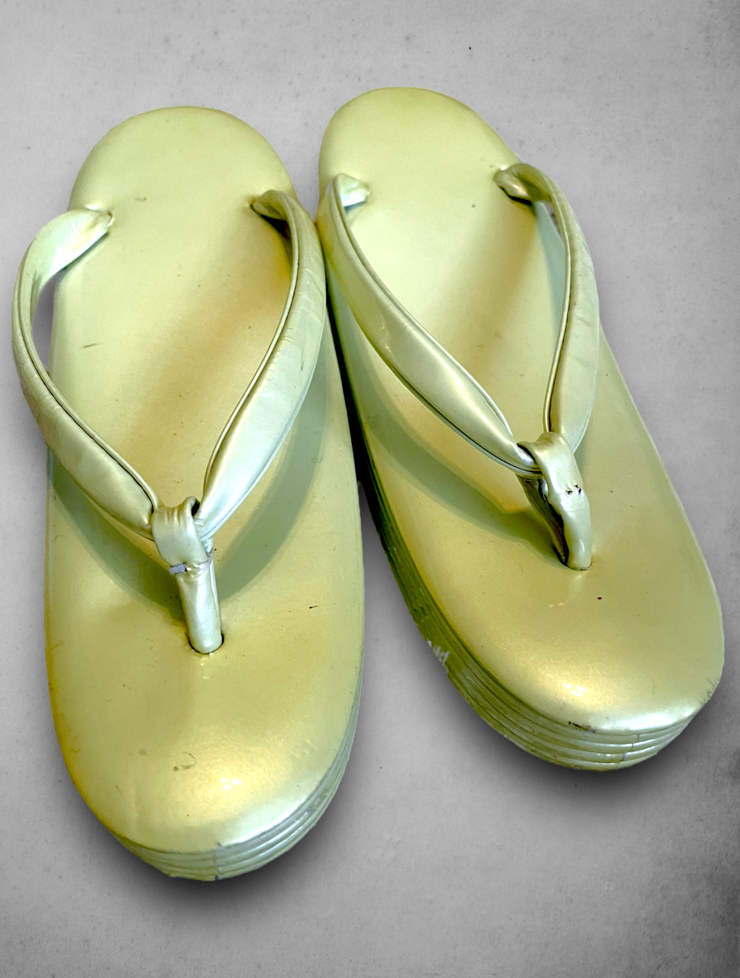 Beautiful vintage 1960’s yellow green chartreuse shiny asian, Japanese Geisha style flip flop sandal. Thong style between toe flip flop platform sandal. Material is slick and shiny plastic. No size or label anywhere but seems to be a size 6. Measures 9” toe to heel and 3” wide. No damage anywhere to shoe, bottoms in good shape.