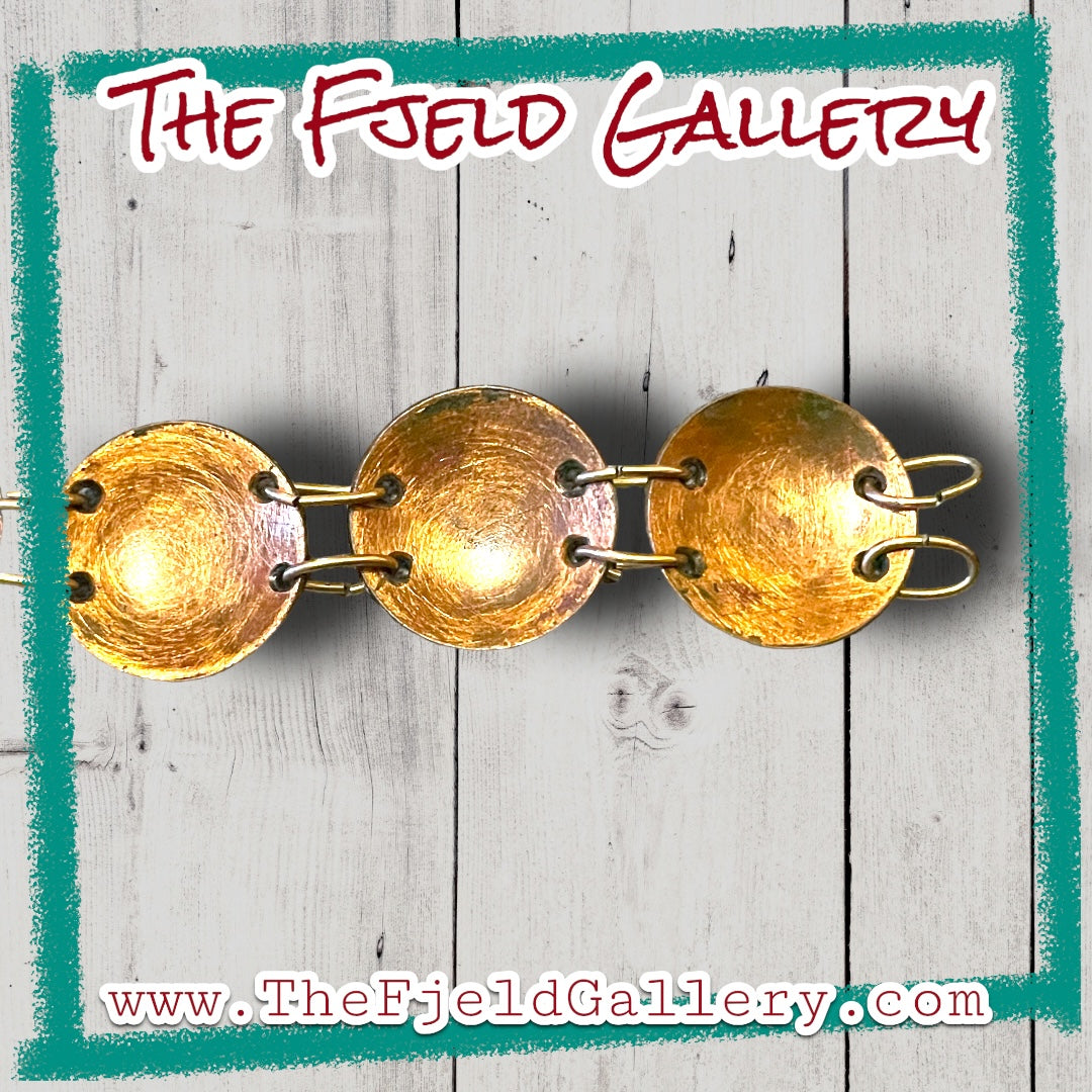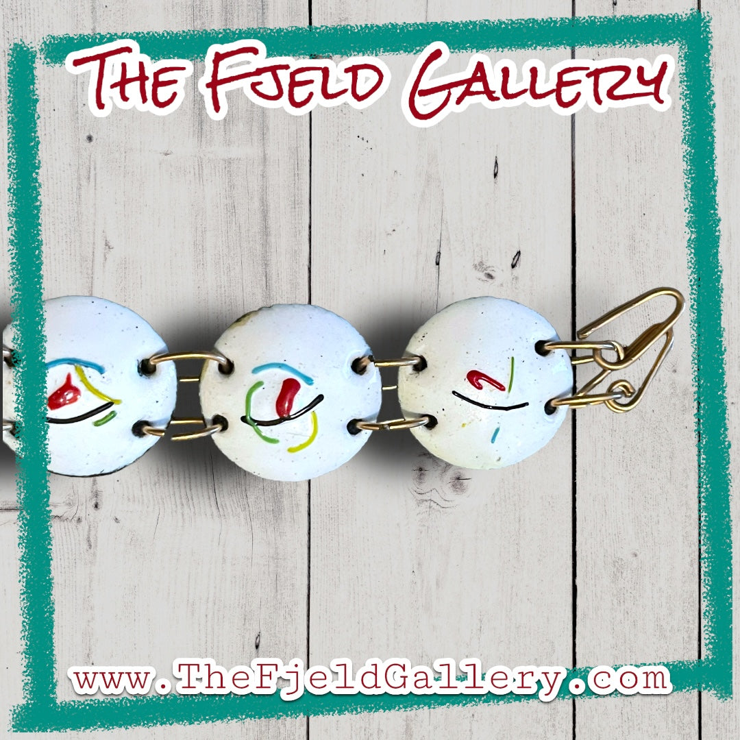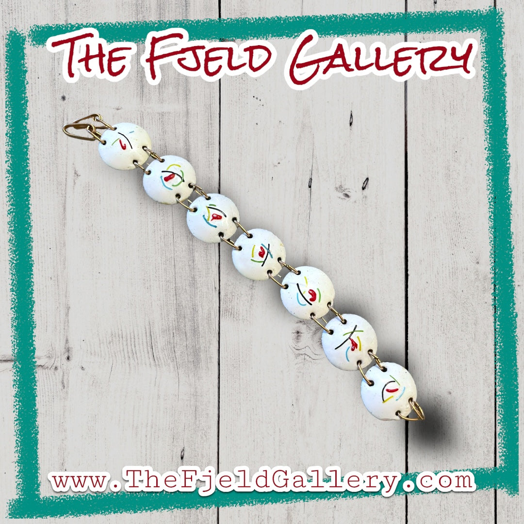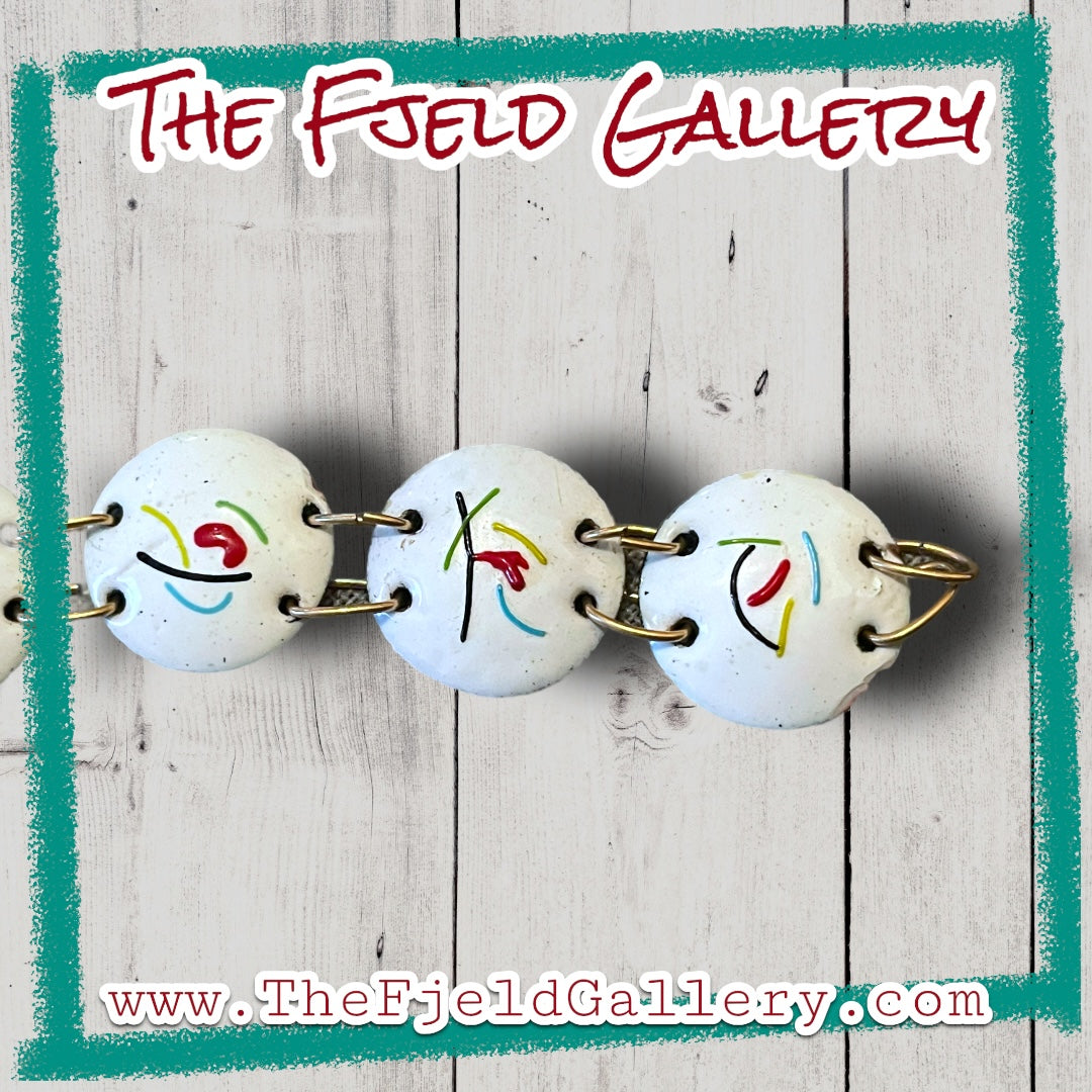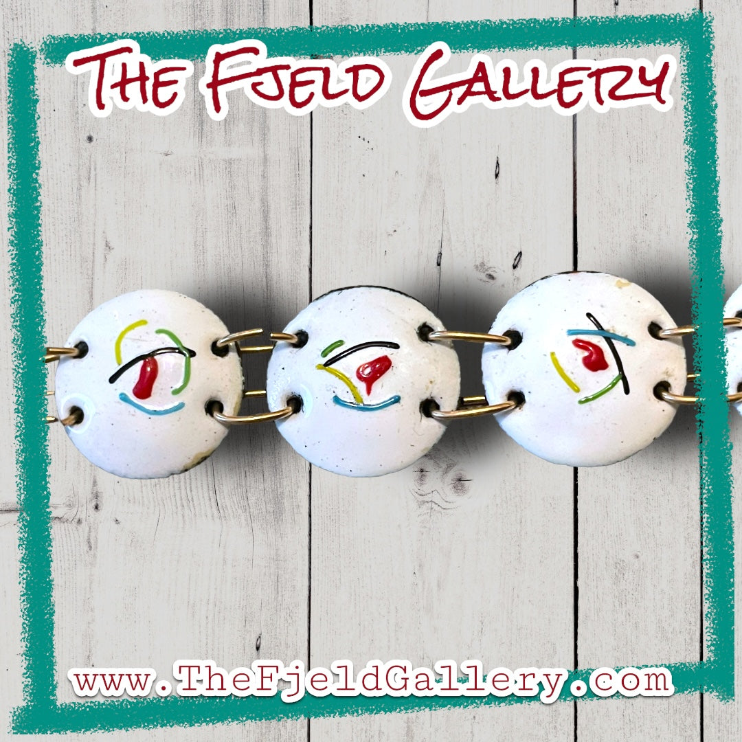 Beautiful and unique vintage arts and crafts enameled link bracelet. Circle copper links with white enamel background and red, chartreuse yellow, green, black & blue abstract line design. Copper enameled backs and double hook and eye style closure. 7” long
