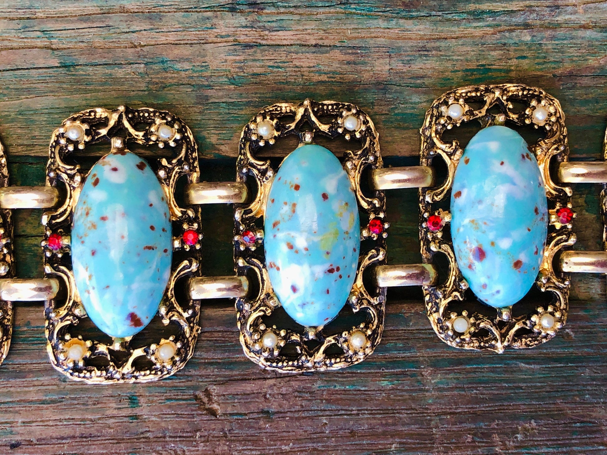 Gorgeous vintage turquoise Hubble art glass chunky fold over link gold bracelet and earring set. Robins egg blue Hubble art glass prong set in gold tone metal and surrounded by ruby red crystal rhinestones and faux pearls. Screwback earrings and fold over clasp bracelet; both secure. In really amazing condition, gold plated shiney gold tone with no chips or wear.