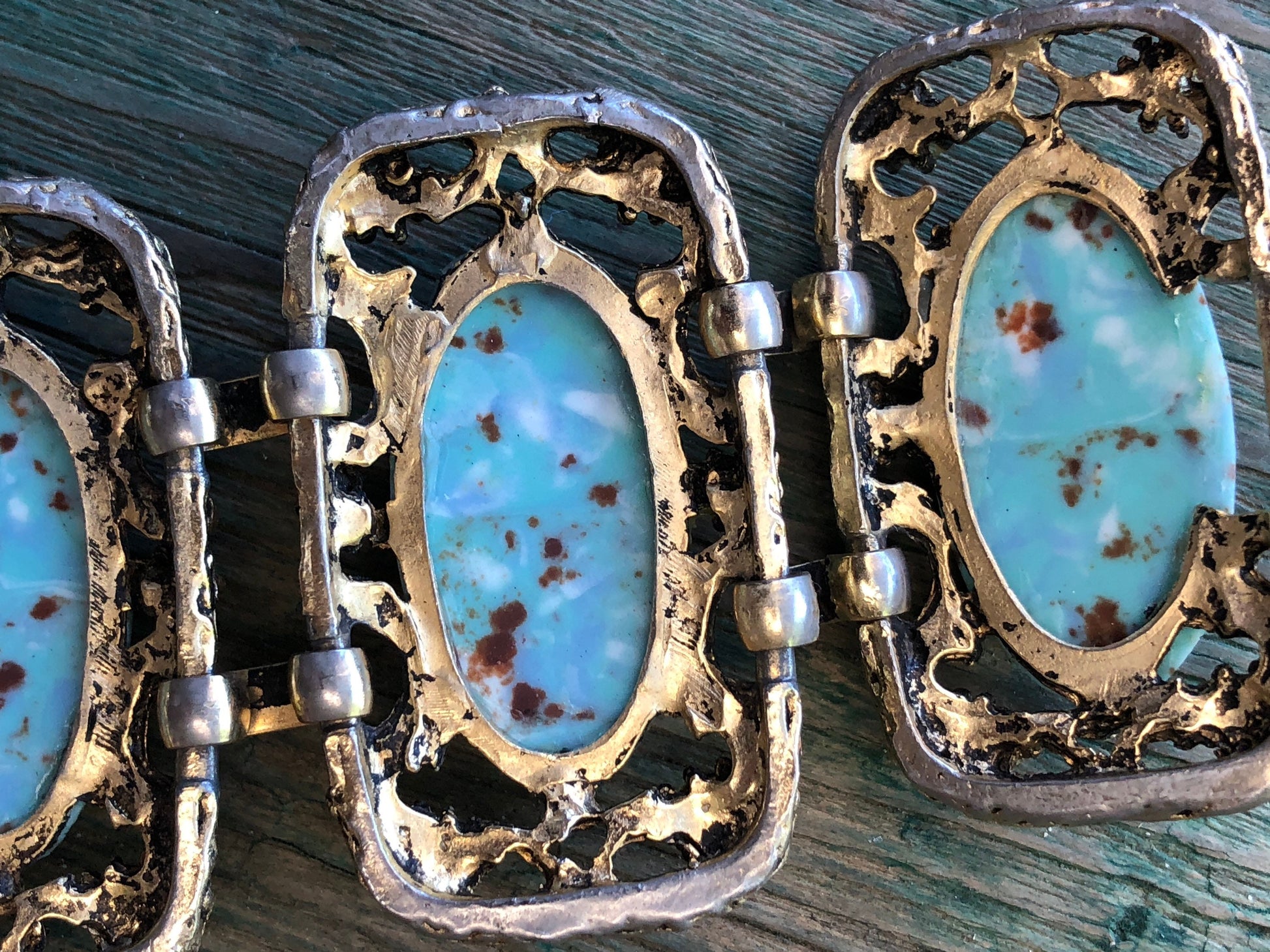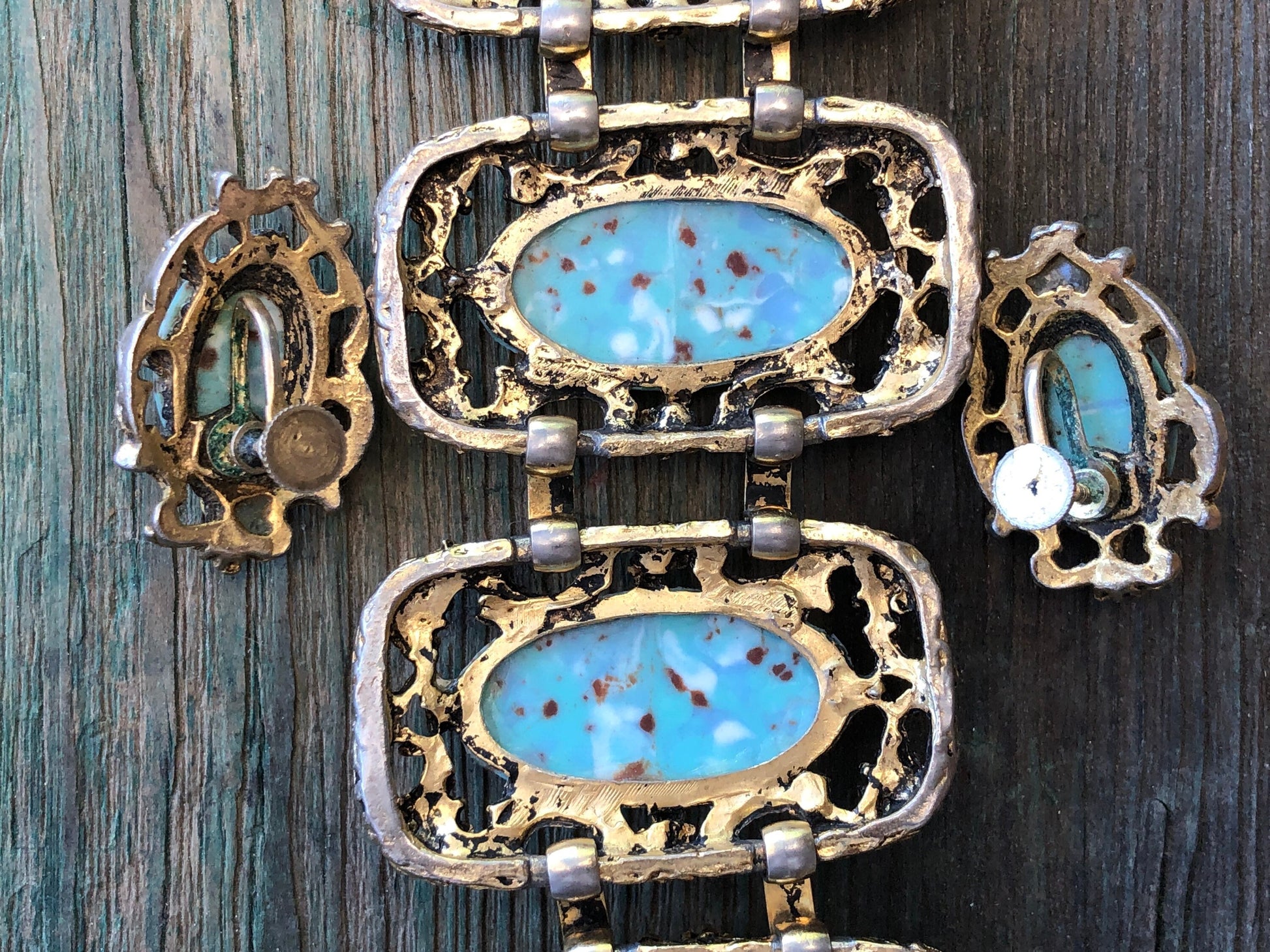 Turquoise Hubbell Glass Chunky Gold Panel Bracelet w/ Ruby Crystal & Earring Set