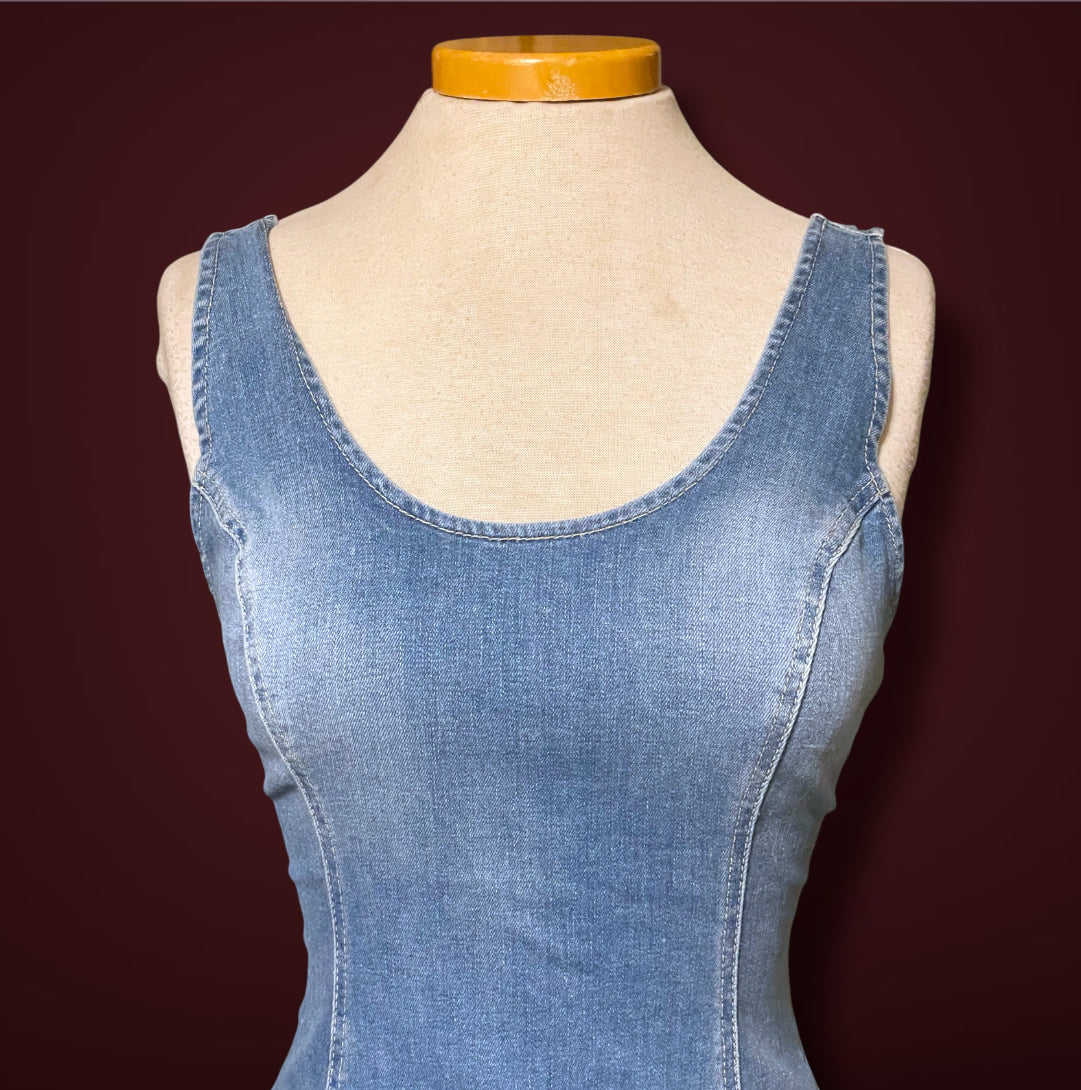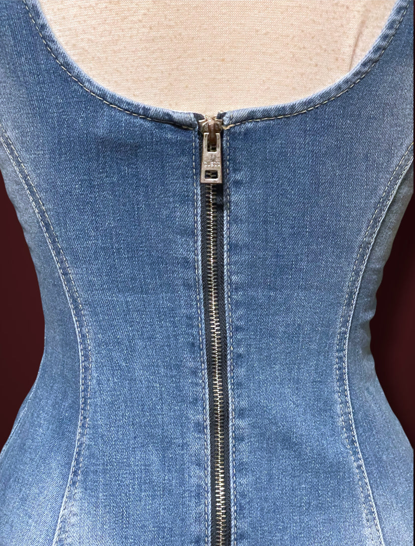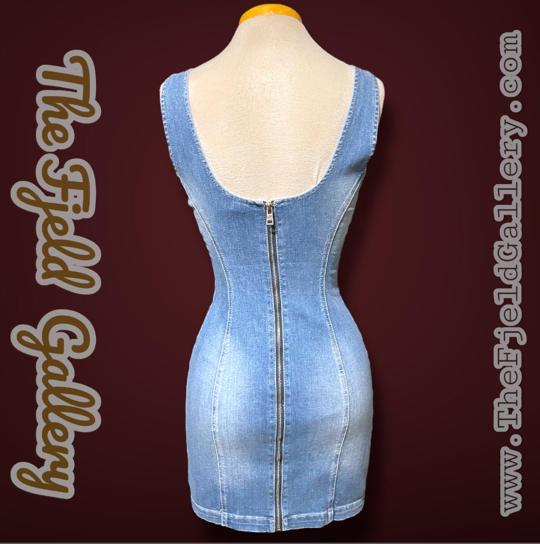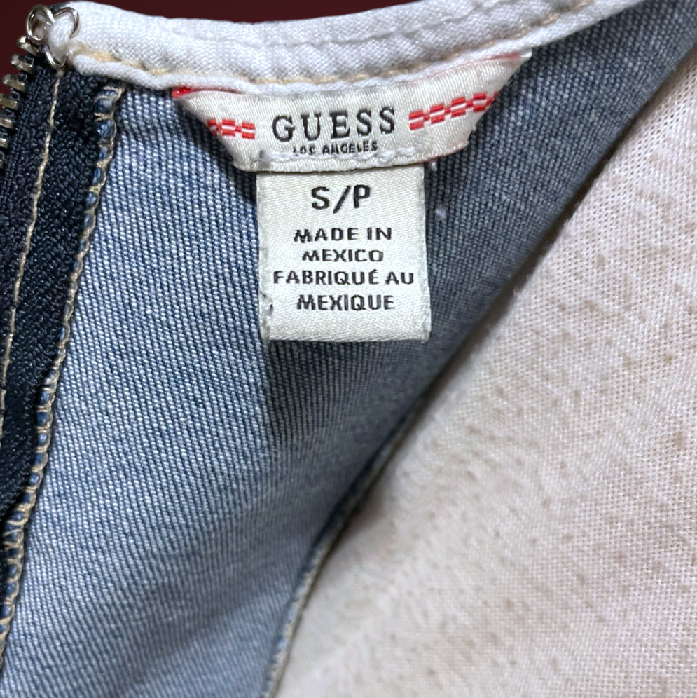 Sexy vintage Guess stretch denim tank top mini dress. Full metal zipper goes from top to bottom of the back side. Denim has stretch to it. Tag reads “Guess / Los Angeles” Size tag reads “S/P” & “Made in Mexico”