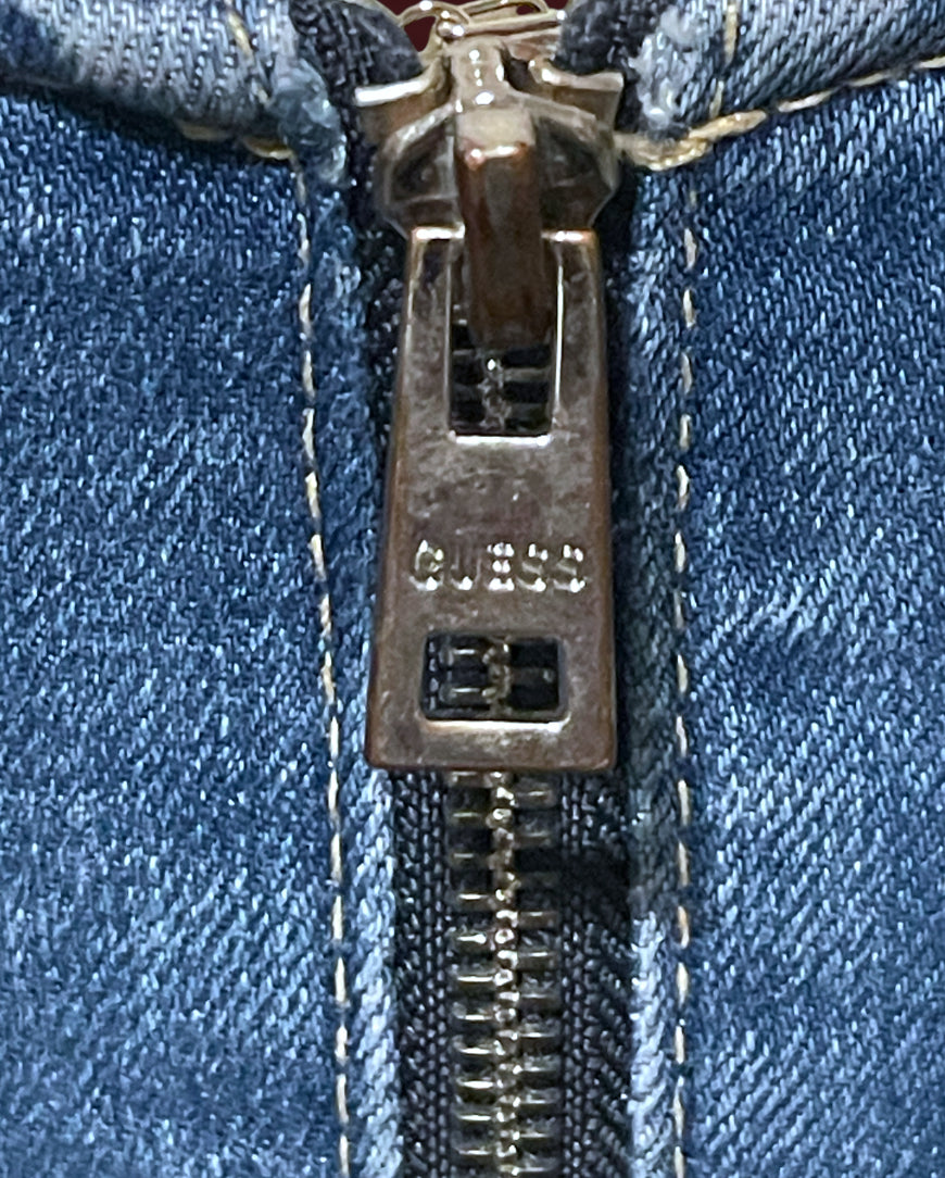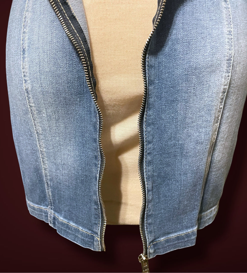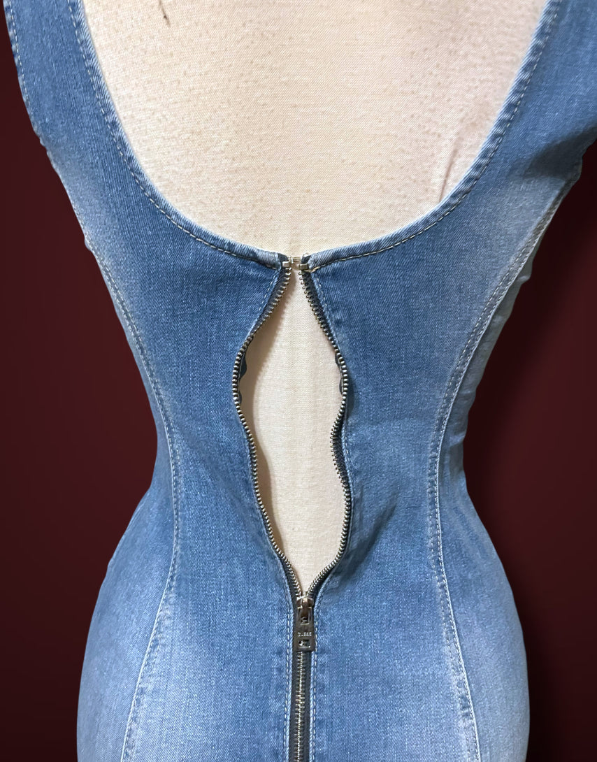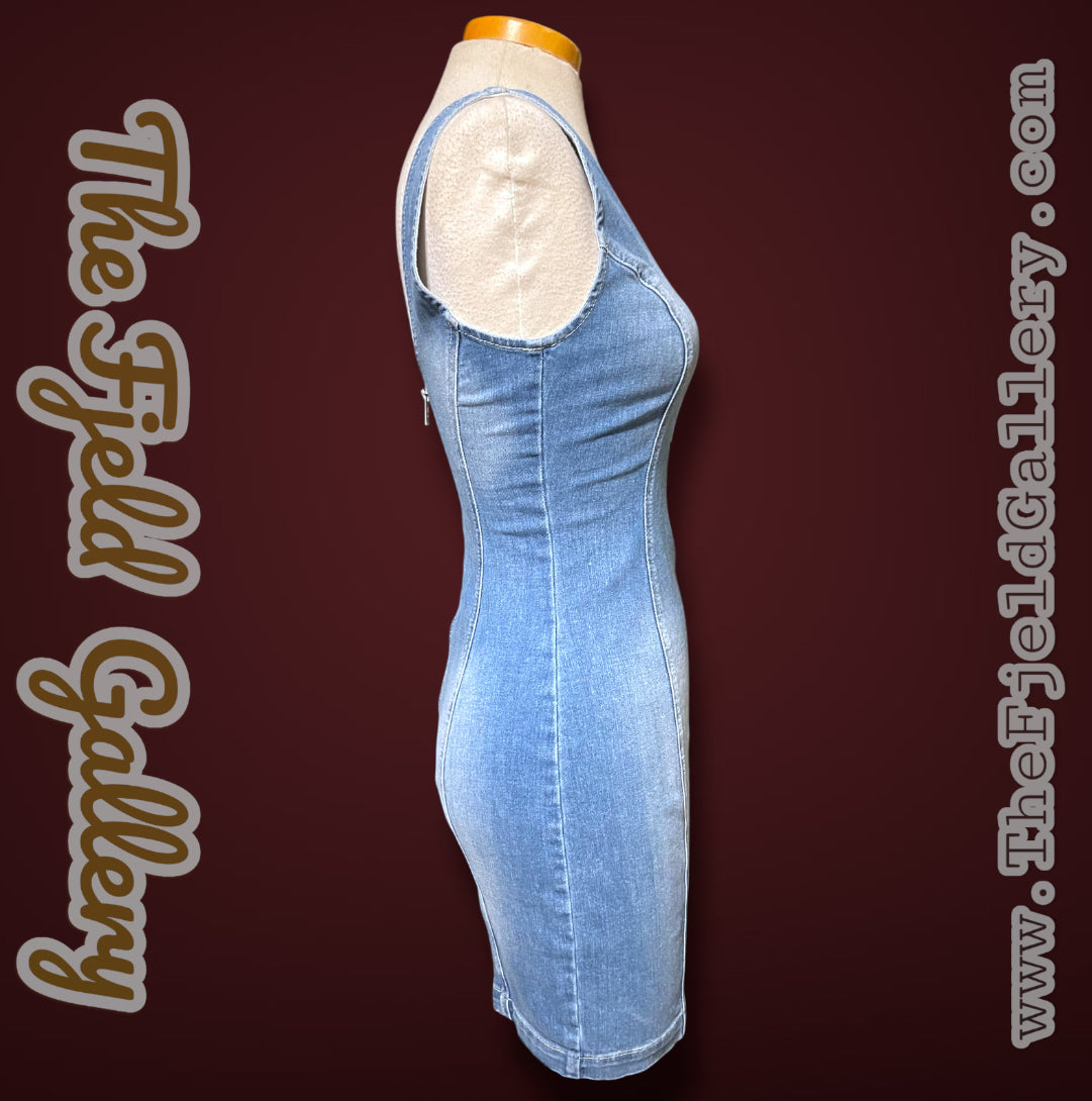 Sexy vintage Guess stretch denim tank top mini dress. Full metal zipper goes from top to bottom of the back side. Denim has stretch to it. Tag reads “Guess / Los Angeles” Size tag reads “S/P” & “Made in Mexico”