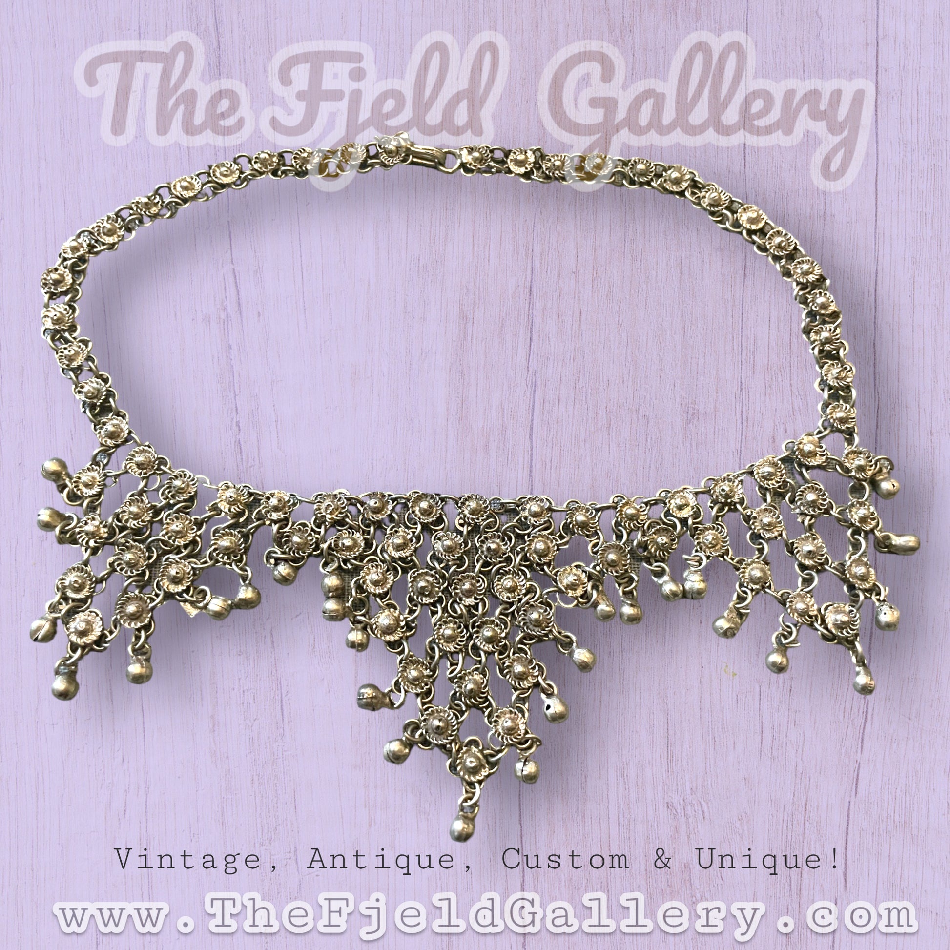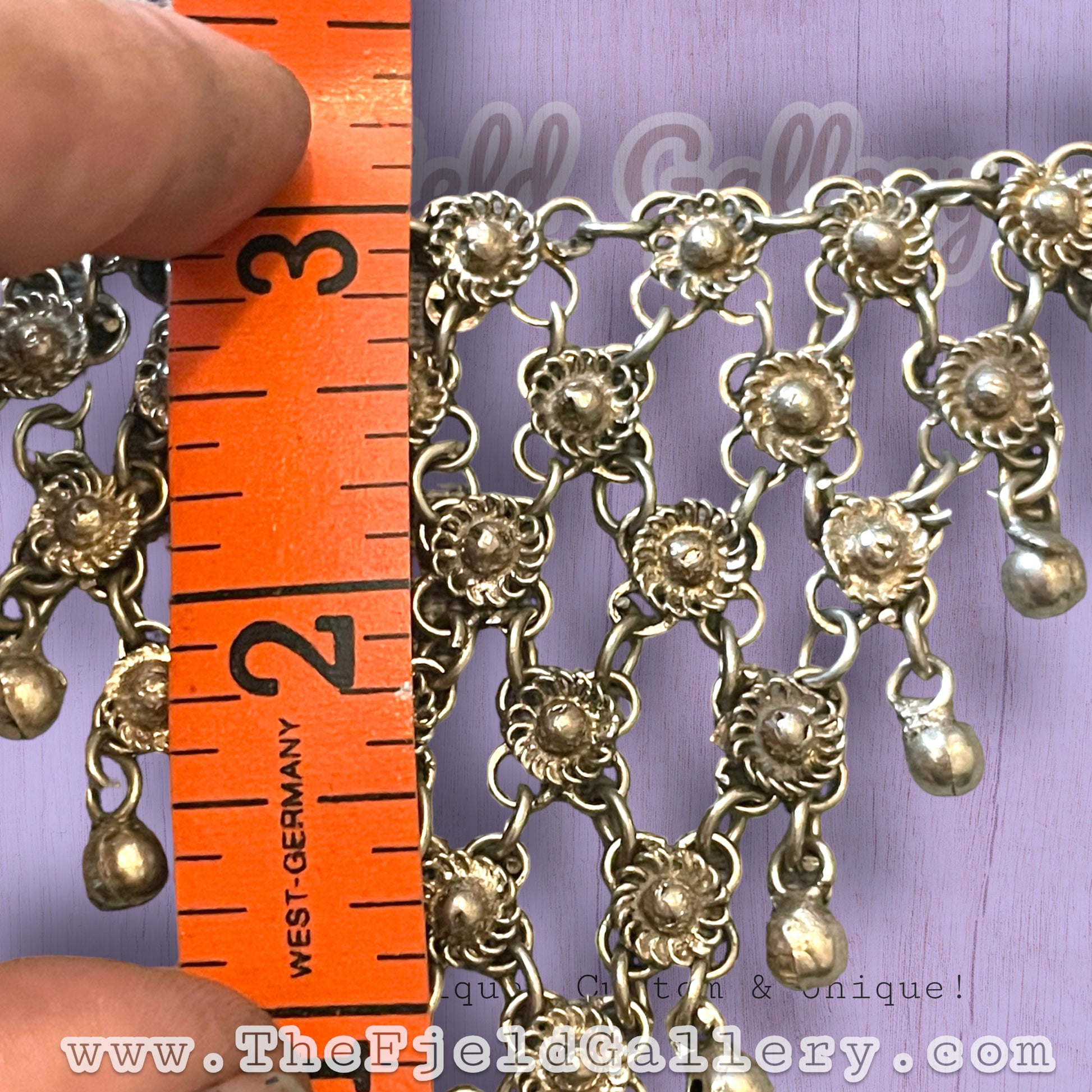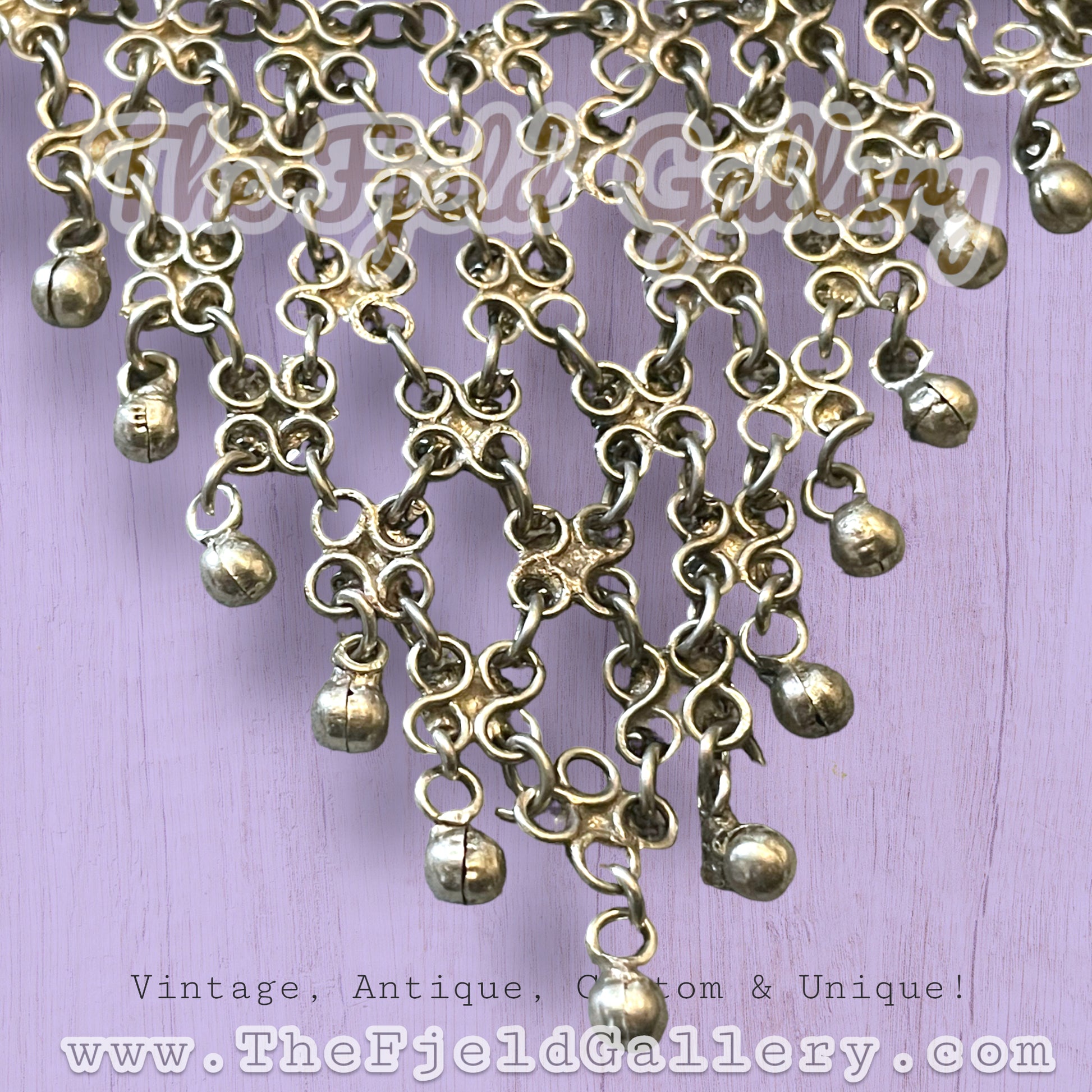 Beautiful unique vintage Indian bellydance style necklace. Silver flower design links connected into triangular shapes. Makes a beautiful jingling sound as it moves.