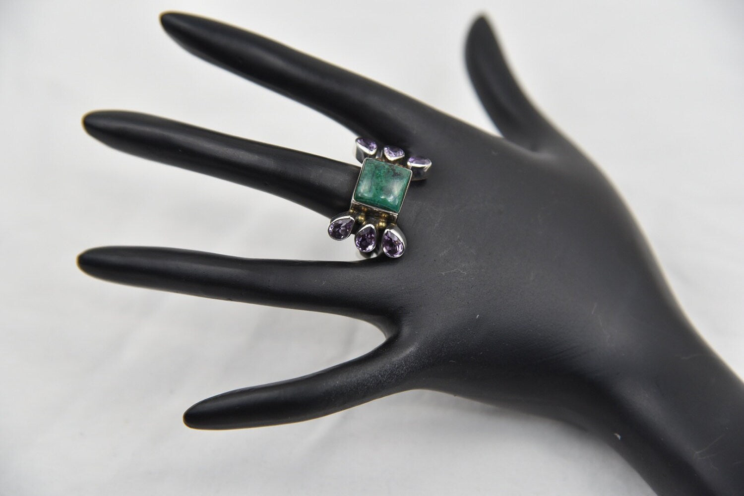 This is a beautiful vintage sterling silver ring with a square bezel set Chrysocolla gemstone surrounded by 3 teardrop faceted amethyst gemstones on each side of the central stone. The ring is signed 925 NB India.