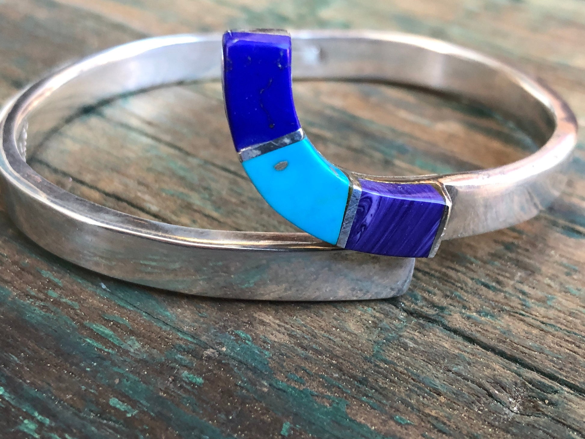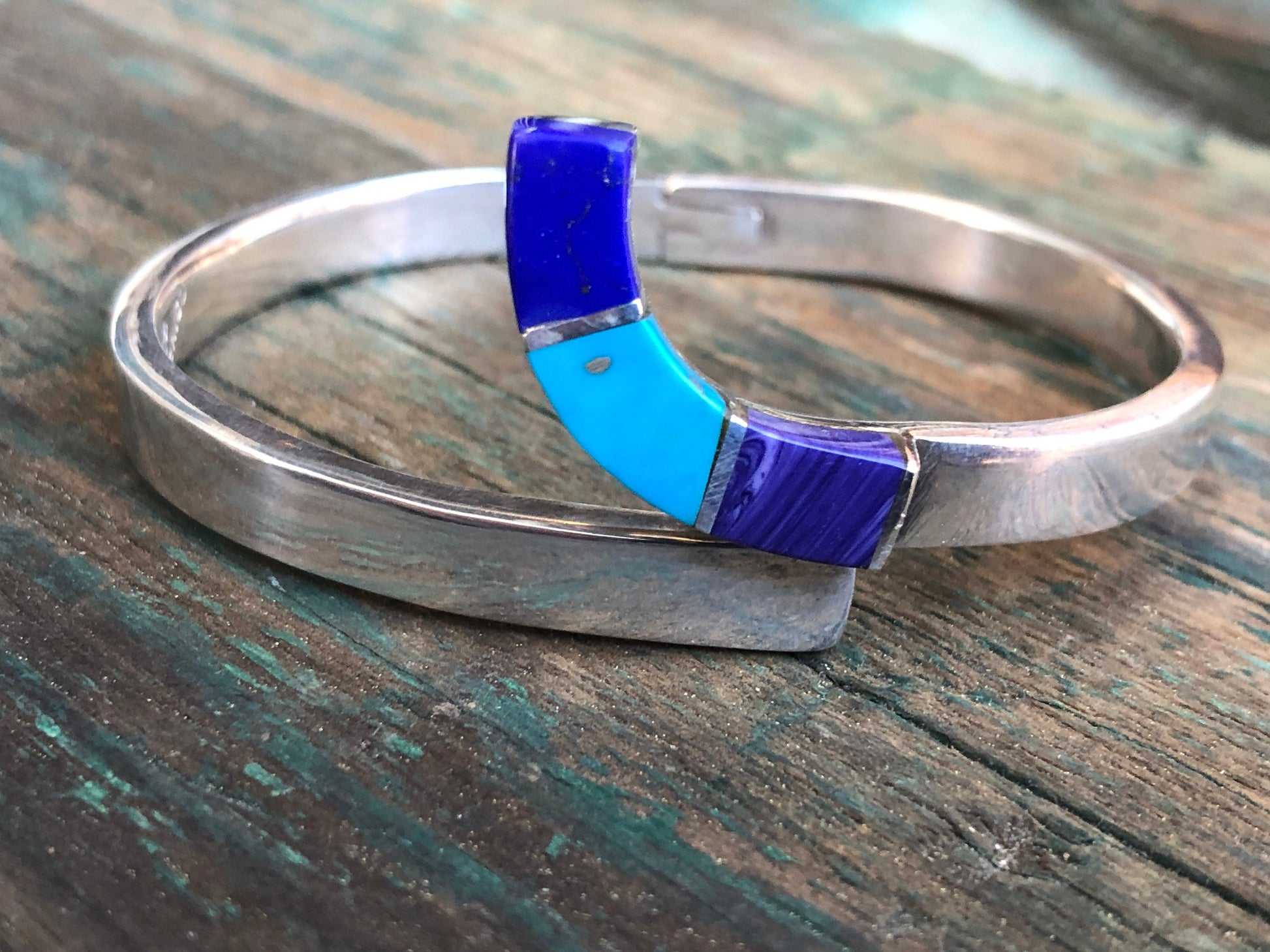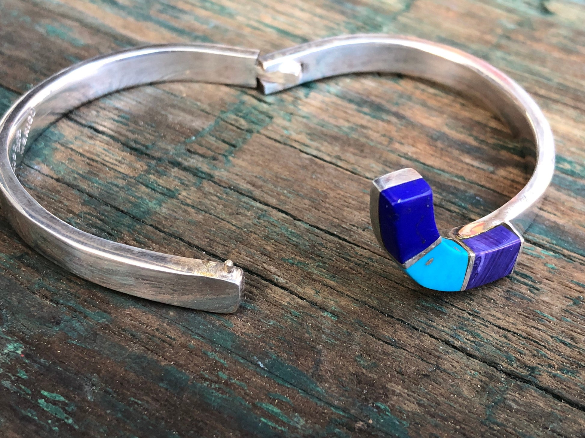 Vintage Lapis Lazuli, Turquoise & Purple Wampum Shell, Spiny Oyster Sterling Silver Hinged Native Taxco Mexican Bangle Bracelet