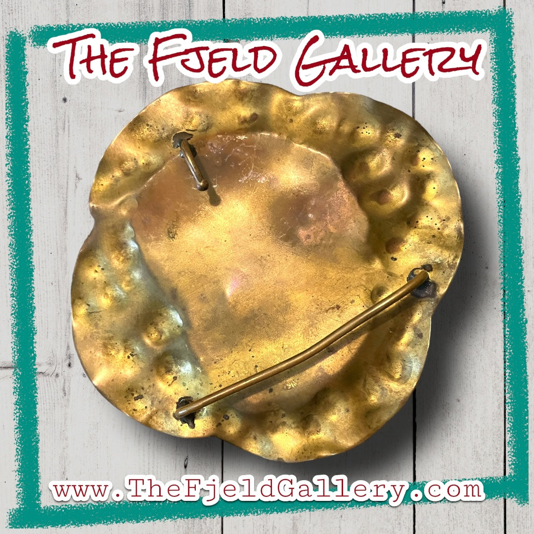 Very large 1970’s vintage barbaric / brutalist arts & crafts period hand hammered brass belt buckle with a large agate gemstone slice set in center. Fits any belt with exchangeable buckle.