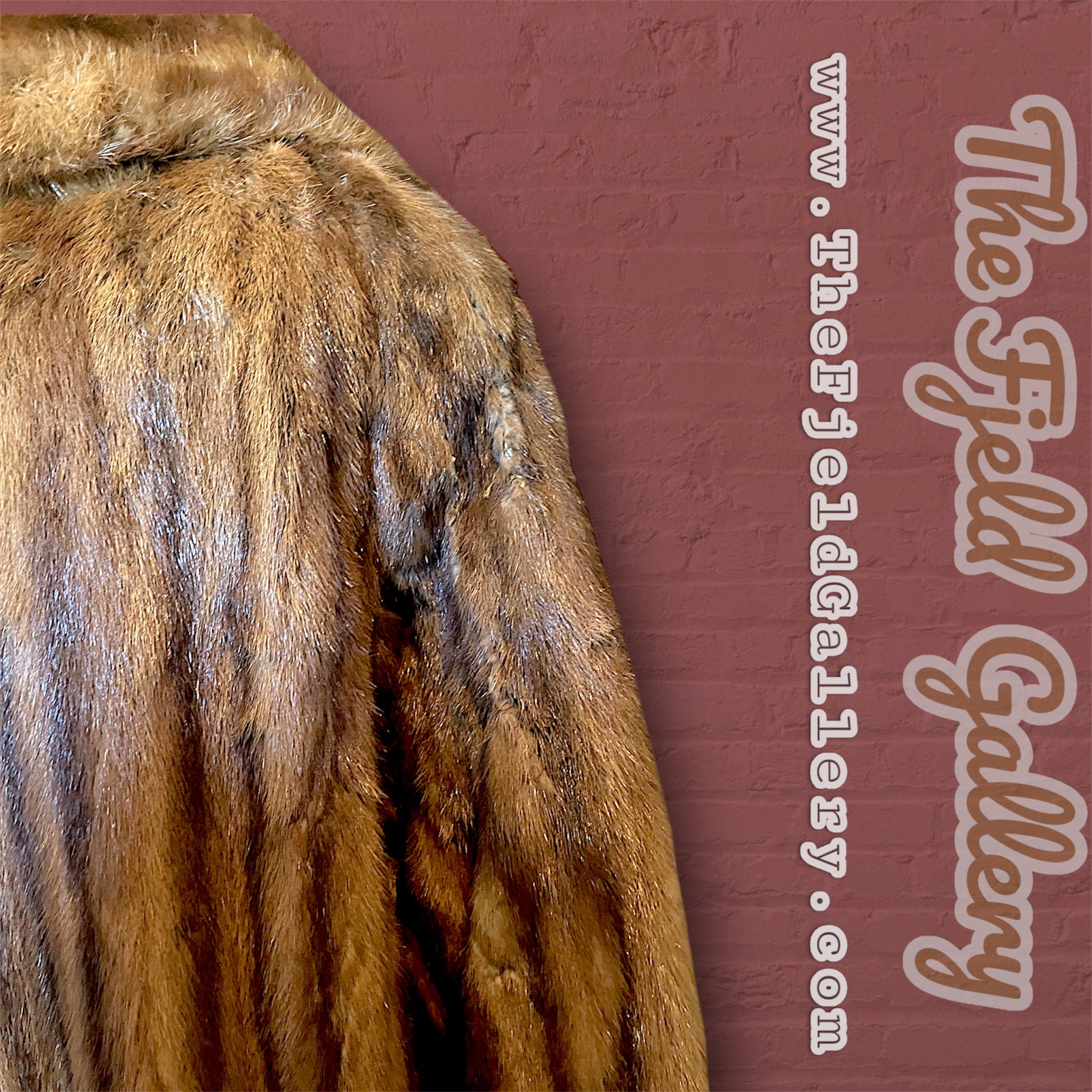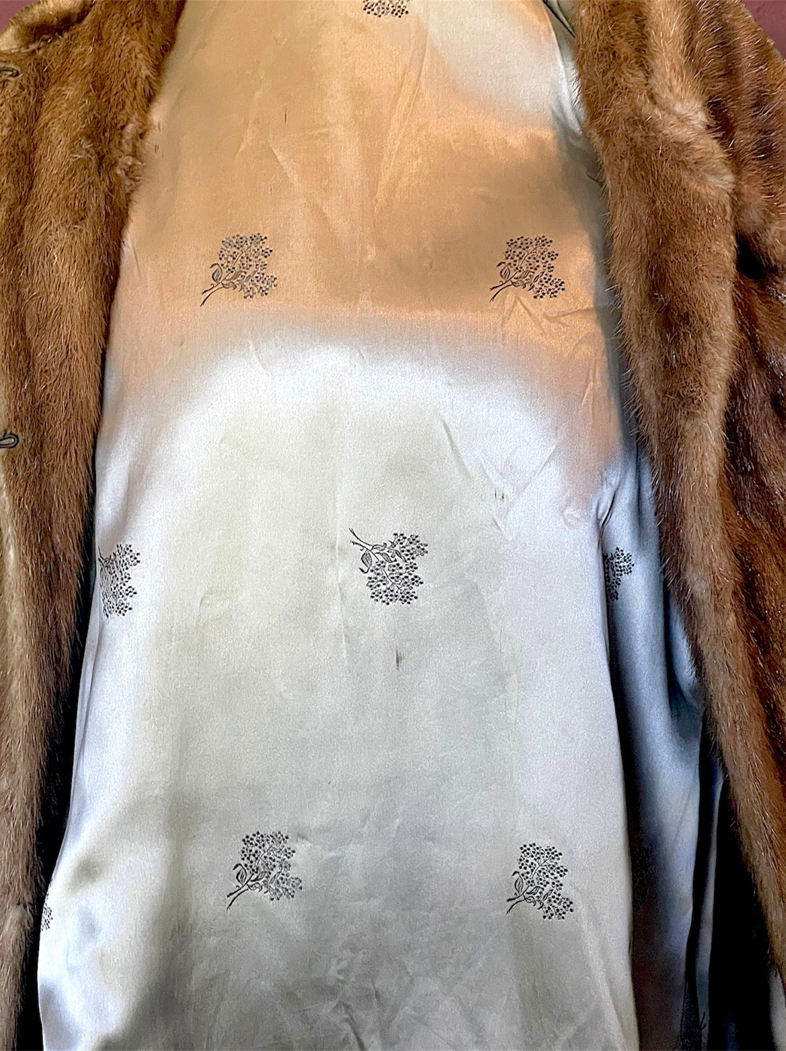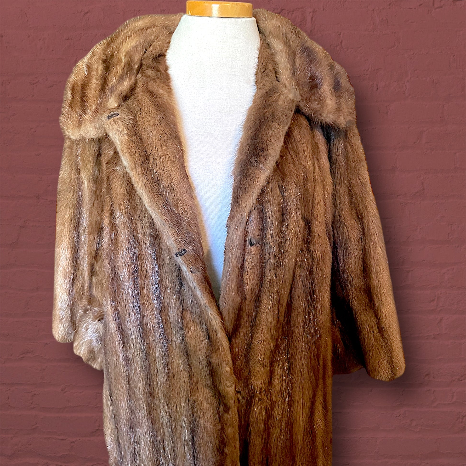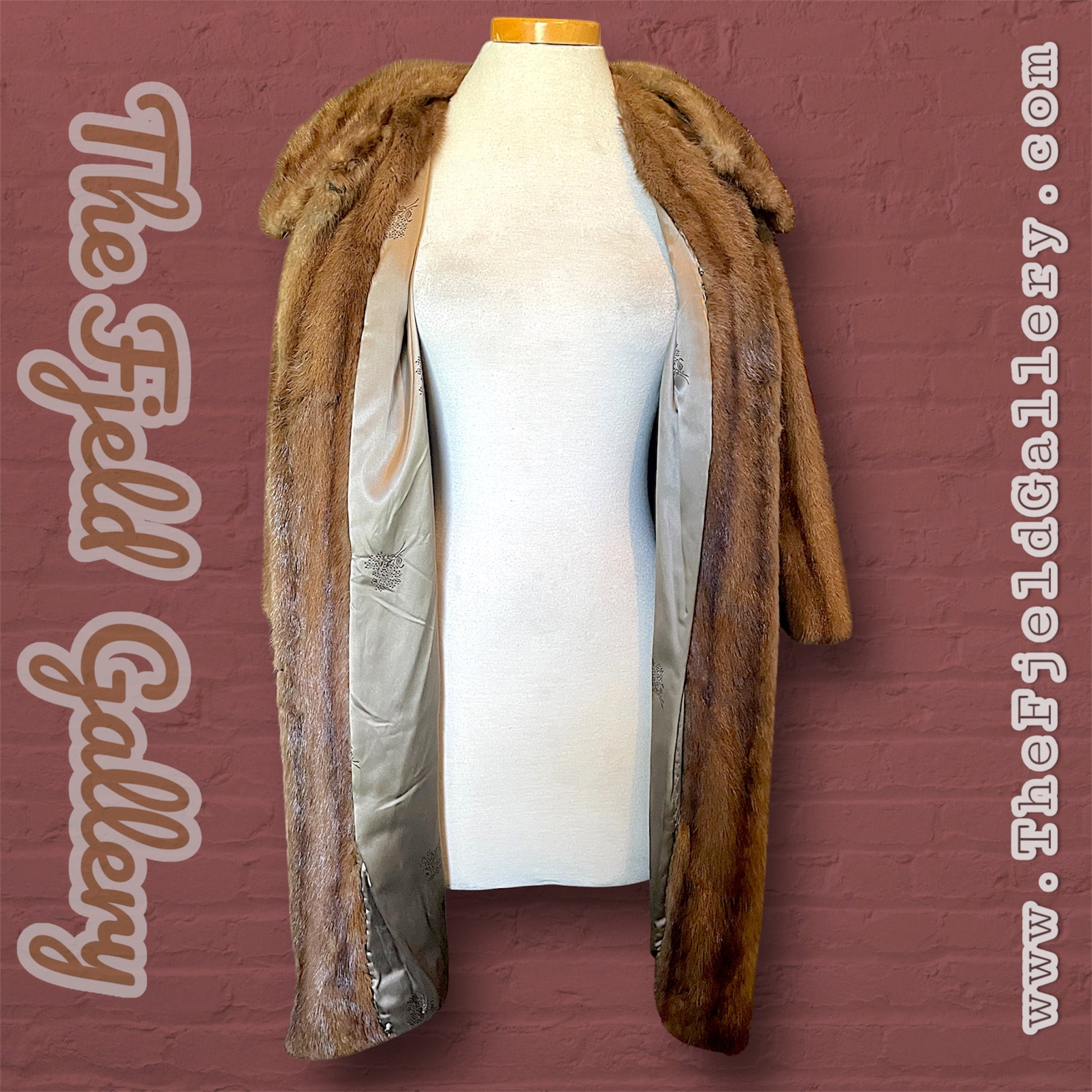 Absolutely gorgeous 1960’s shiny brown mink fur long coat!  Fully lined with a grey floral embroidered satin fabric.  3 hook & eye closures and a medium sized single collar.  Has a raglan style cut so shoulder seam measurements are approximate.  Doesn’t have any tags or labels still attached.  In really great condition, the only issue is on the right upper sleeve/under arm where there is some leather drying out that has been previously repaired.  Not visible unless inspecting closely.