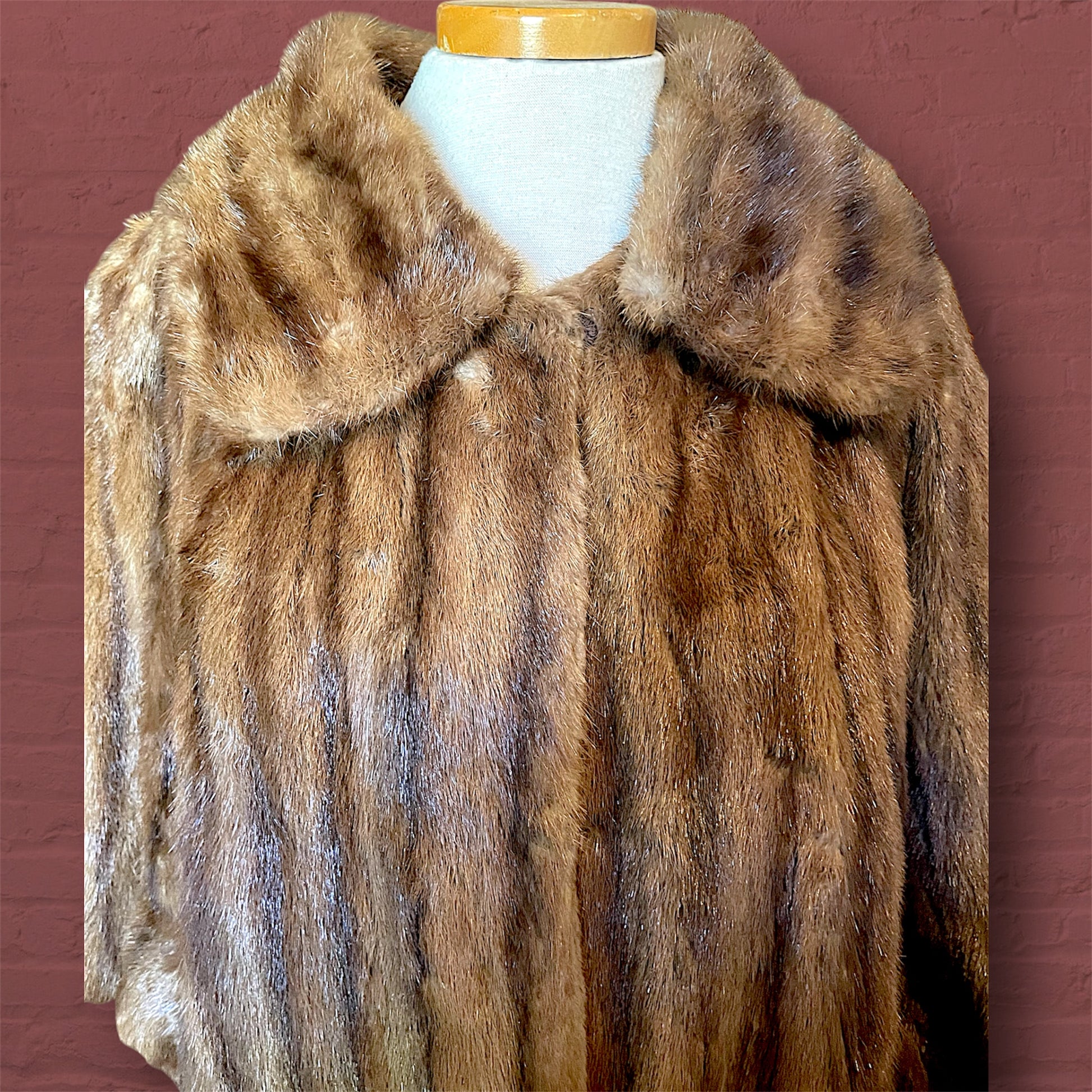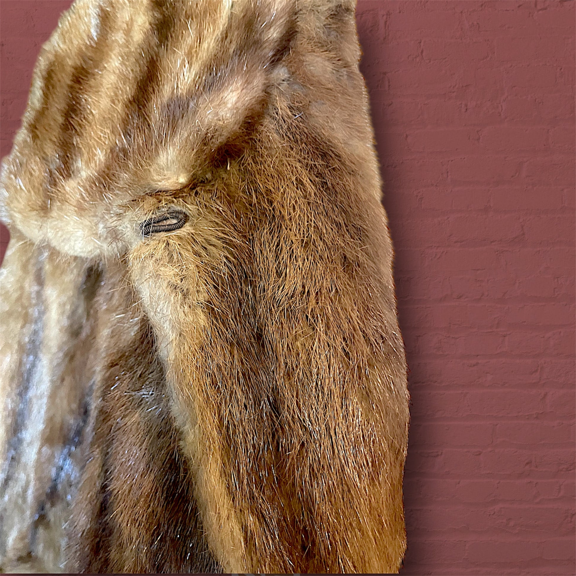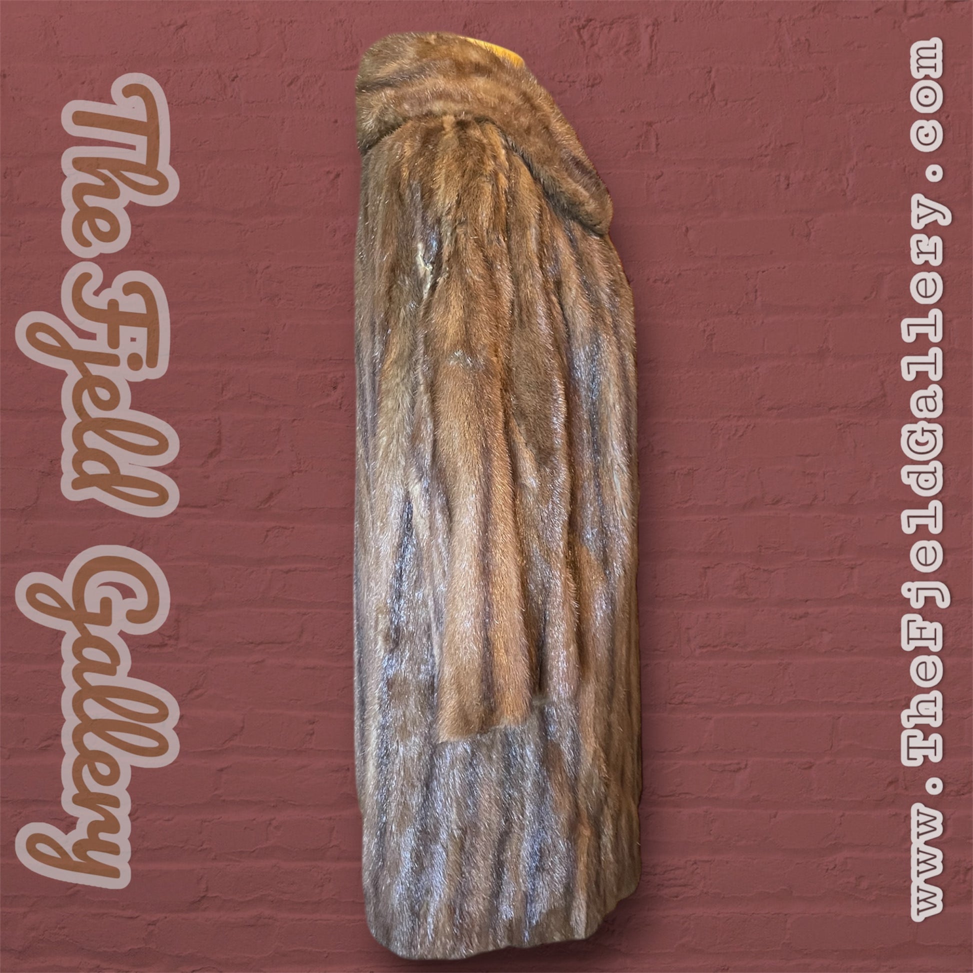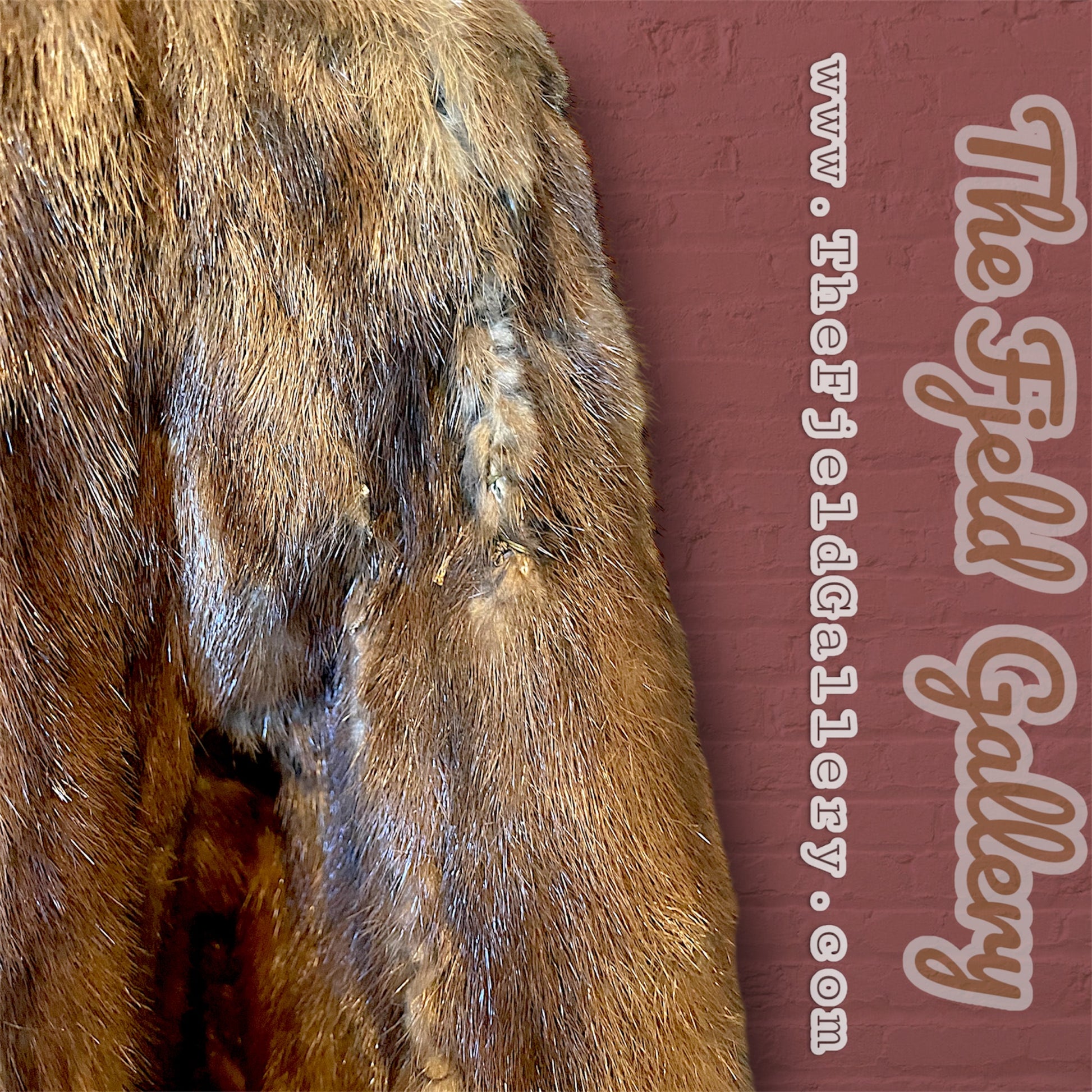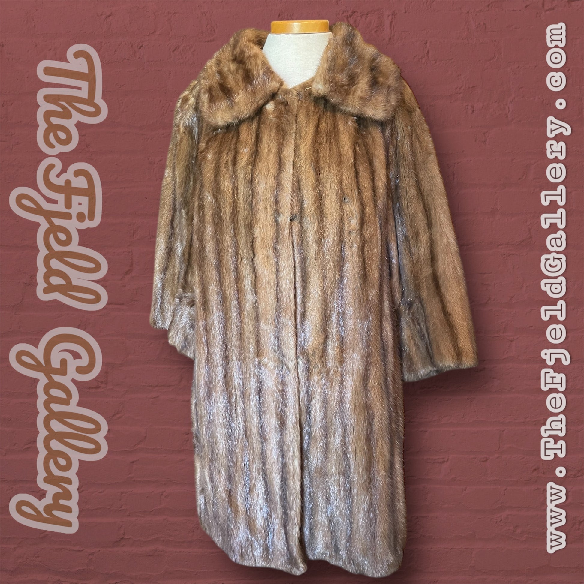 Absolutely gorgeous 1960’s shiny brown mink fur long coat!  Fully lined with a grey floral embroidered satin fabric.  3 hook & eye closures and a medium sized single collar.  Has a raglan style cut so shoulder seam measurements are approximate.  Doesn’t have any tags or labels still attached.  In really great condition, the only issue is on the right upper sleeve/under arm where there is some leather drying out that has been previously repaired.  Not visible unless inspecting closely.