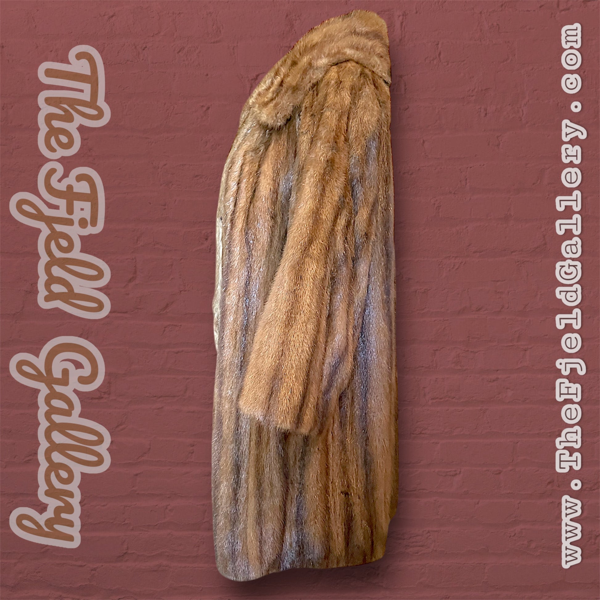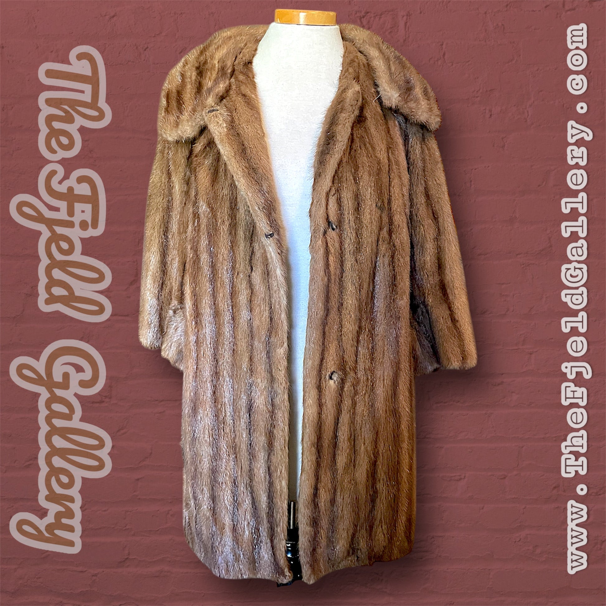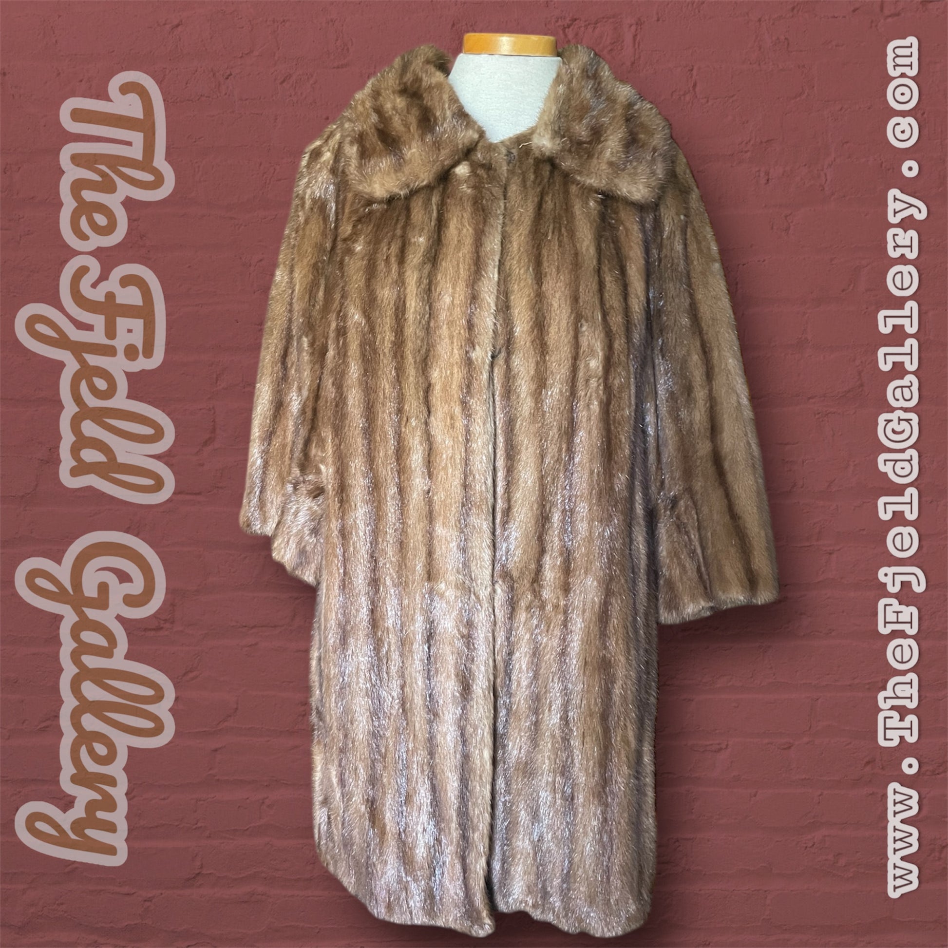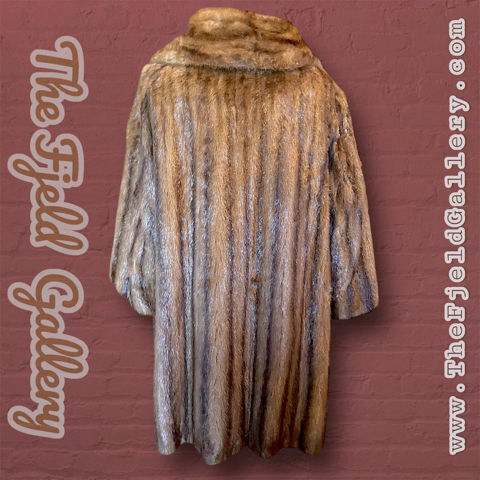 Absolutely gorgeous 1960’s shiny brown mink fur long coat!  Fully lined with a grey floral embroidered satin fabric.  3 hook & eye closures and a medium sized single collar.  Has a raglan style cut so shoulder seam measurements are approximate.  Doesn’t have any tags or labels still attached.  In really great condition, the only issue is on the right upper sleeve/under arm where there is some leather drying out that has been previously repaired.  Not visible unless inspecting closely.