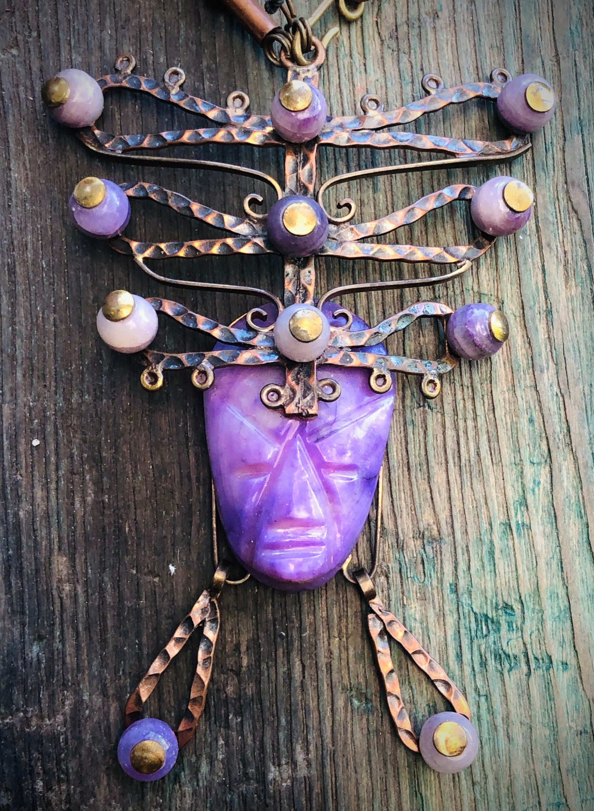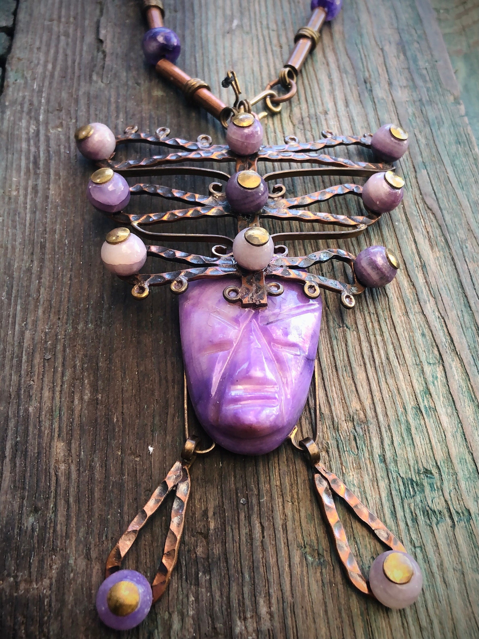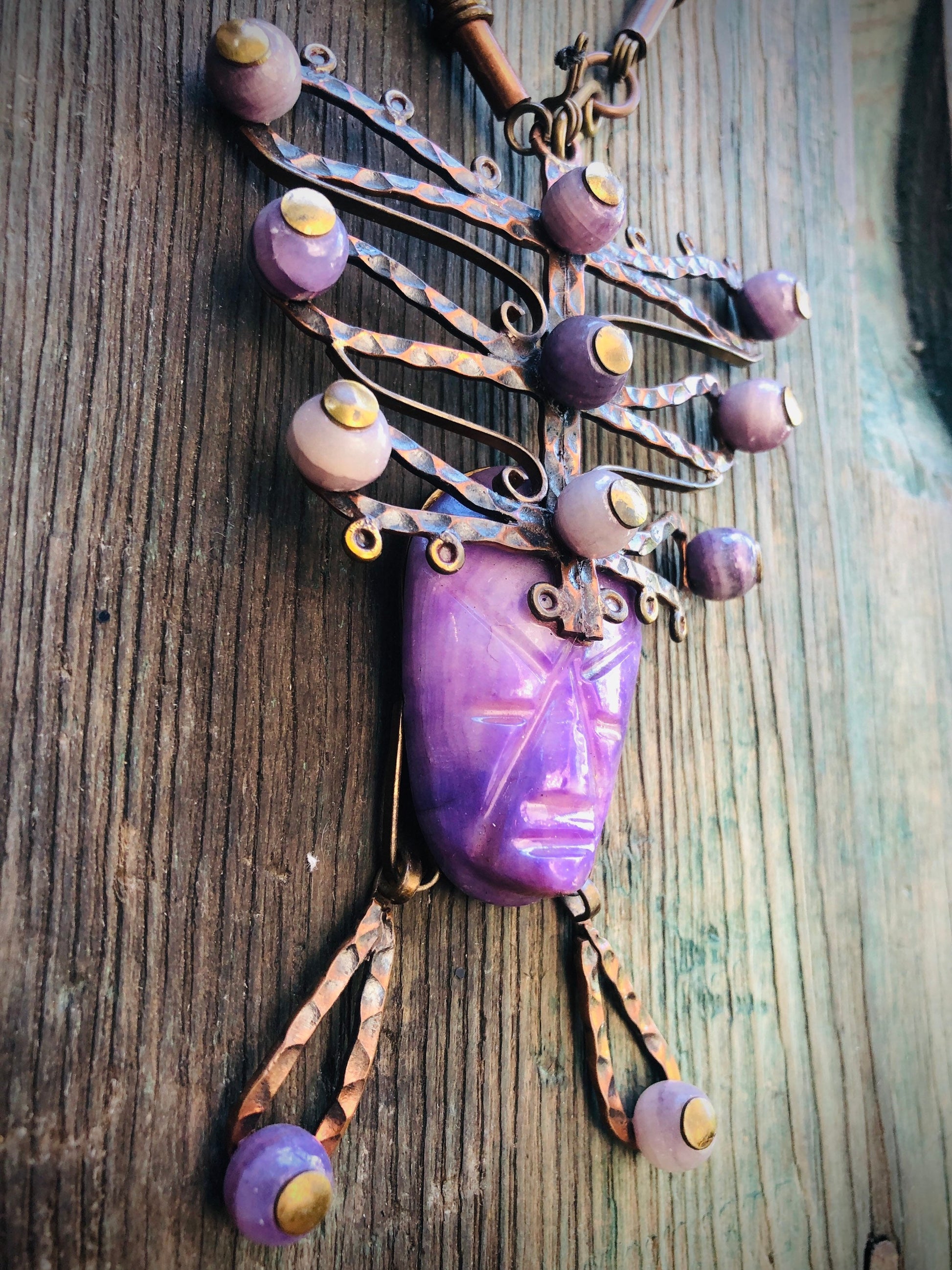Vintage Mexican Copper & Brass Purple Agate Carved Stone Face Mask & Bead Mixed Metal Necklace