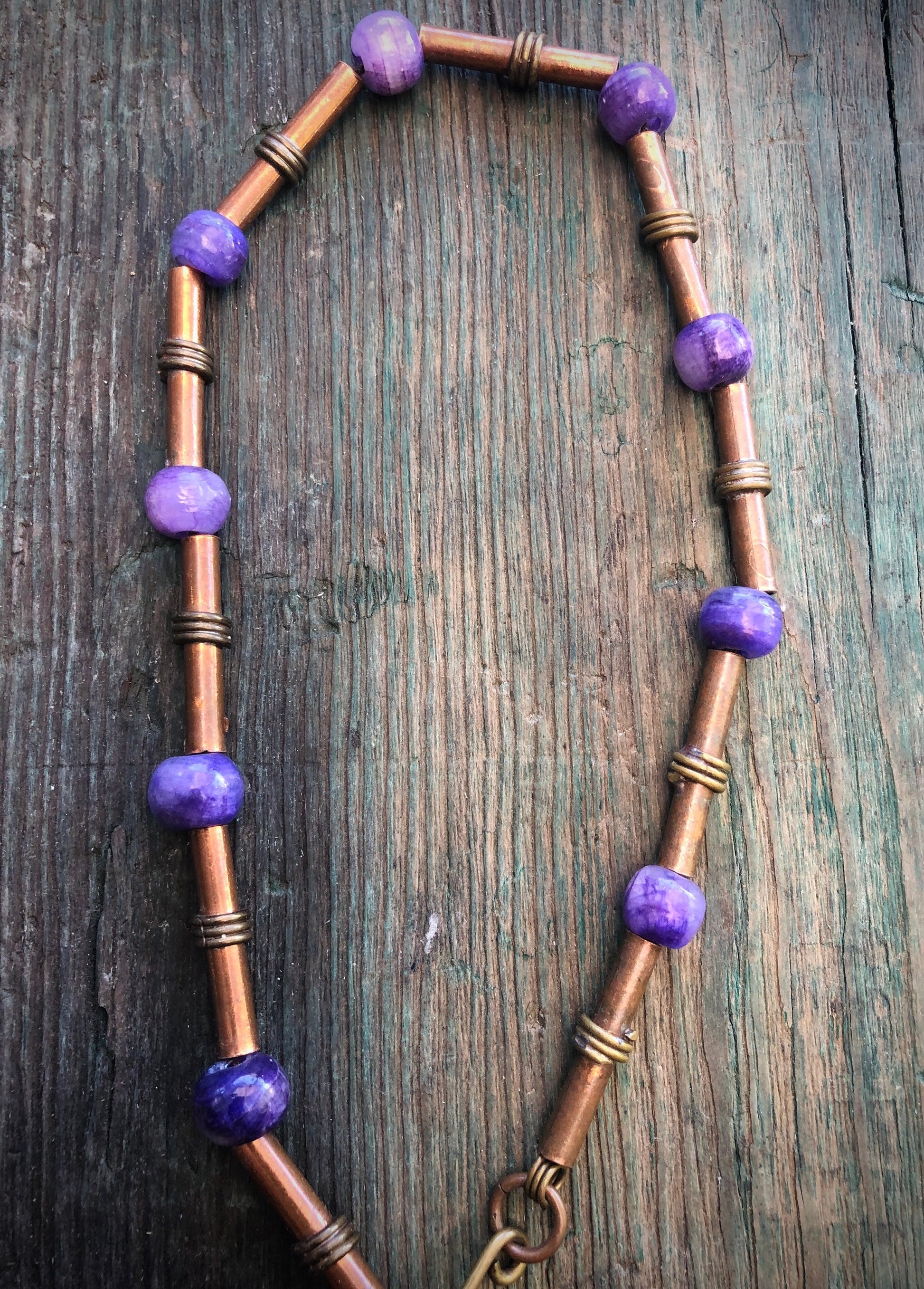 Vintage Mexican Copper & Brass Purple Agate Carved Stone Face & Bead Mixed Metal Necklace