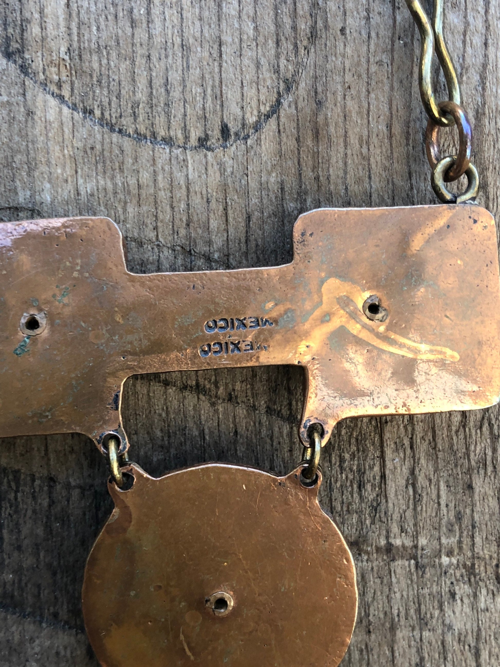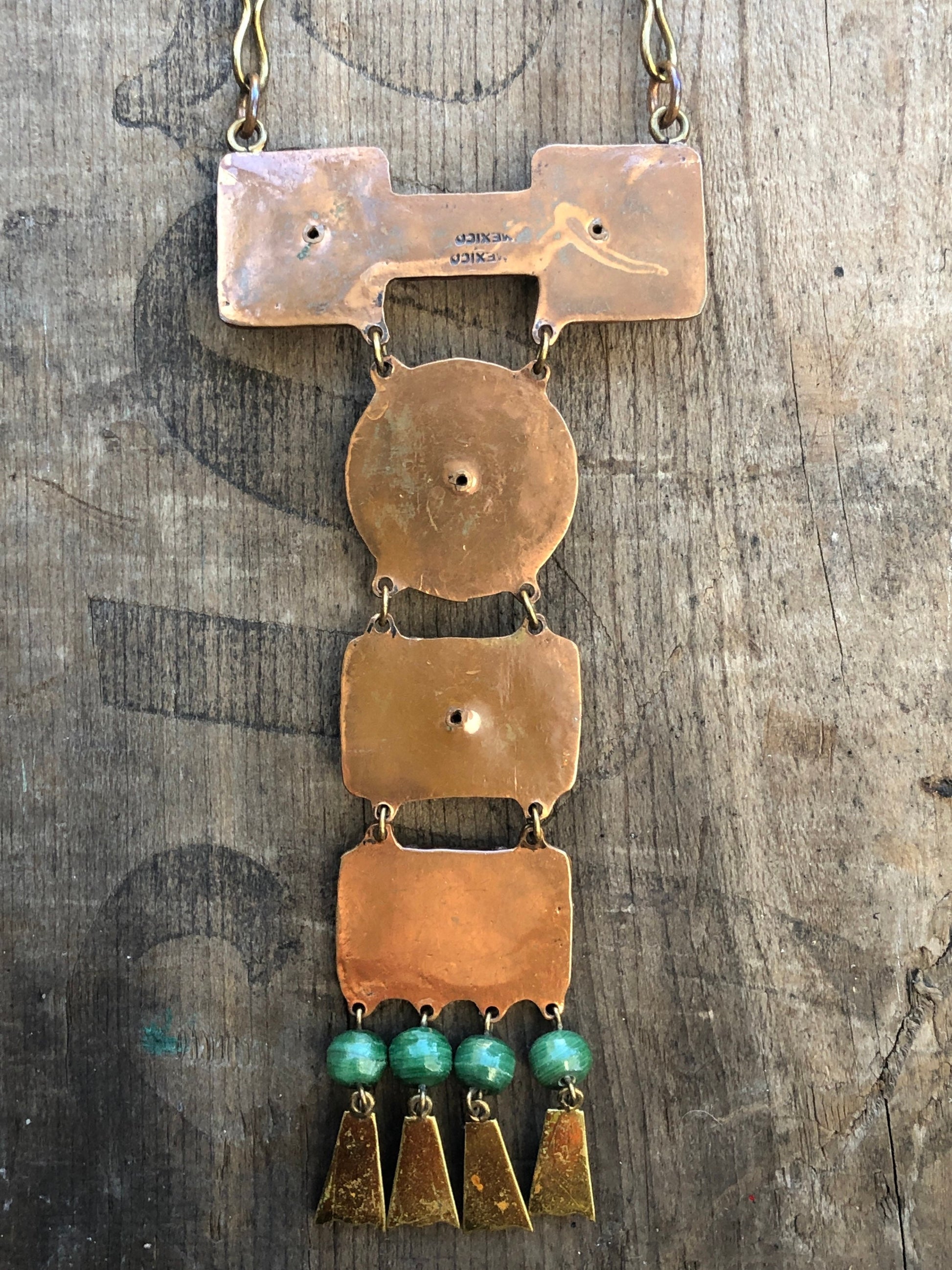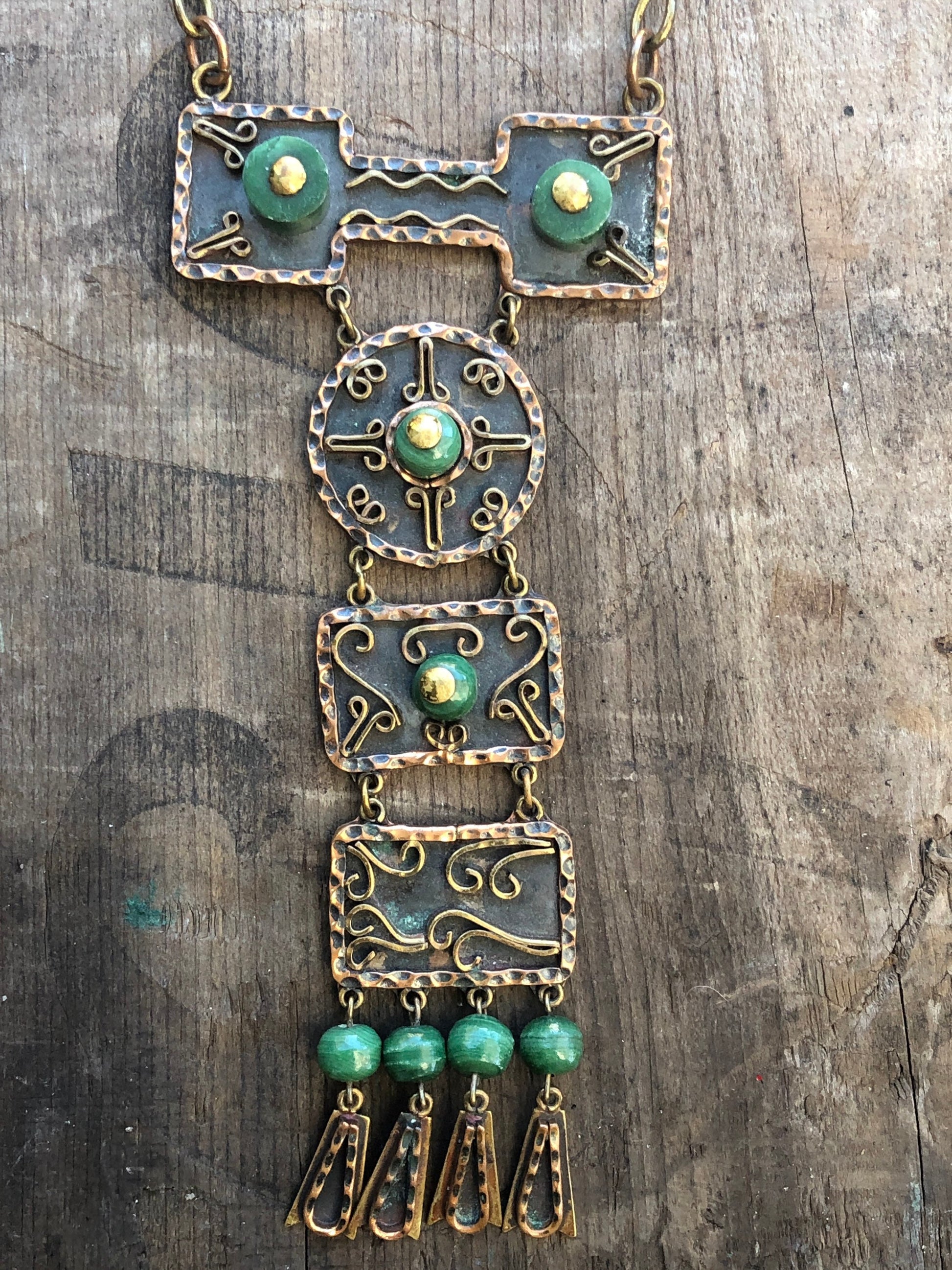 Vintage Mexican Mixed Metal Copper & Brass with Green Jade Agate Gemstone Necklace