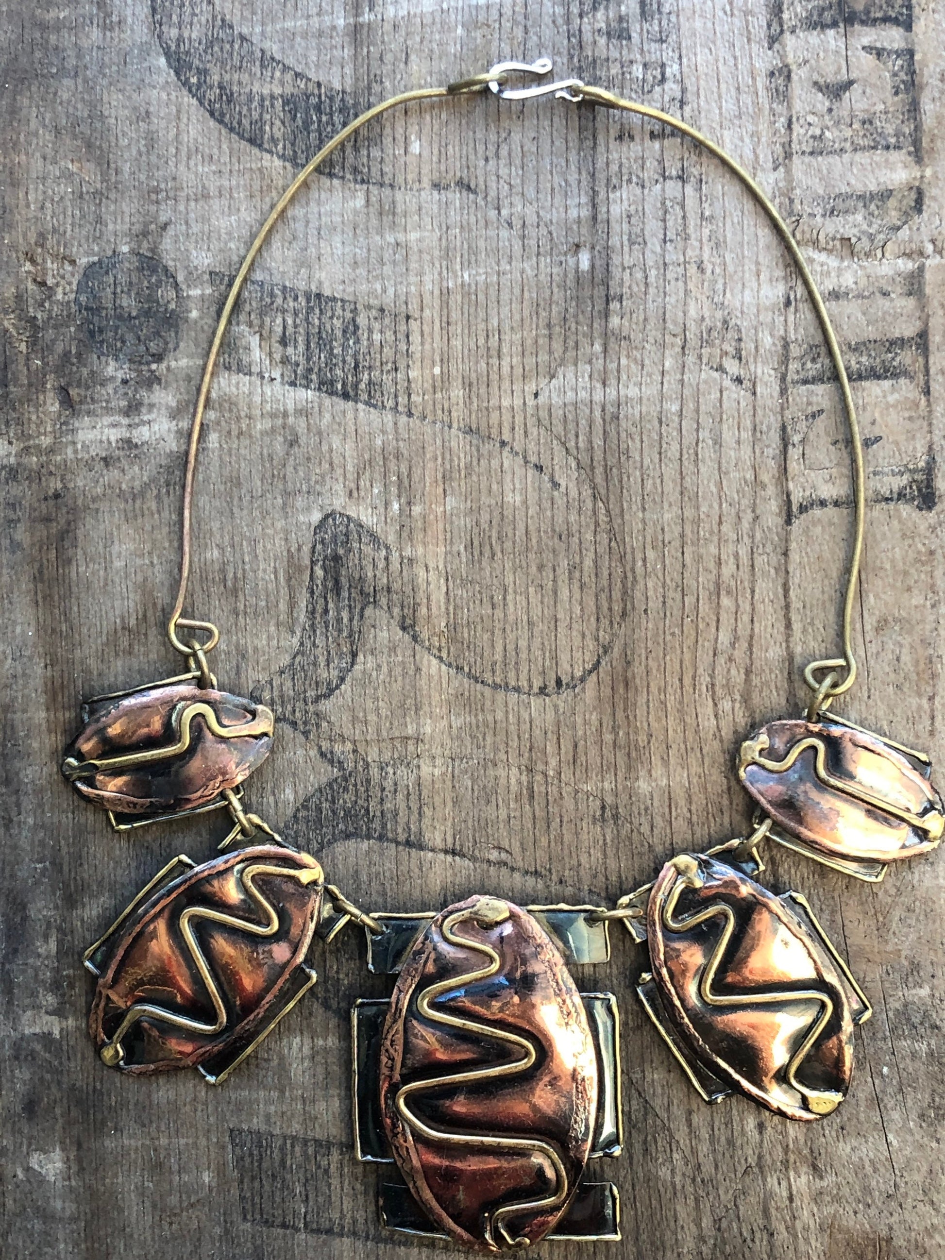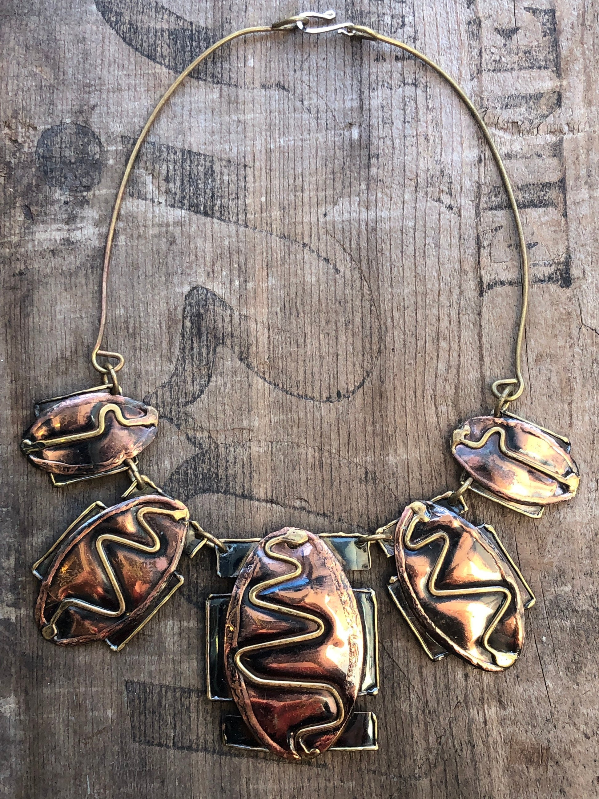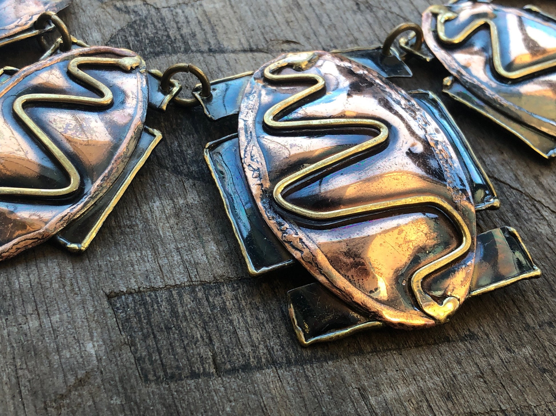 Vintage Mixed Metal Barbaric Arts & Crafts Copper, Brass and Silver Snake Necklace