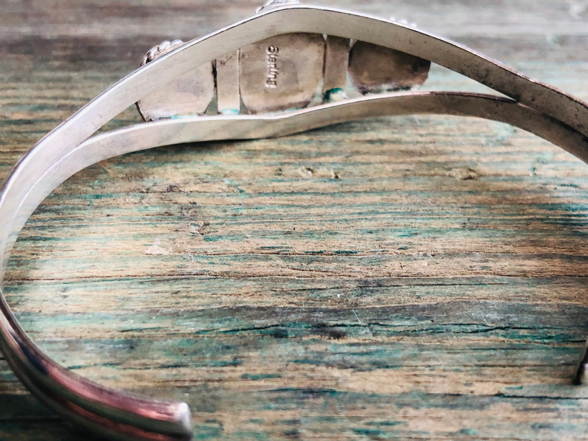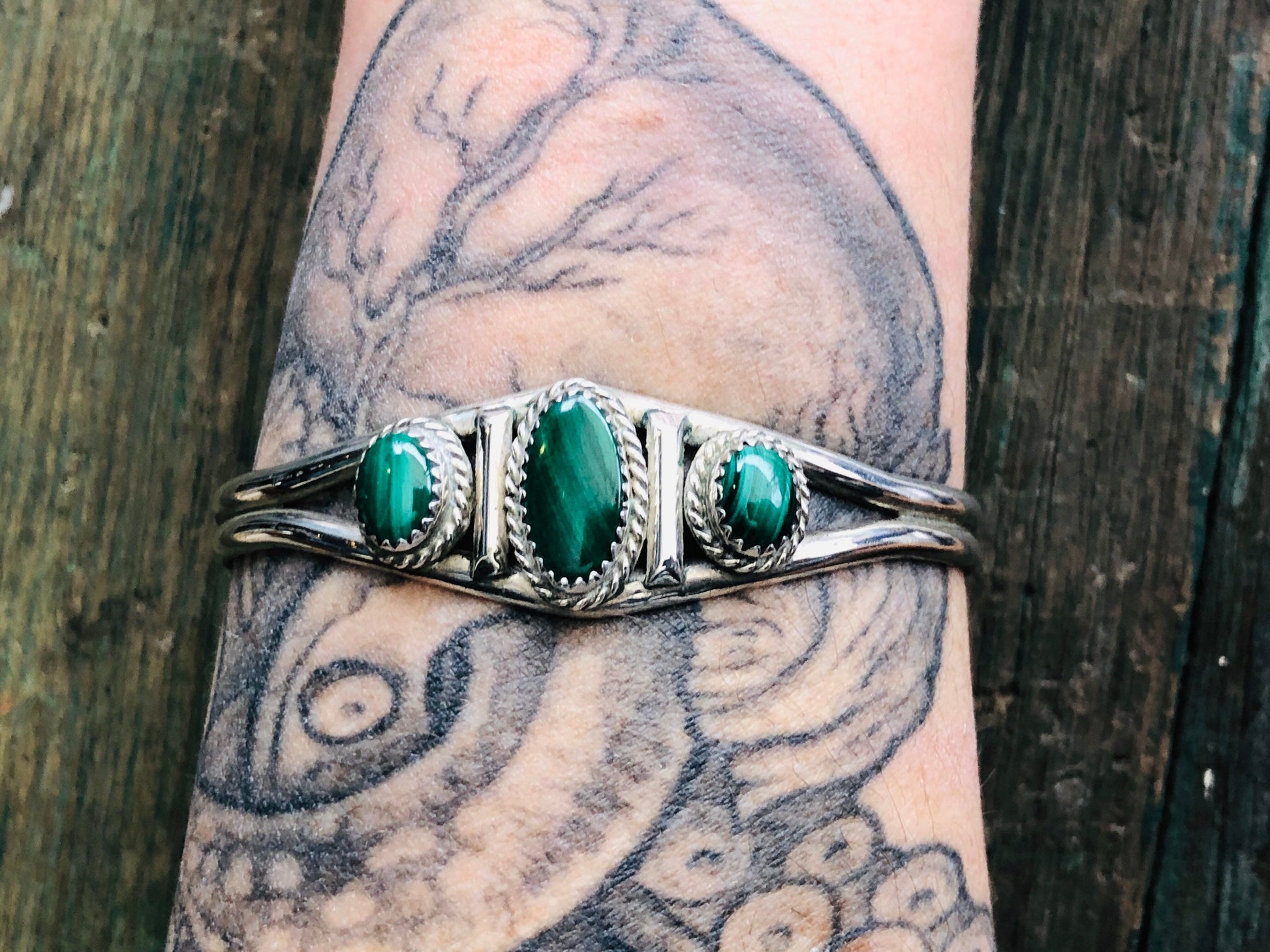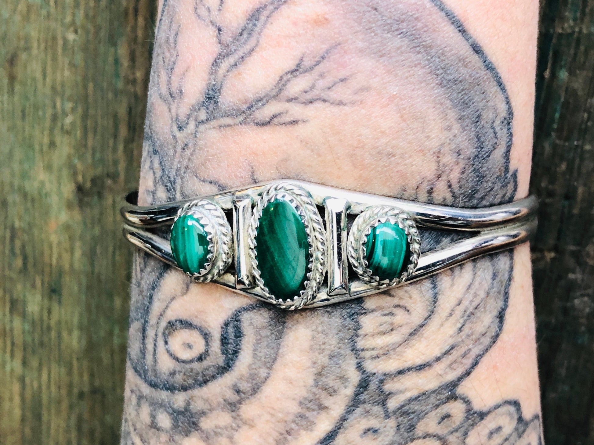 Vintage Native American 3 Green Malachite Gemstone Sterling Silver Cuff Bracelet