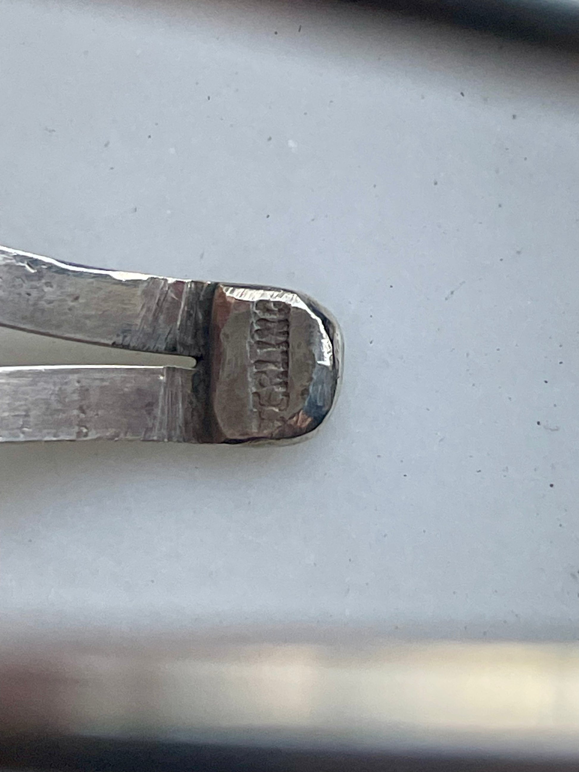 Beautiful bezel set oval sleeping beauty turquoise gemstone cabochon in a serrated bezel surrounded by twisted wire detailing as well as a very delicately hand stamped wide half round sterling wire.  Two half round wires create the cuff base and are reinforced at both ends on the back and stamped on both ends as well as the back of the cabochon setting. Native American Southwest Cuff Bracelet c.1940. Hallmarked “Sterling” on cabochon back and one end of cuff and Hallmarked by well known Navajo artist Darlene C. Thomas “D.C. Thomas” on the other end.