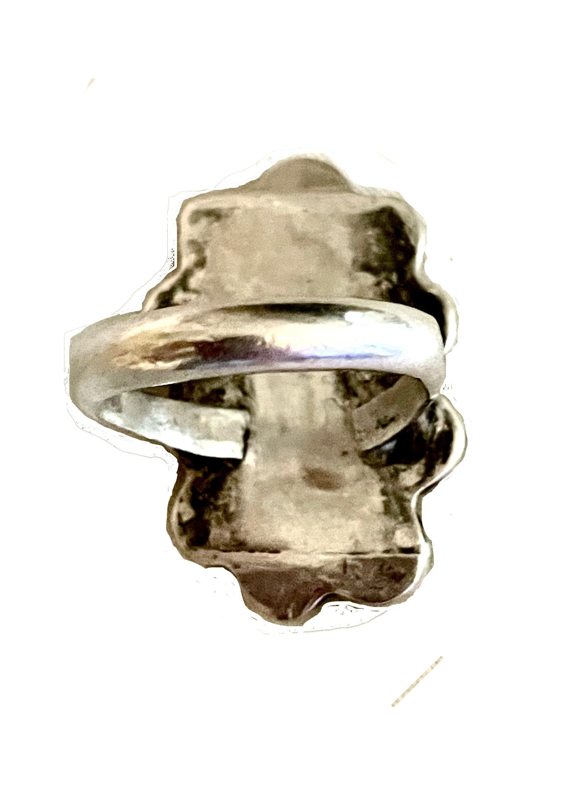 Vintage Native American Turquoise Sterling Silver Ring. Large and beautiful natural turquoise gemstone bezel set with a flower petal design around the outside.
