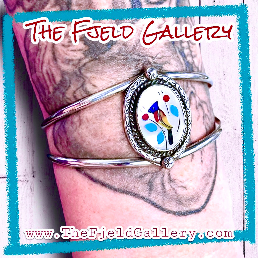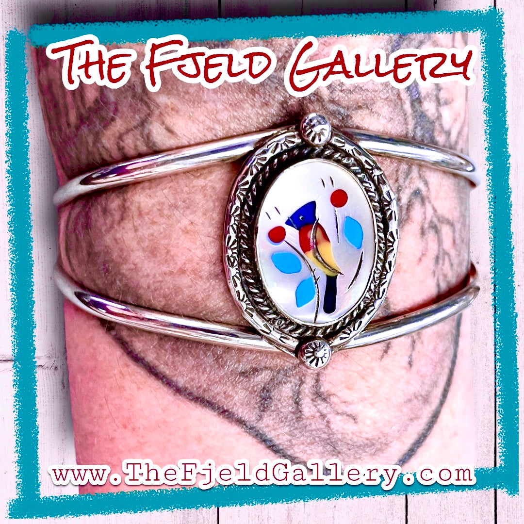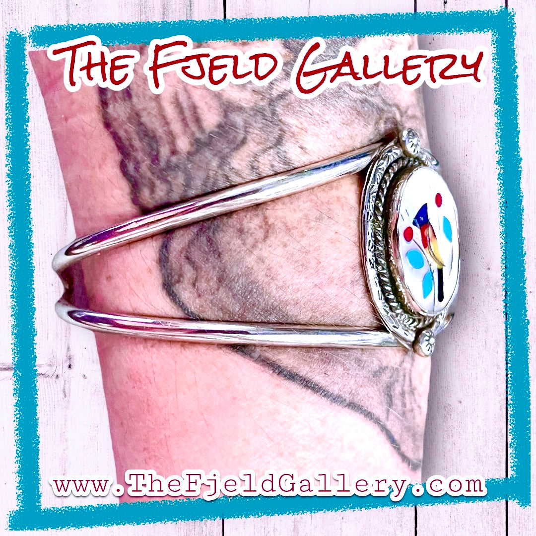 Vintage Native American Zuni Red, Yellow & Blue Bird Sterling Cuff Bracelet