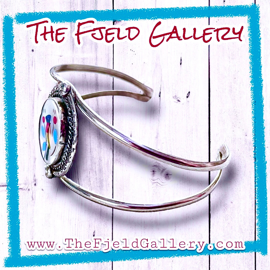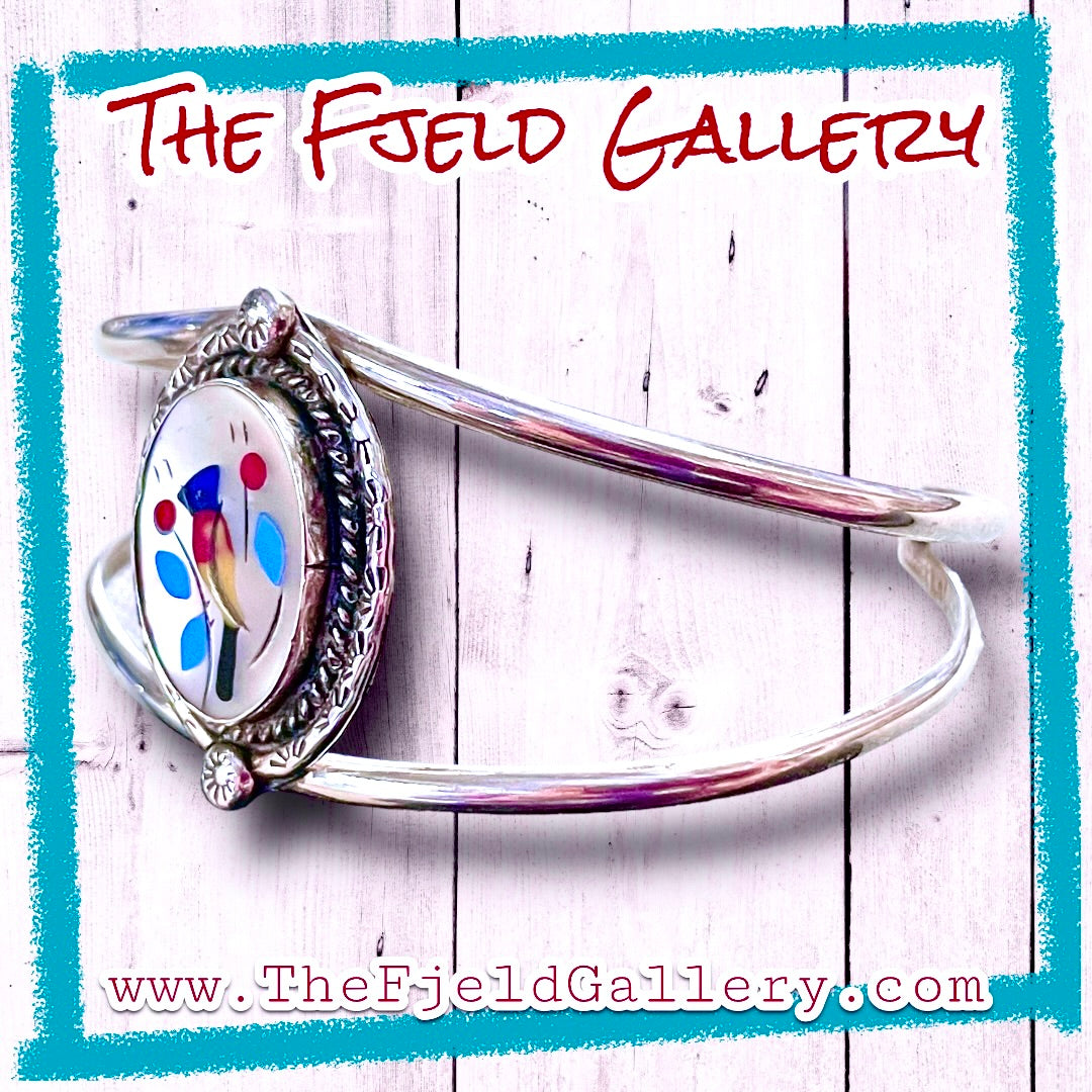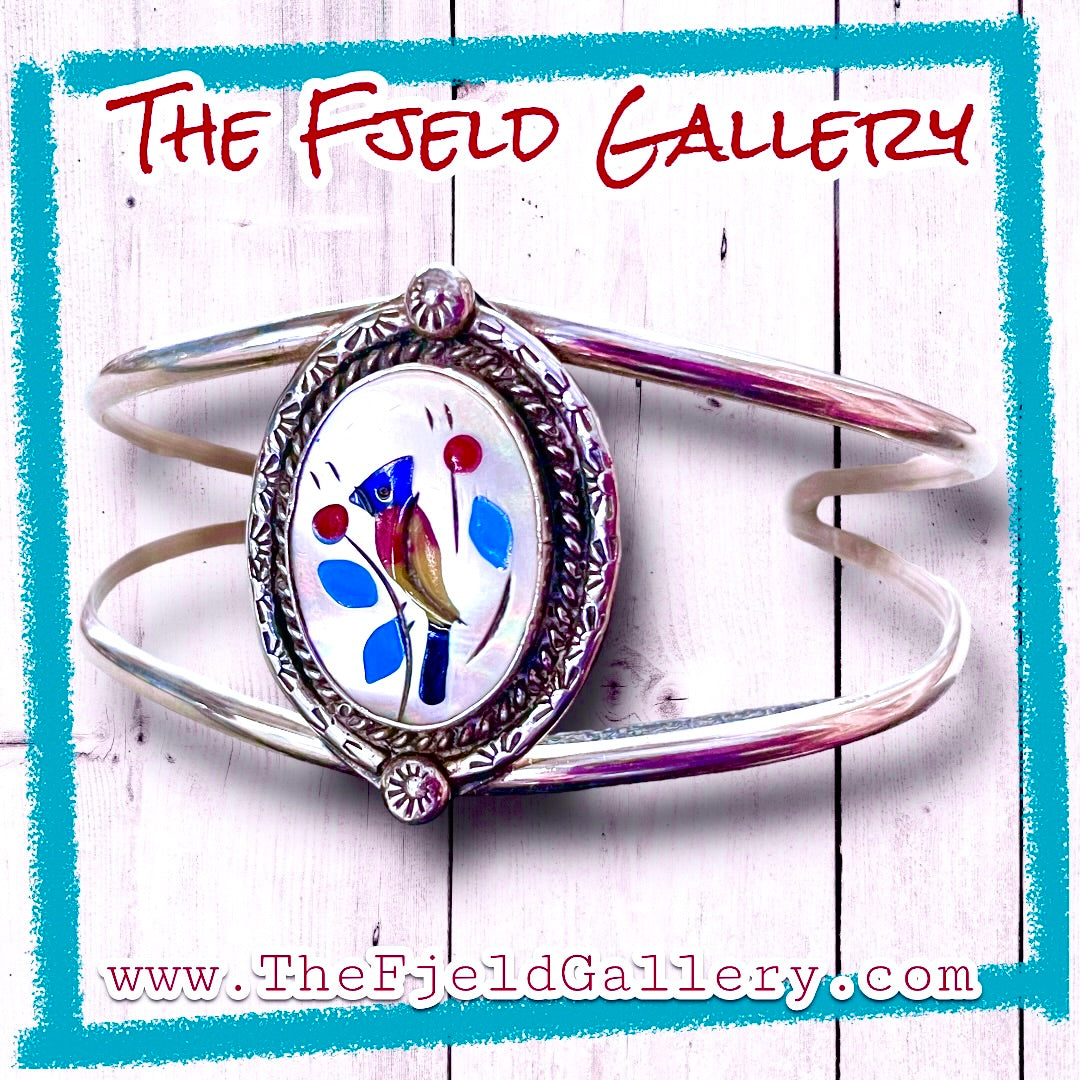 Vintage Native American Zuni Red, Yellow & Blue Bird Sterling Cuff Bracelet