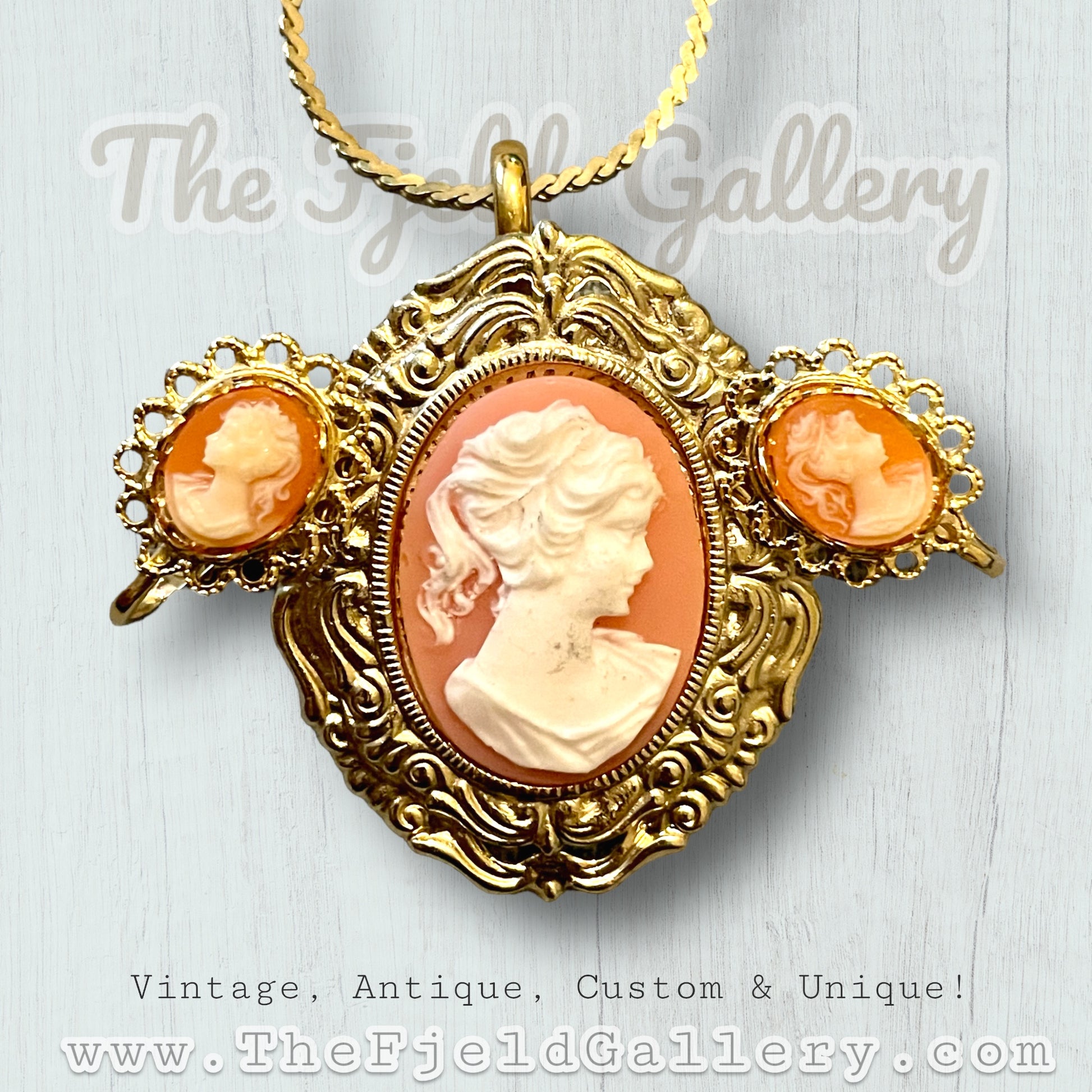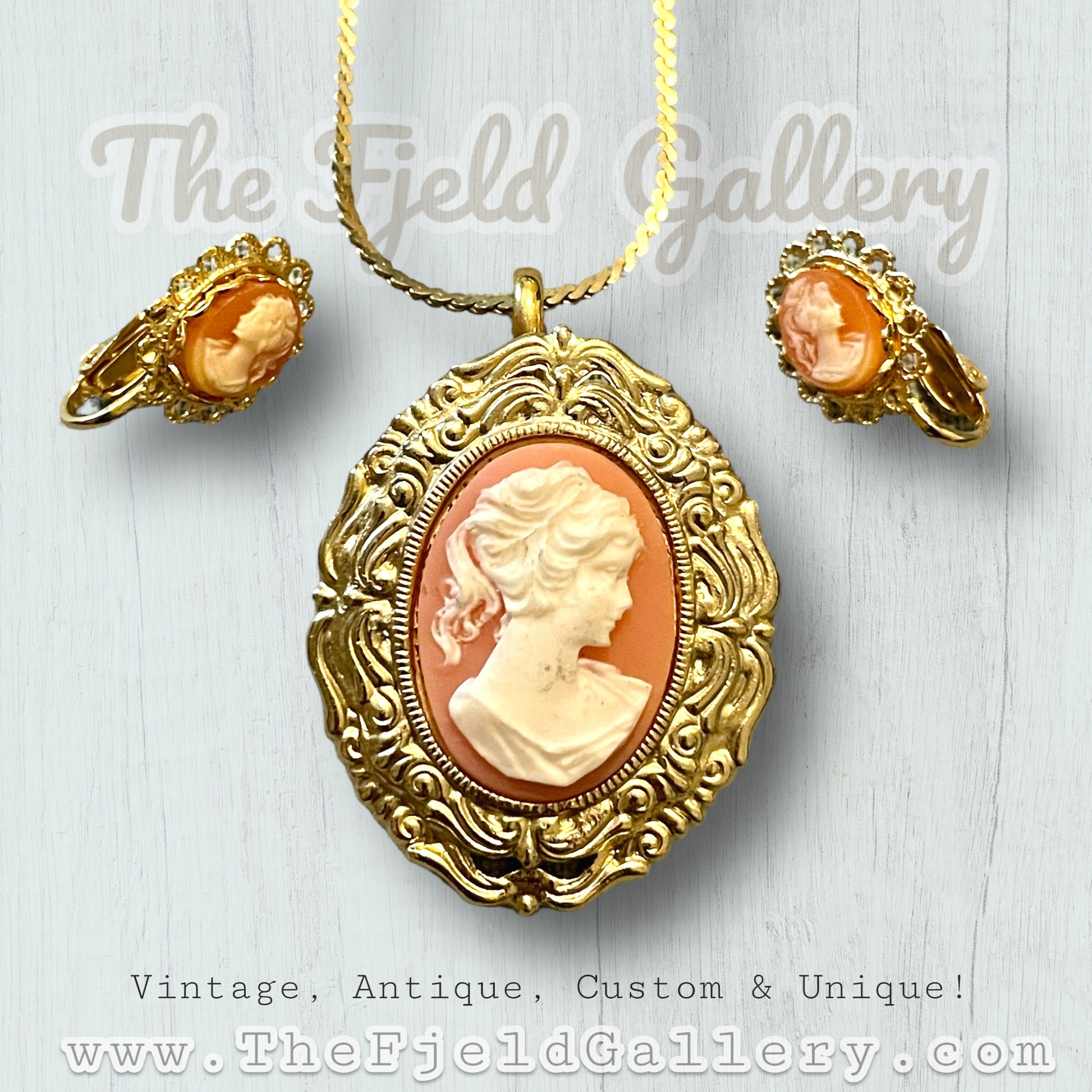 Vintage 1960’s orange & cream molded celluloid cameo necklace & earring set. Gold plated setting with gold chain necklace. Spring ring closure on necklace and clip on earring backs.