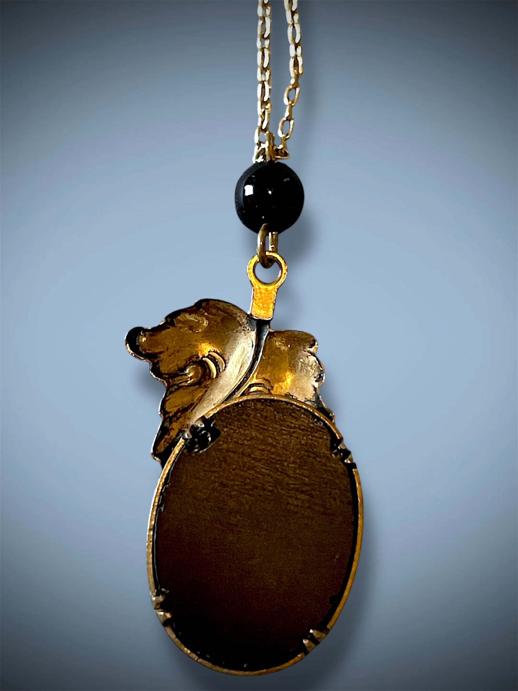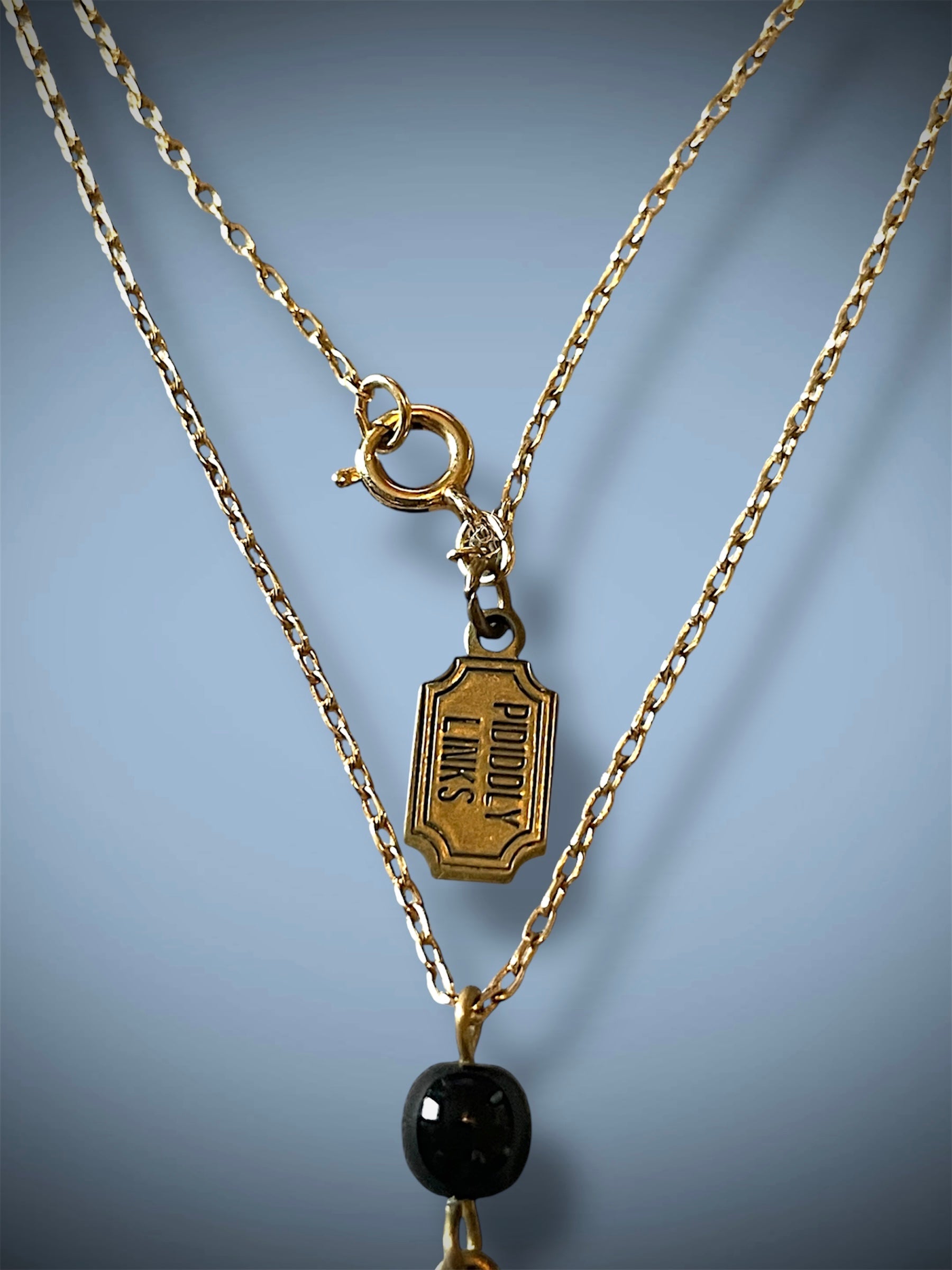 Beautiful and delicate black art glass mourning cameo bezel set in a brass setting with leaf design details on a delicate brass chain with a black glass bead above the cameo. Hallmark tag “Pididdly Links” on front and Kingston NY on back, a very collectible brand. Secure spring ring closure and a delicate link chain.